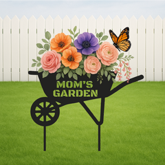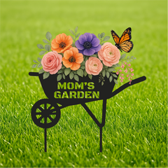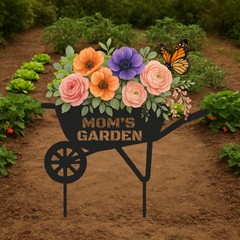 Celebrate the beauty of growth and the warmth of family with the Bloom Cart, a delightful custom garden sign shaped like a floral-filled wheelbarrow. Bursting with lifelike roses, poppies, and delicate wildflowers, it also includes a playful monarch butterfly accent to complete the scene.