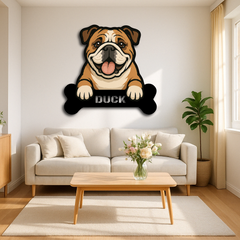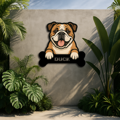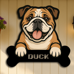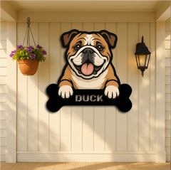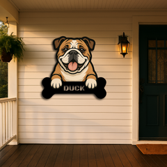 Add personality and charm to your home with this Custom Bulldog Metal Sign, featuring an adorable smiling bulldog and a bone-shaped plaque personalized with your pup's name. This bold and playful design is perfect for dog lovers looking to celebrate their loyal companion in style.