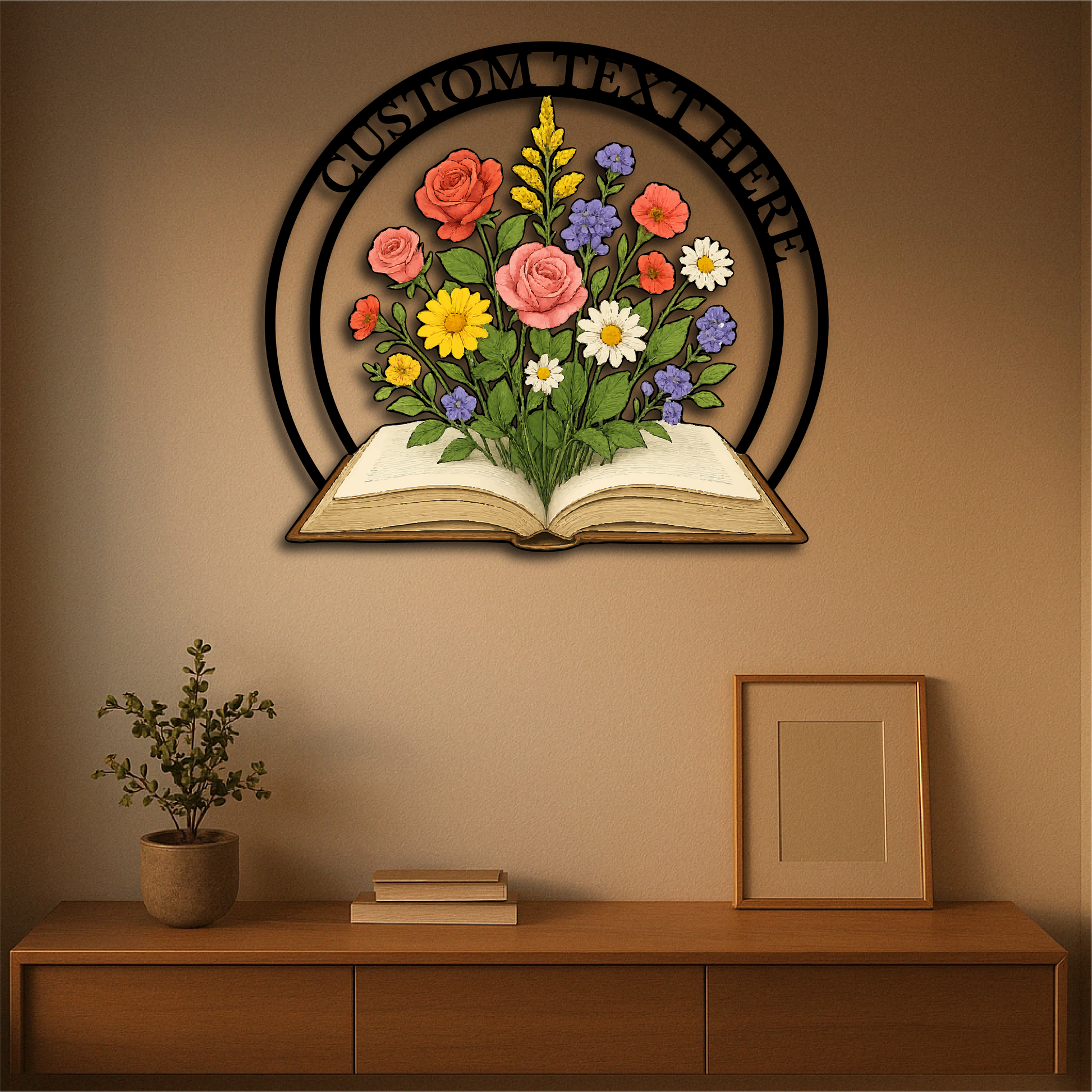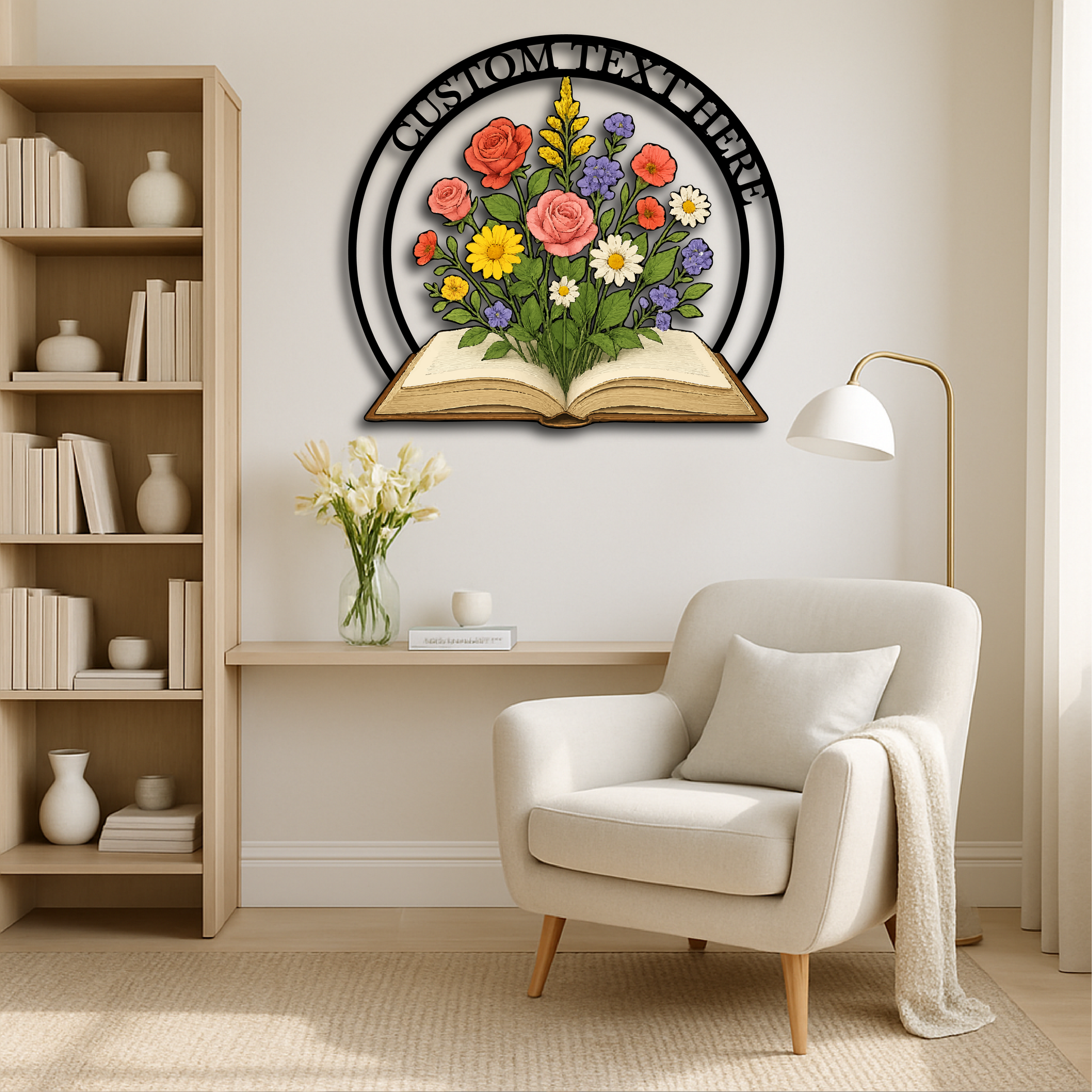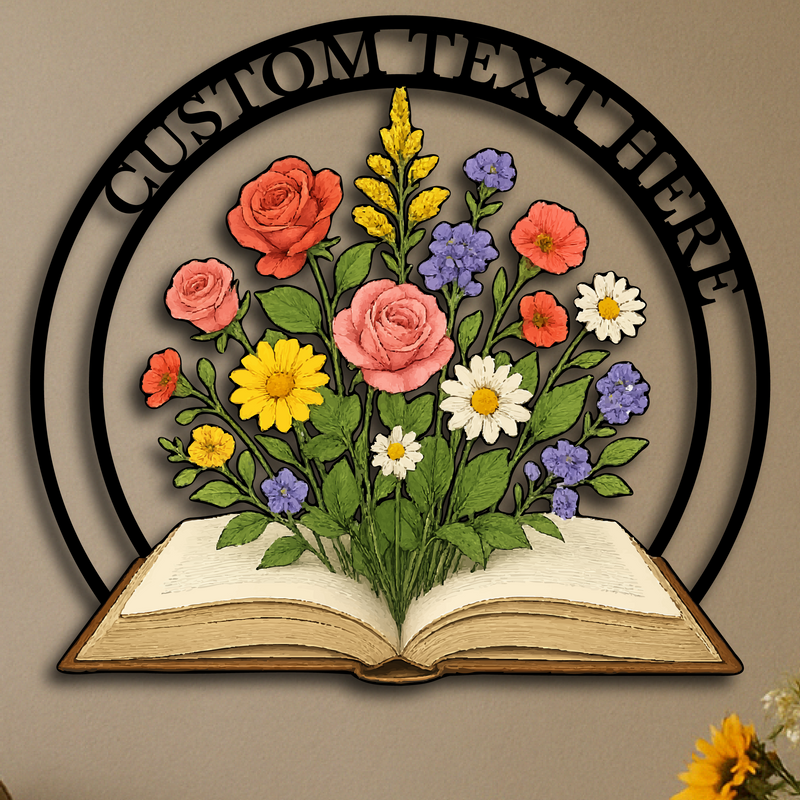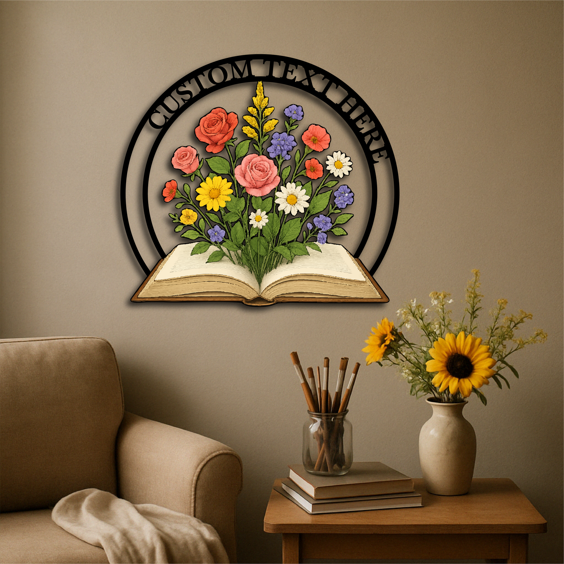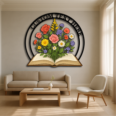 Custom Floral Book Wall Sign – Personalized Metal Art with Blooming Flowers & Text