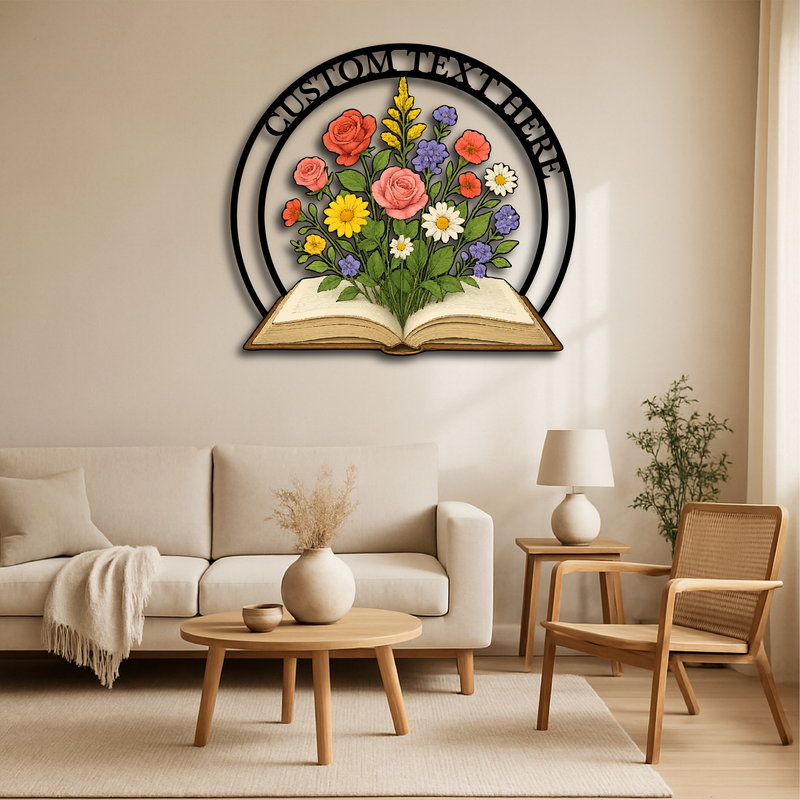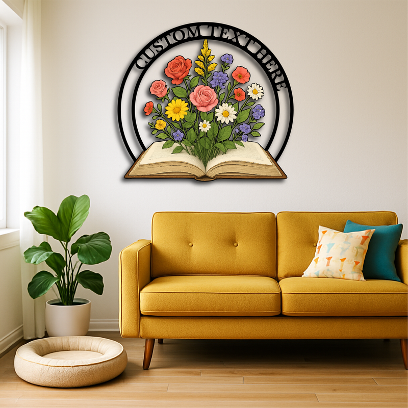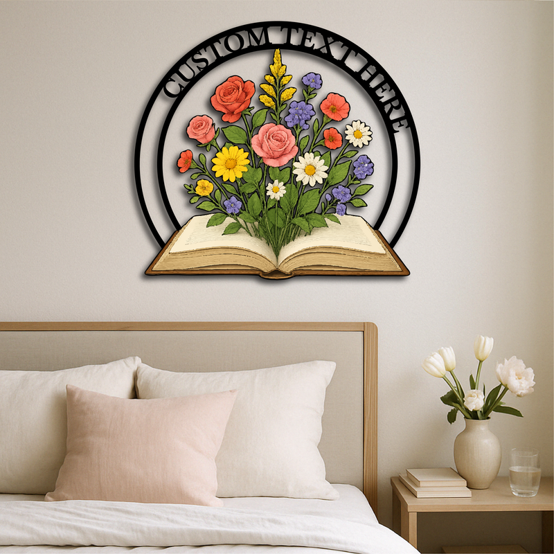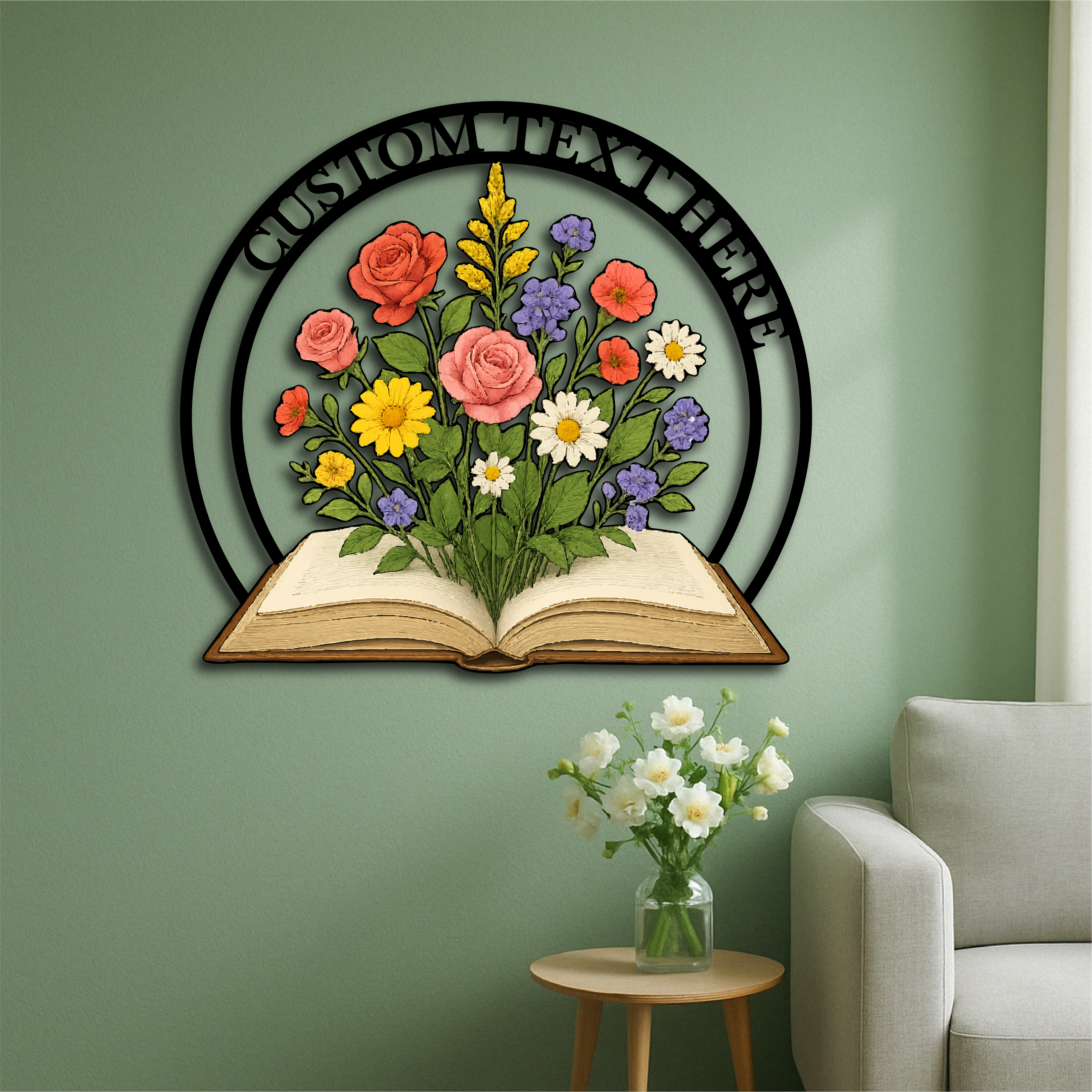 Custom Floral Book Wall Sign – Personalized Metal Art with Blooming Flowers & Text