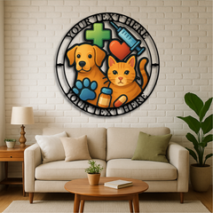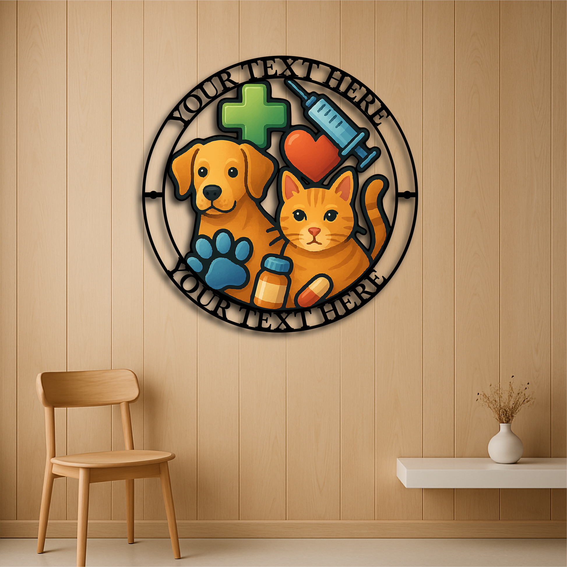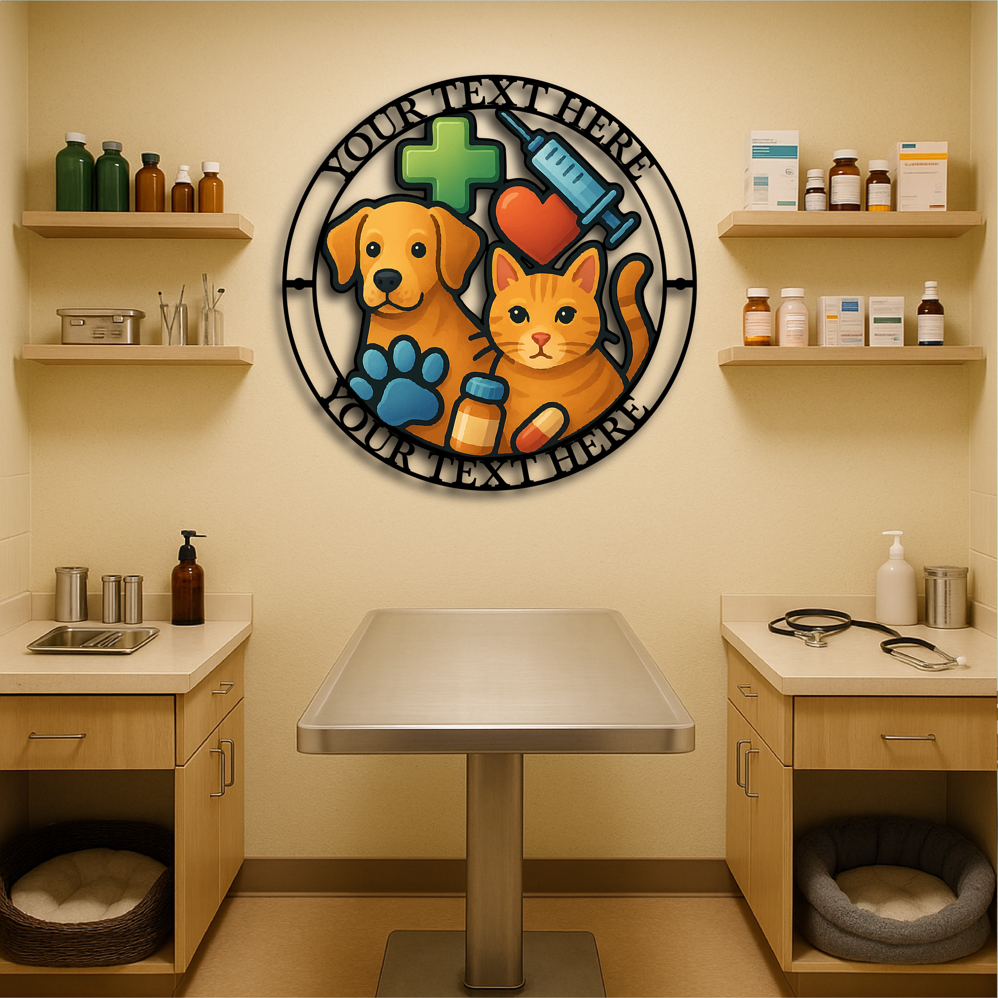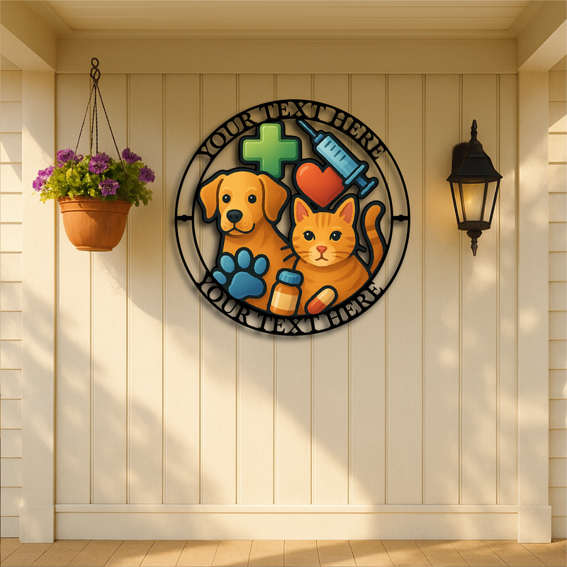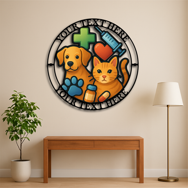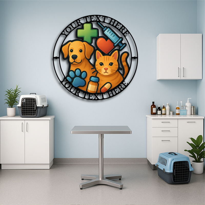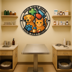 Showcase your dedication to animal care with this vibrant Custom Veterinary Clinic Metal Wall Sign, featuring a playful dog and cat illustration surrounded by medical icons including a syringe, pill bottle, heart, paw print, and cross. Personalize the top and bottom text with your clinic name, slogan, or vet’s name for a truly professional and welcoming statement piece.