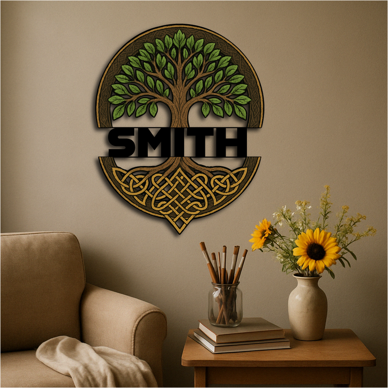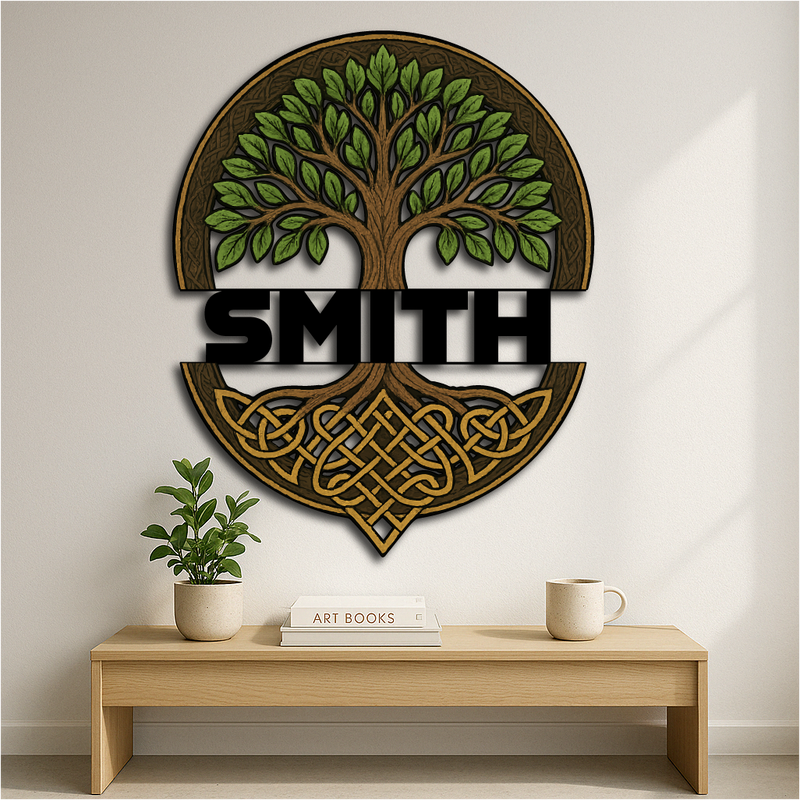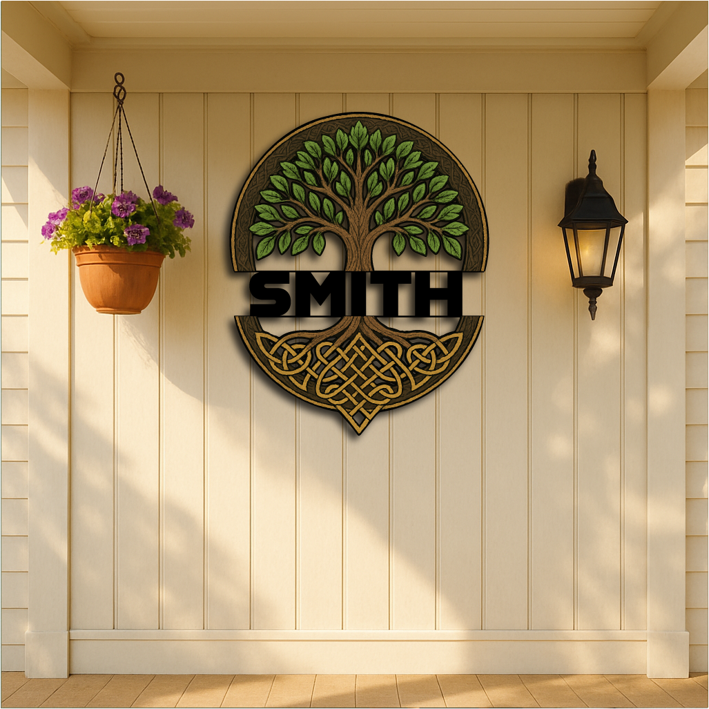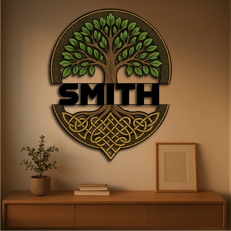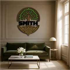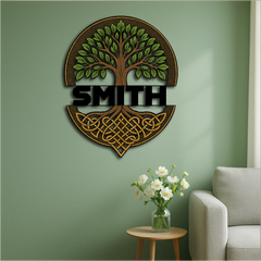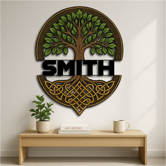 Honor your family roots and ancient traditions with this Custom Celtic Tree of Life Wall Sign, featuring a majestic tree with vibrant green leaves and intricate knotwork roots. The bold custom name band across the center makes it a timeless tribute to heritage, growth, and strength.