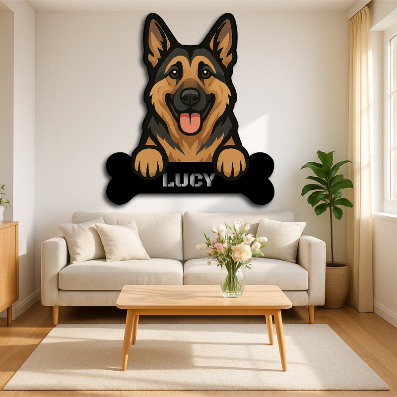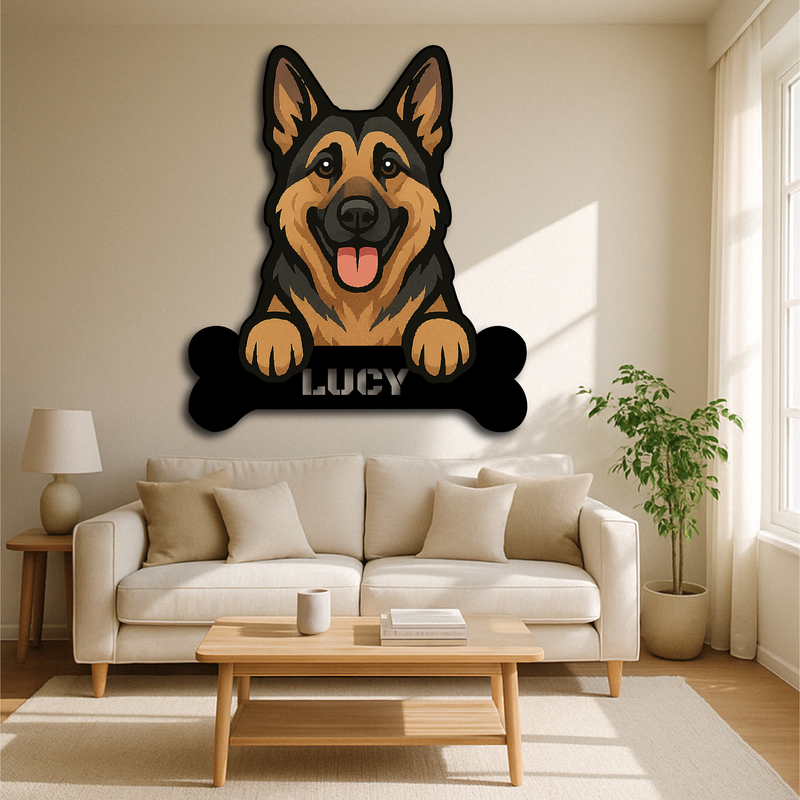 Celebrate your loyal companion with this Custom German Shepherd Metal Sign, designed with a realistic, happy shepherd illustration and a bone-shaped nameplate personalized just for your dog. Whether displayed indoors or outside the kennel, this striking piece adds warmth, loyalty, and personality to your space.