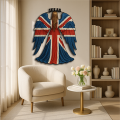 Showcase your love for the United Kingdom with this beautifully crafted Personalized Union Jack Angel Wall Sign. This touching artwork features a graceful angel with flowing hair and detailed wings and gown printed in the iconic Union Jack flag. Personalize the name above for a meaningful gift or display.
