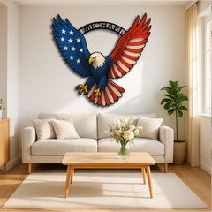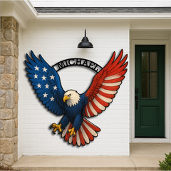 Show your American pride with this Personalized Bald Eagle Wall Decor, featuring a majestic eagle with wings spread wide in a striking multicolor design. With its fierce gaze and stars-and-stripes motif, this sign is perfect for man caves, garages, patios, or patriotic gifts.