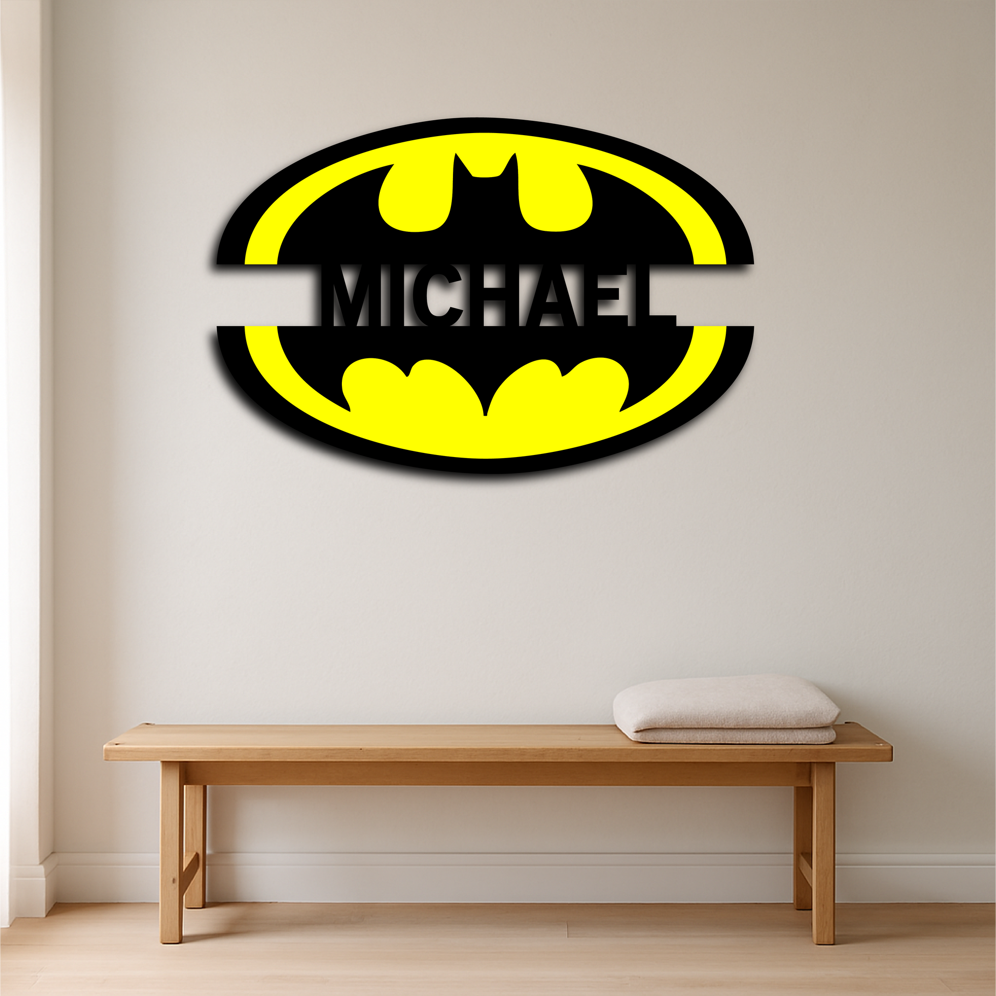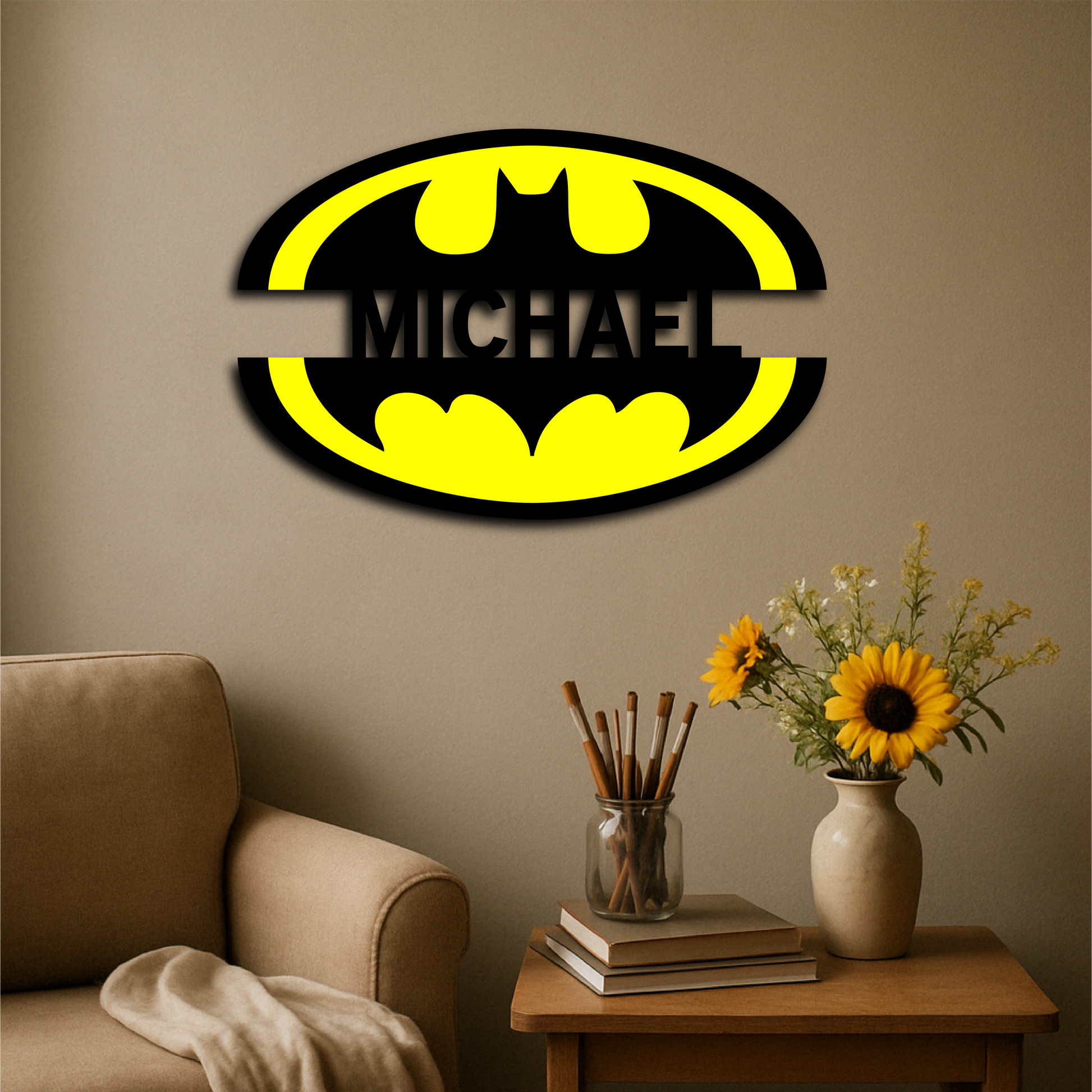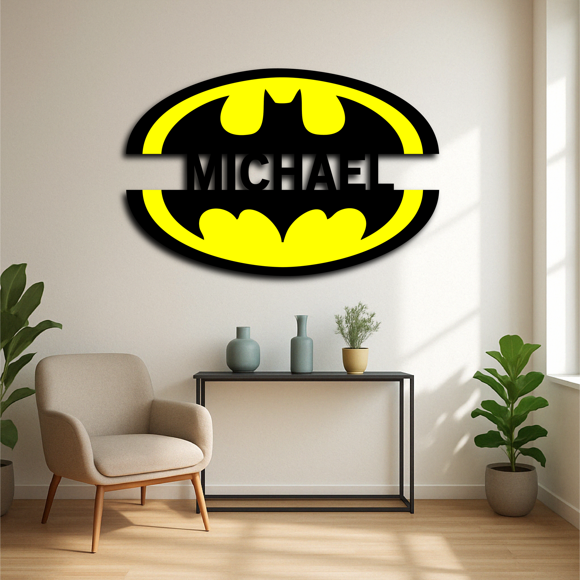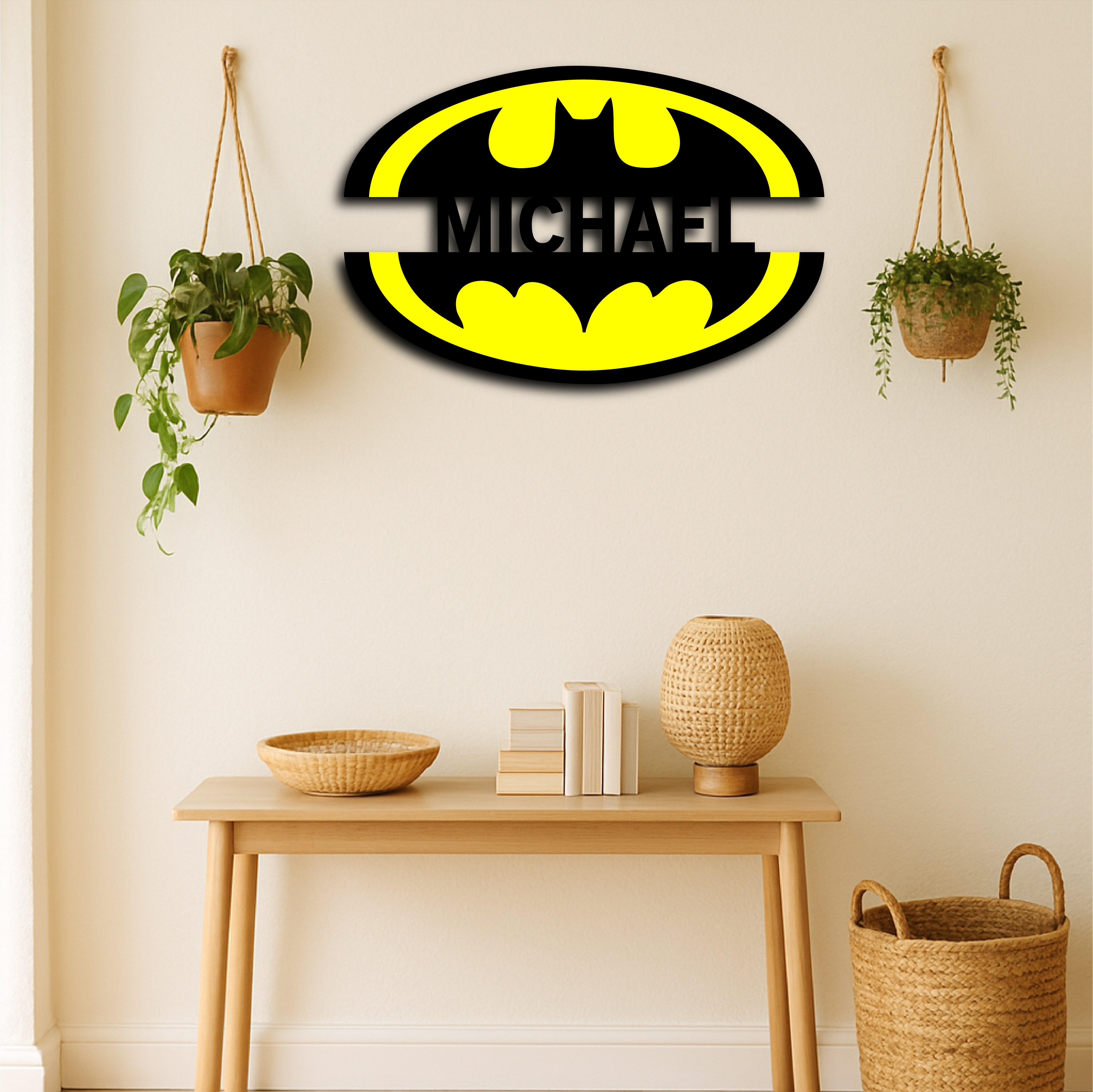 Transform any space into Gotham’s finest with this Custom Batman Metal Wall Sign! Featuring the legendary Batman logo in bold black and yellow, this personalized wall art includes your custom name cut-out, making it the ultimate gift or decor for any Dark Knight fan.