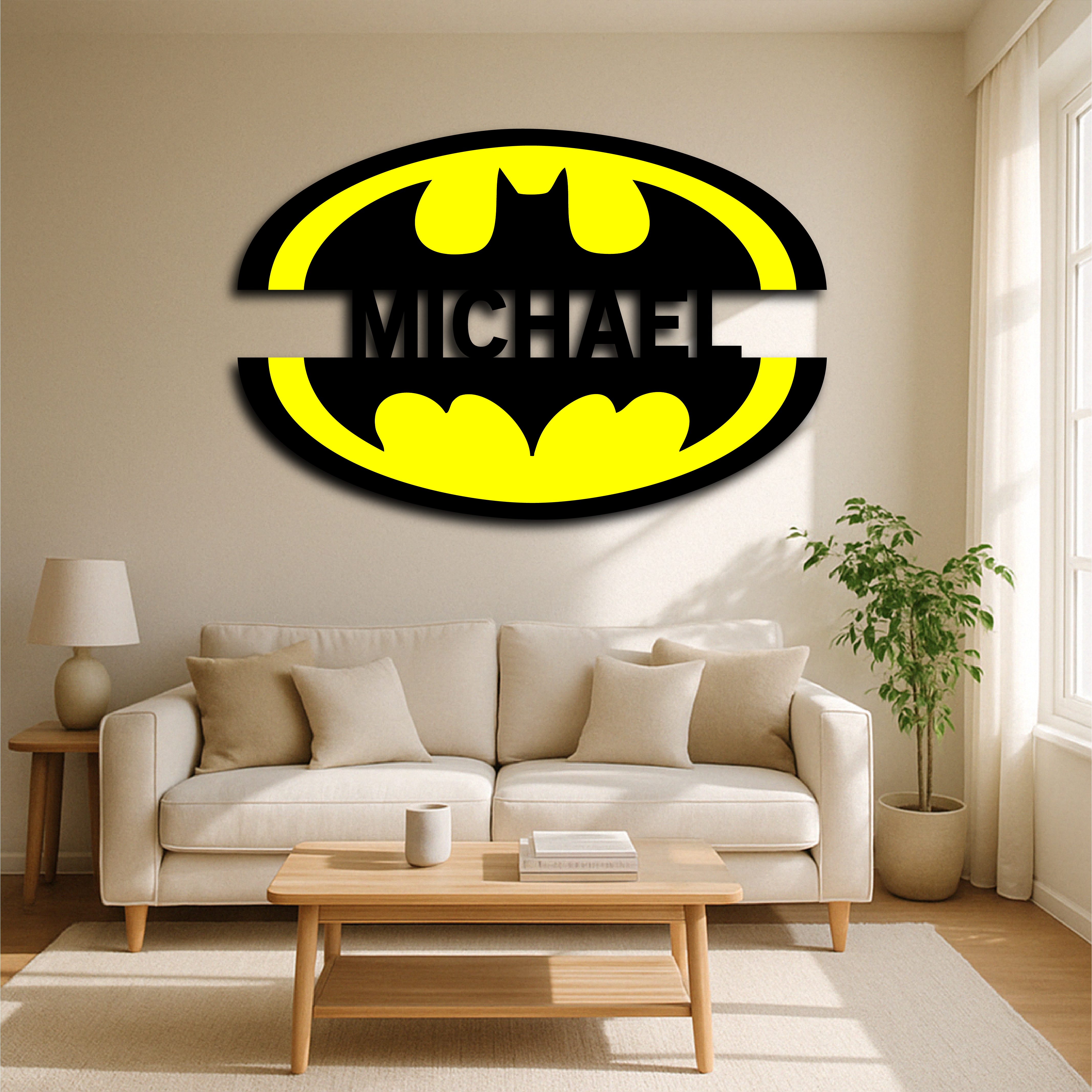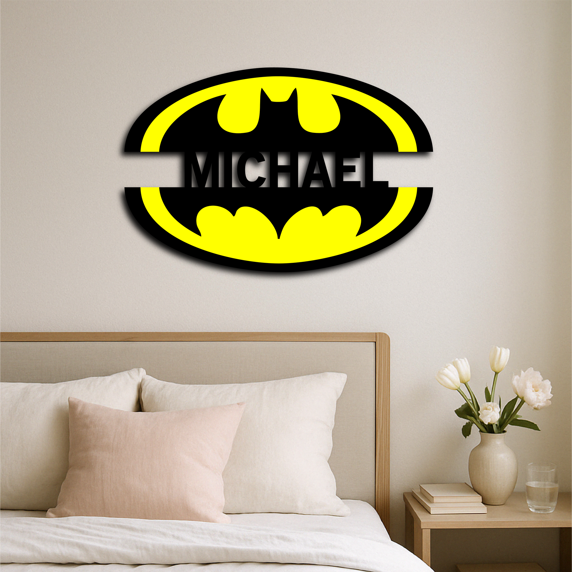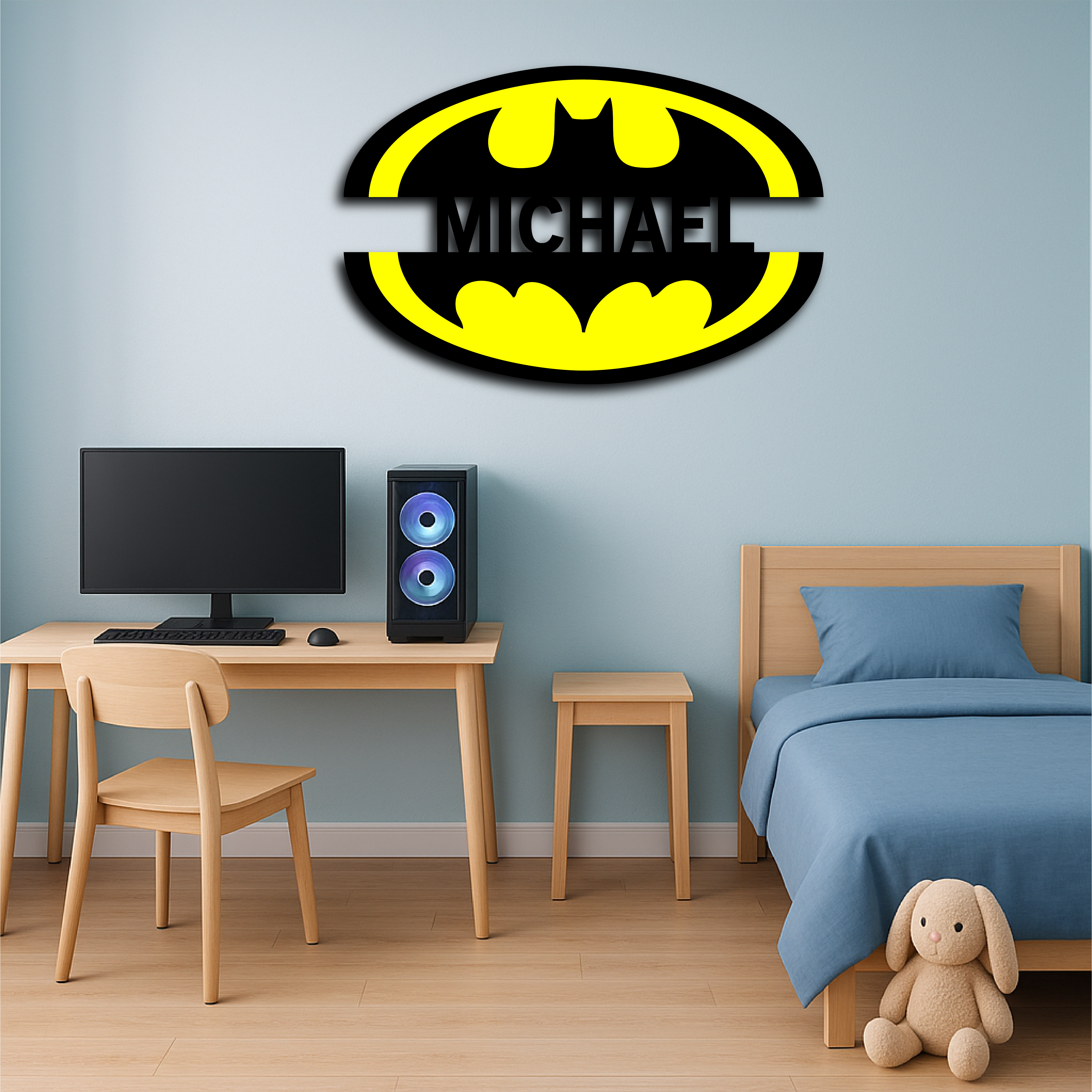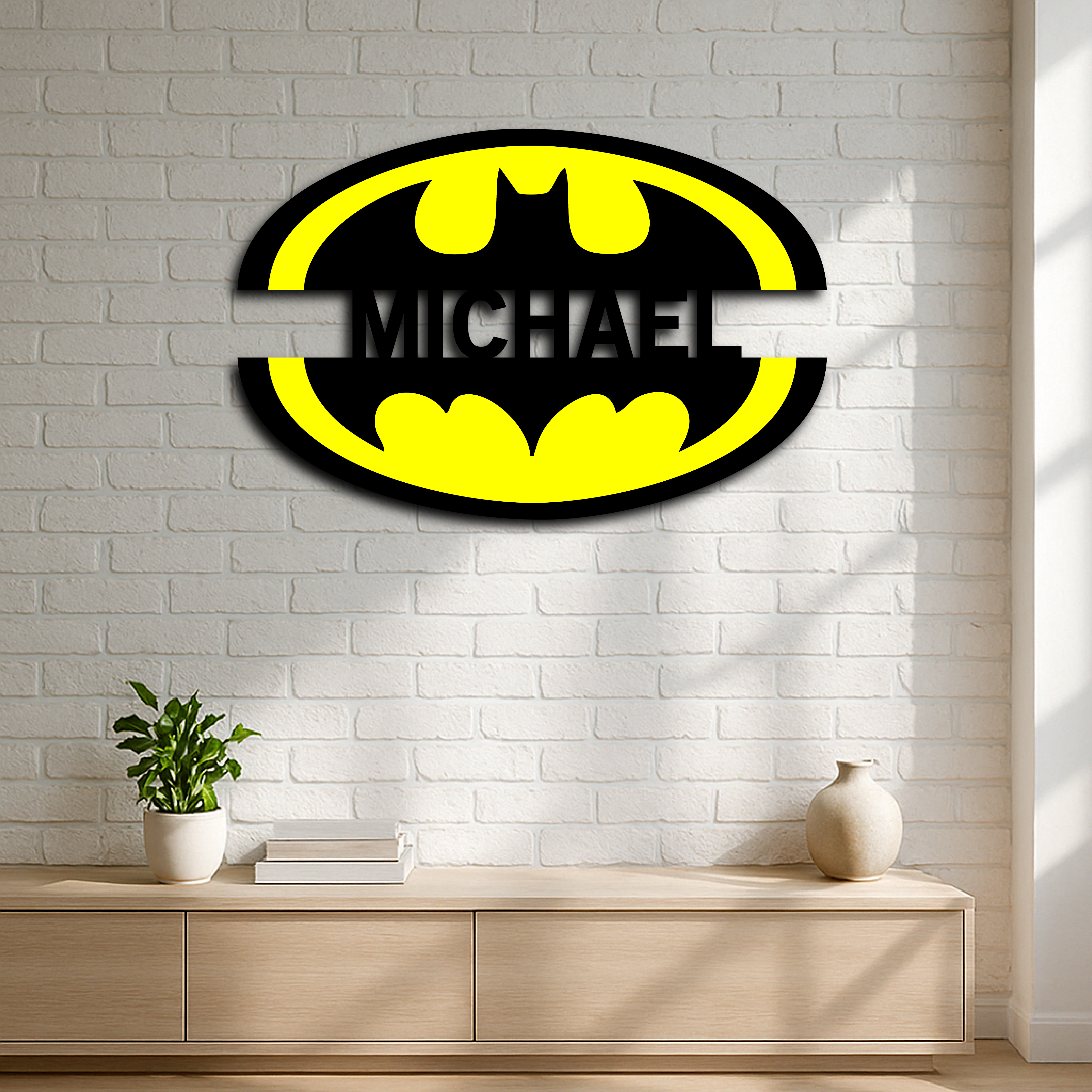 Transform any space into Gotham’s finest with this Custom Batman Metal Wall Sign! Featuring the legendary Batman logo in bold black and yellow, this personalized wall art includes your custom name cut-out, making it the ultimate gift or decor for any Dark Knight fan.