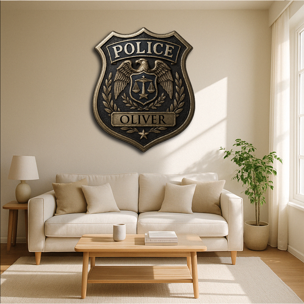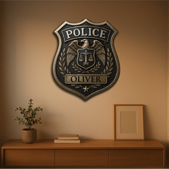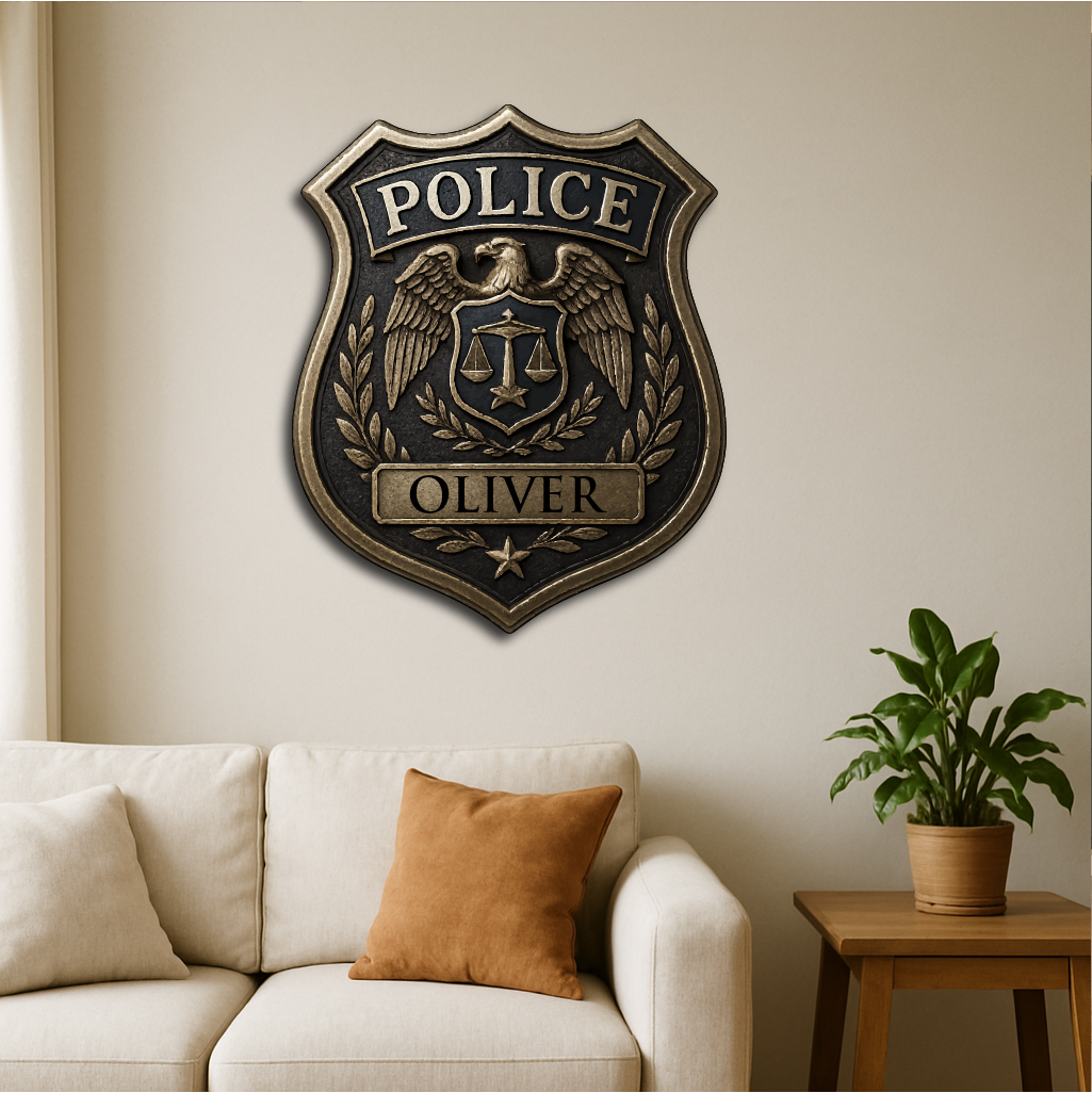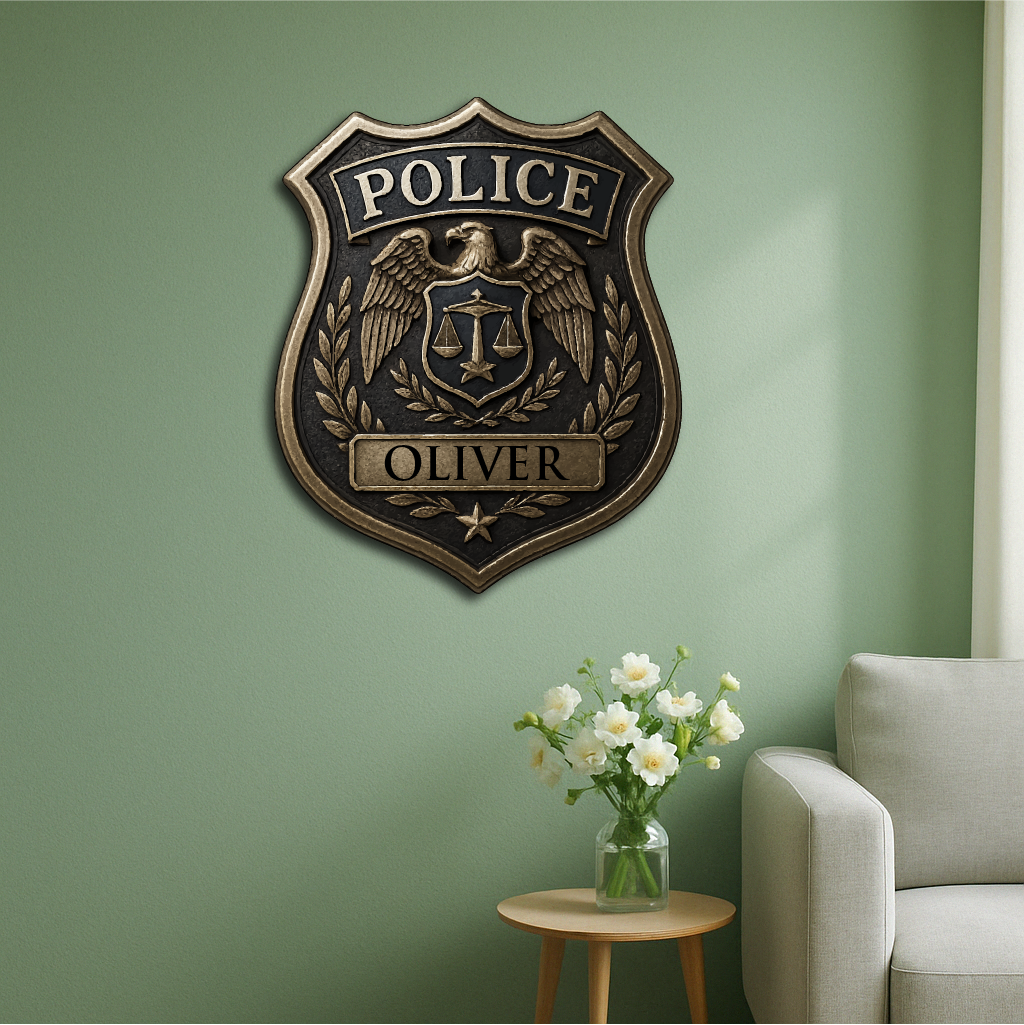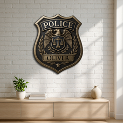 Honor the dedication and service of law enforcement with our Custom Police Badge, featuring the iconic eagle emblem, scales of justice, and laurel wreath. Personalized with any name, this plaque makes a meaningful tribute for police officers, sheriffs, and security professionals.