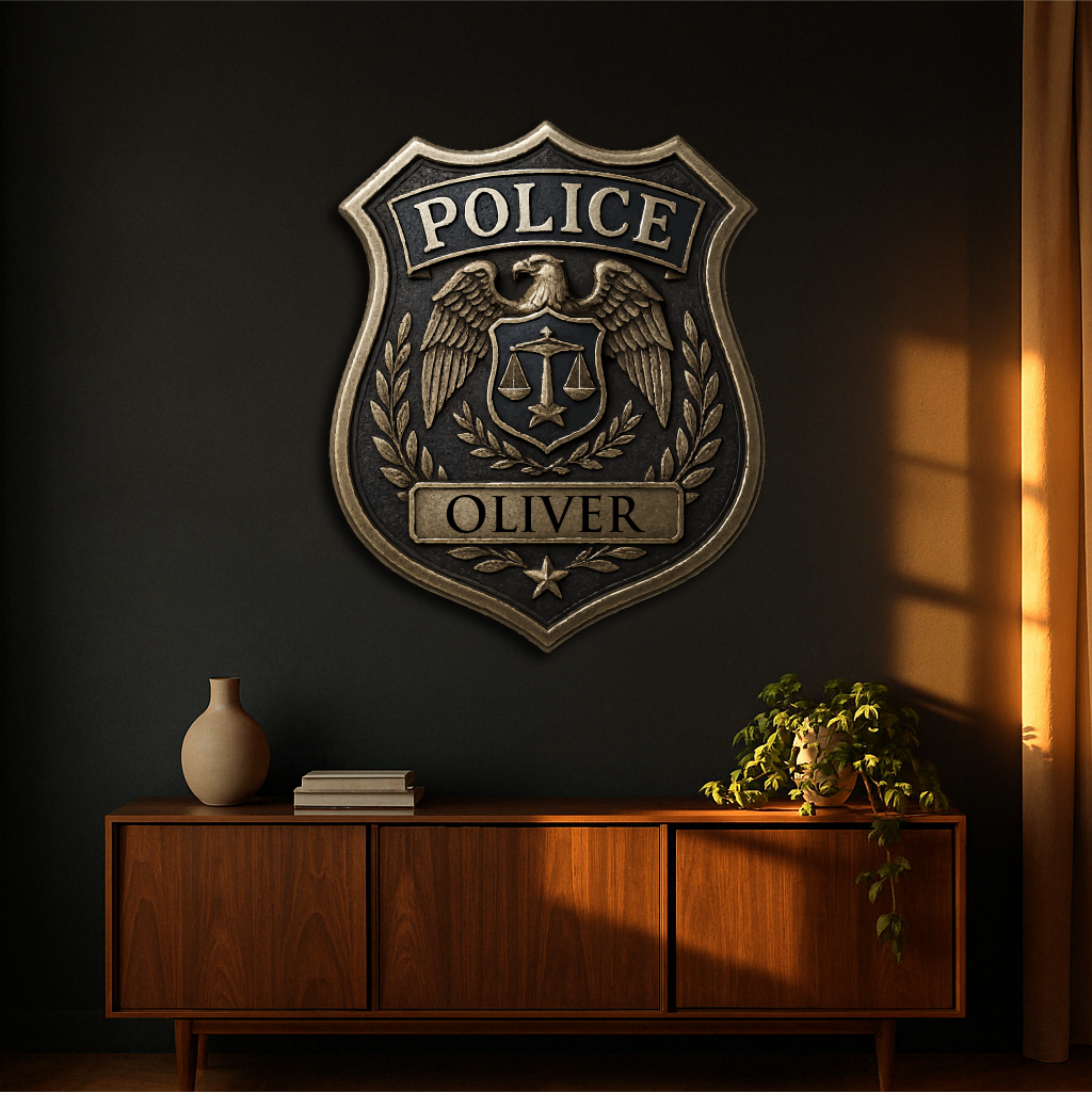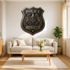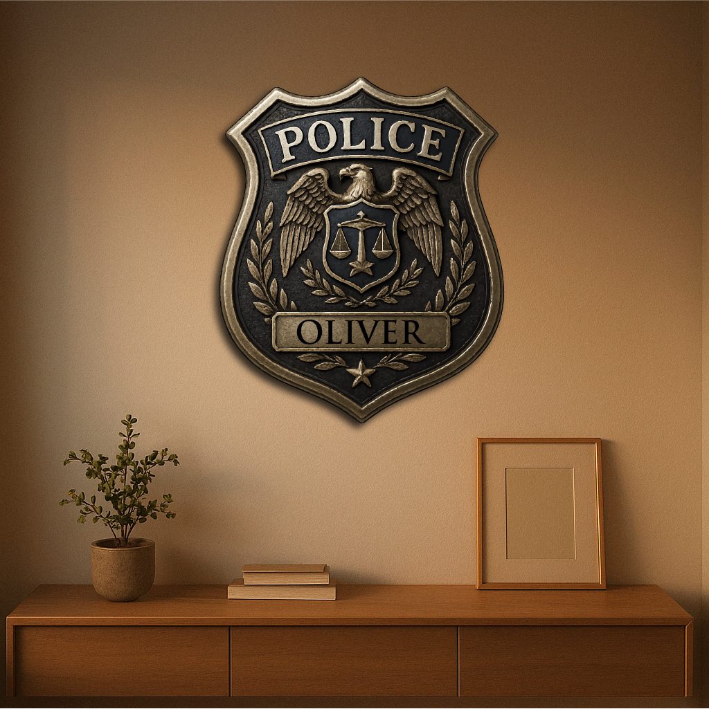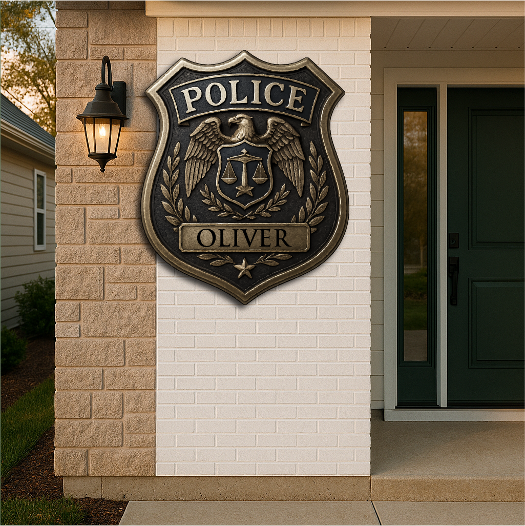 Honor the dedication and service of law enforcement with our Custom Police Badge, featuring the iconic eagle emblem, scales of justice, and laurel wreath. Personalized with any name, this plaque makes a meaningful tribute for police officers, sheriffs, and security professionals.