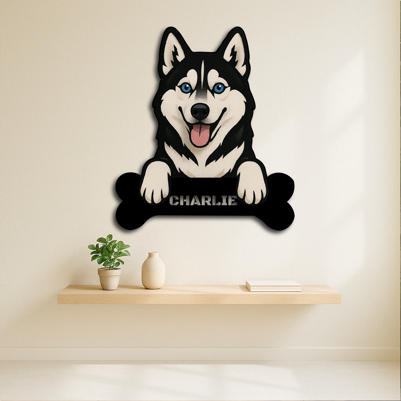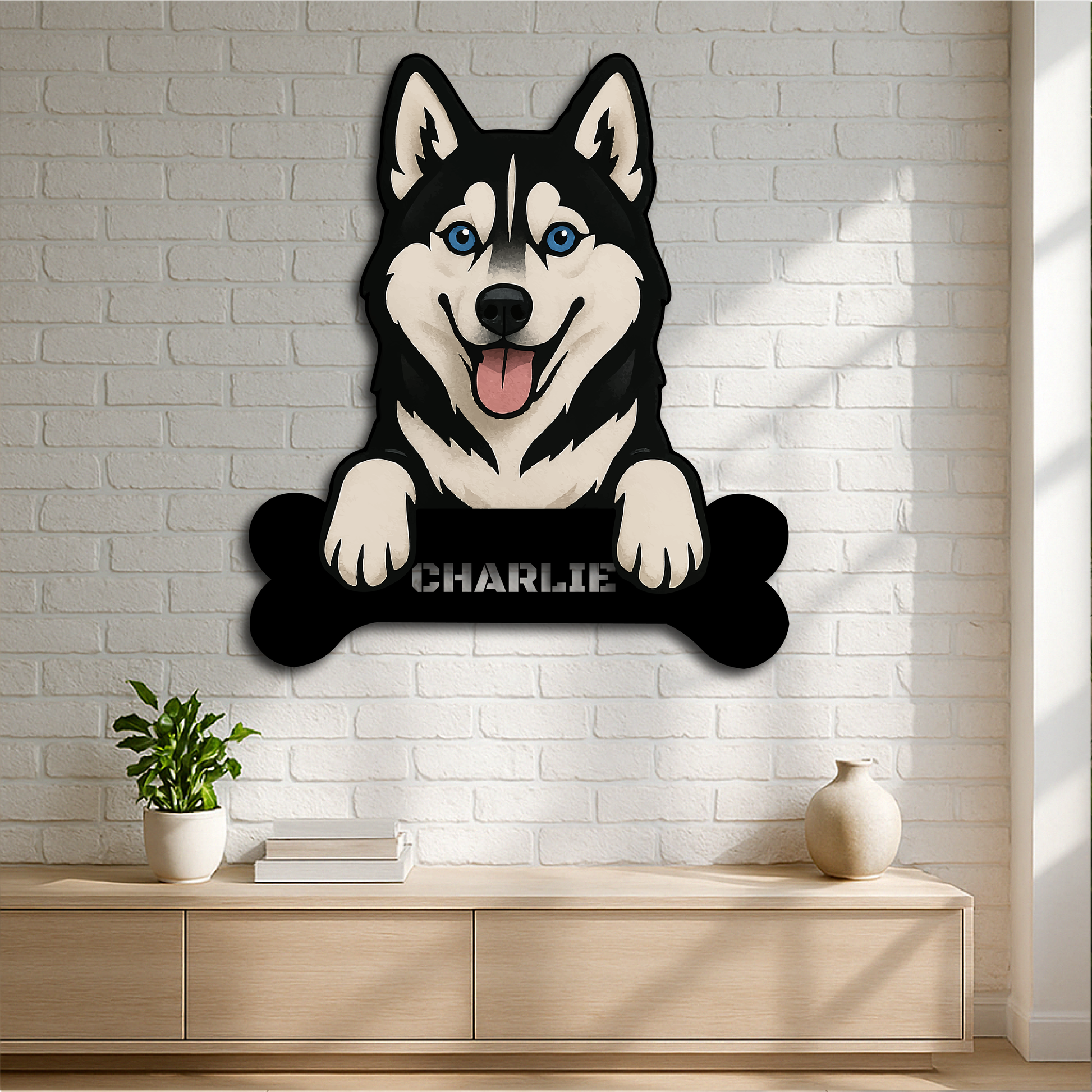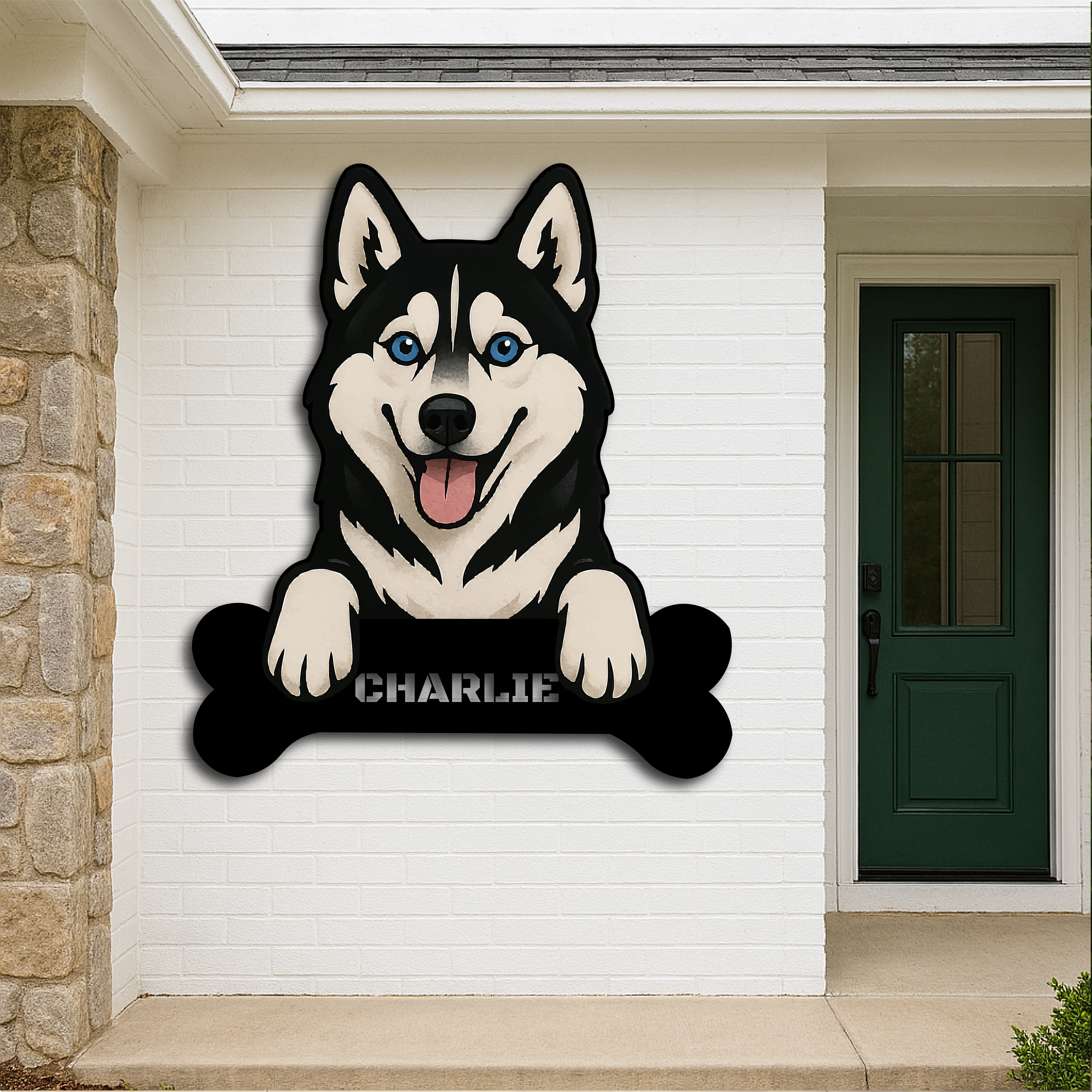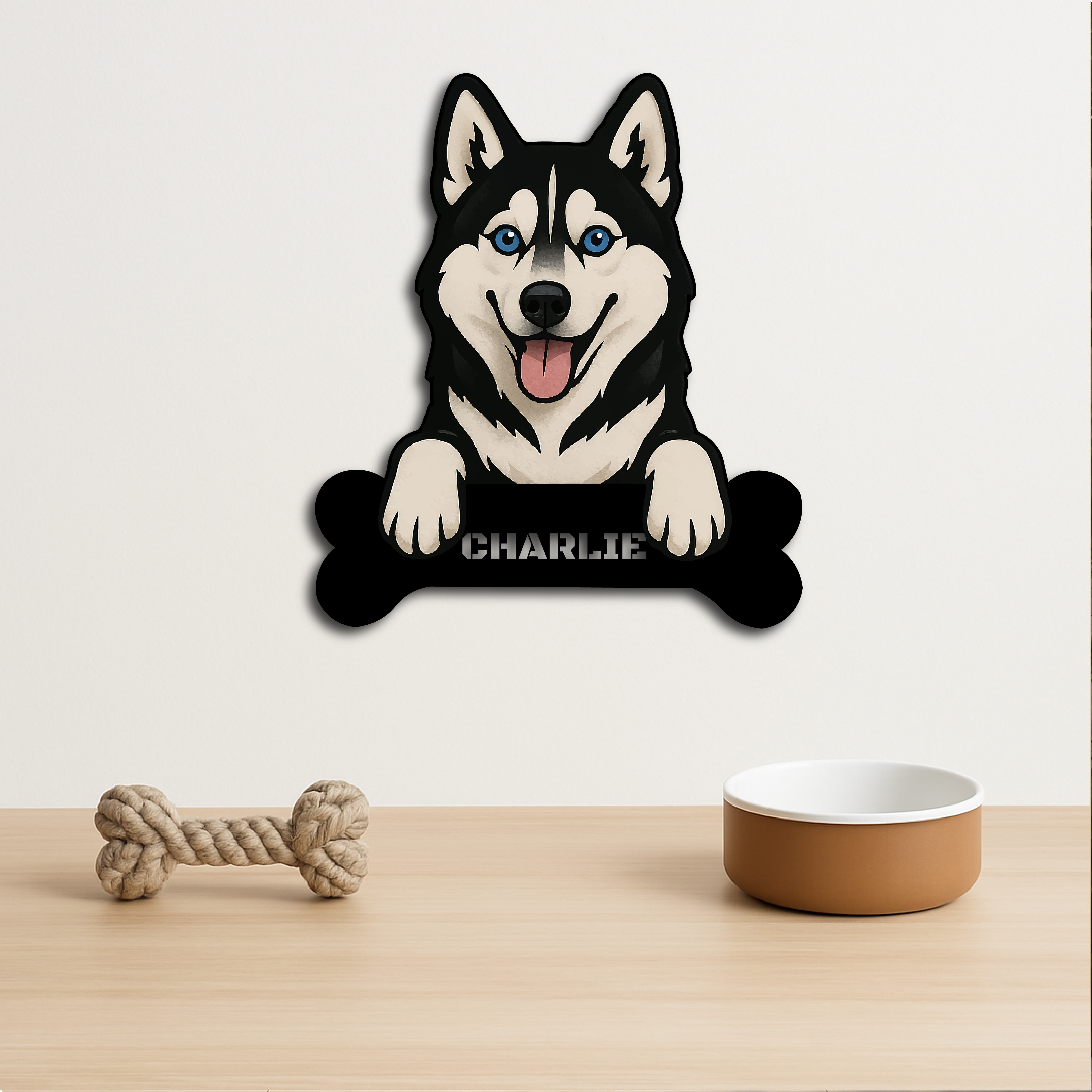 Custom Siberian Husky Dog Name Sign – Personalized Metal Wall Art with Bone Nameplate