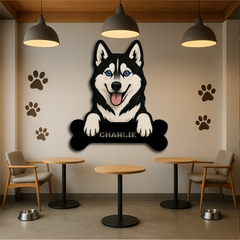 Celebrate your energetic and loyal companion with this Personalized Siberian Husky Metal Wall Sign, featuring a stunning black and white Husky with bright blue eyes and a custom bone-shaped nameplate. This bold design is perfect for showcasing your pup’s spirit in any space—indoors or out.