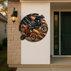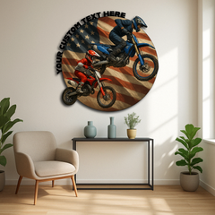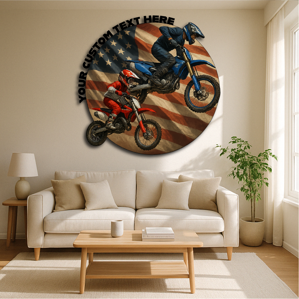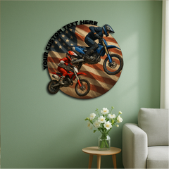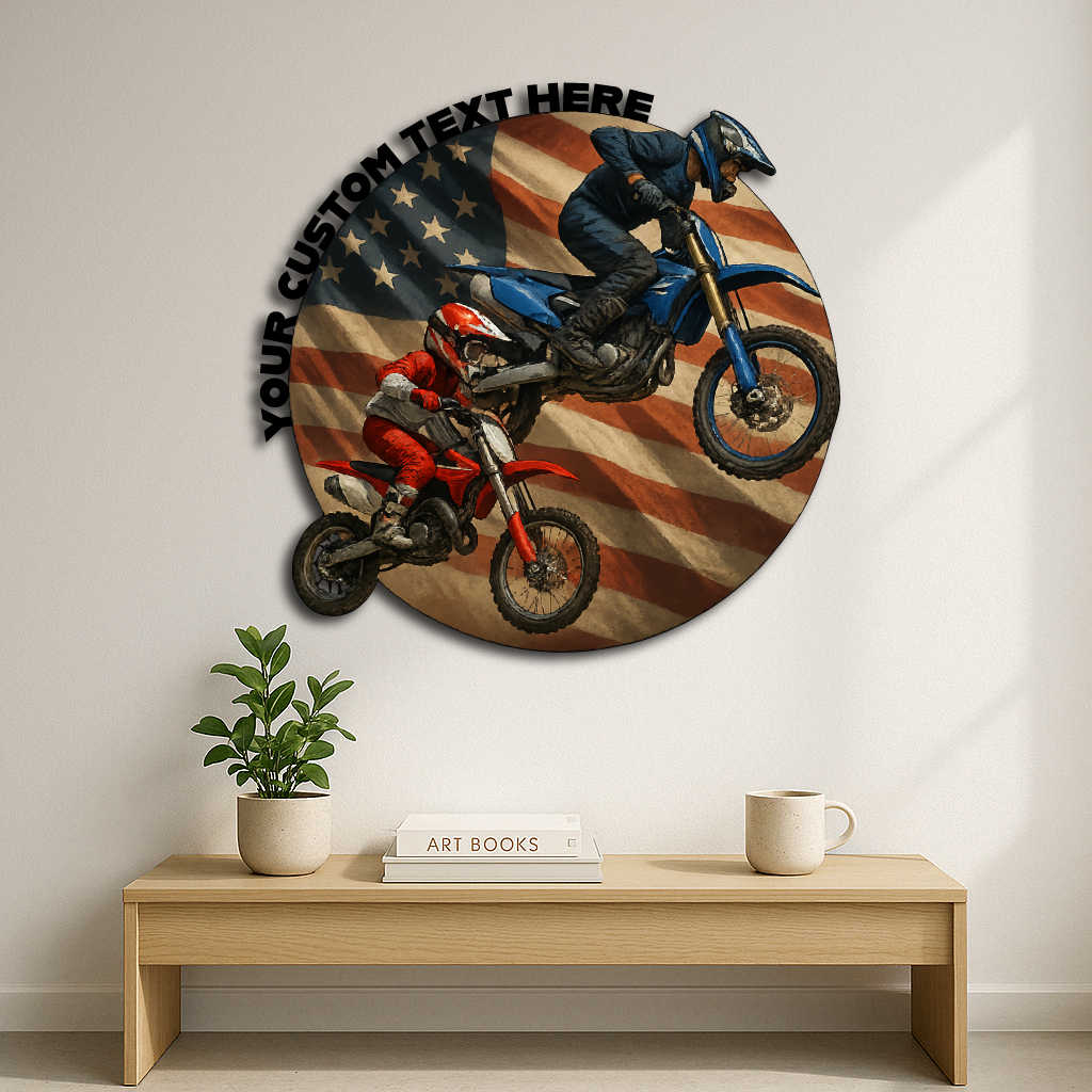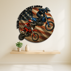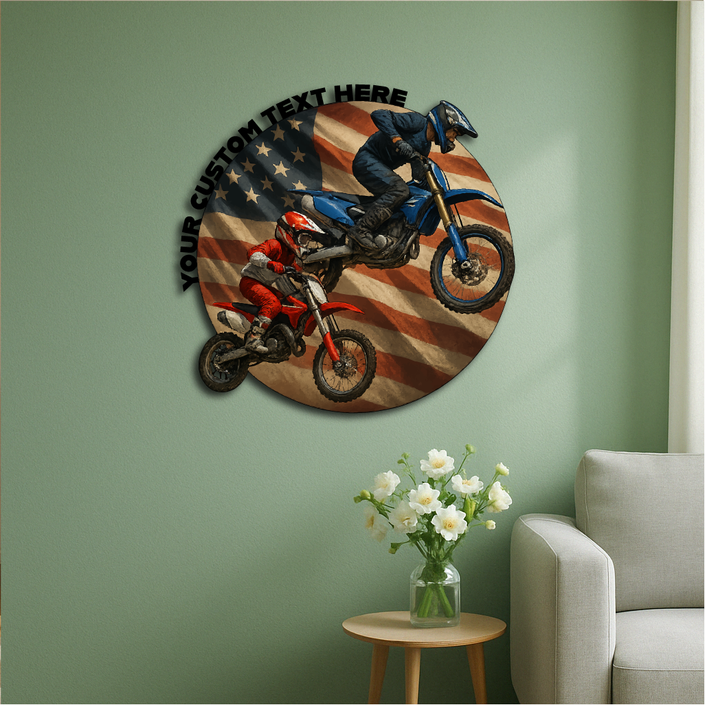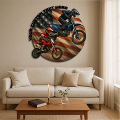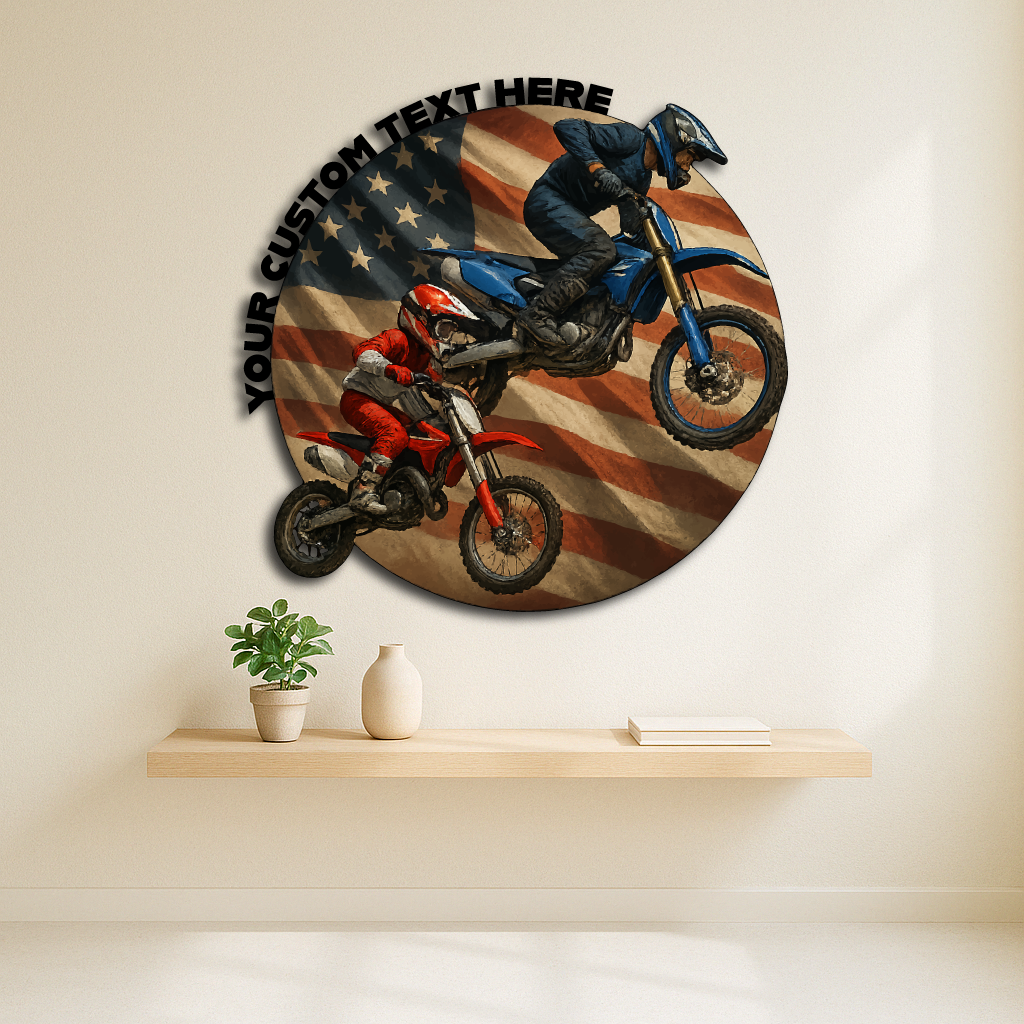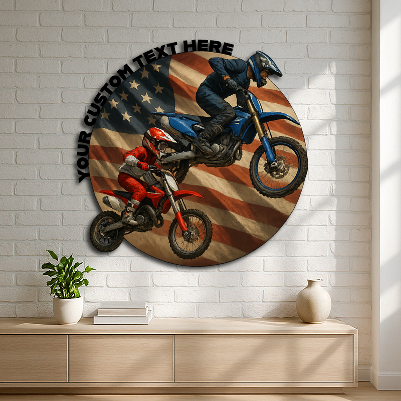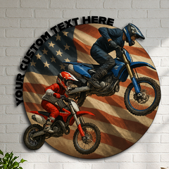 Honor the thrill of motocross and the special bond between parent and child with our Personalized Motocross Father & Child with American Flag Wall Art. Featuring a stunning depiction of a father and child jumping side by side on dirt bikes against a vintage-style American flag background, this piece is perfect for patriotic motocross families and dirt bike lovers.