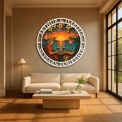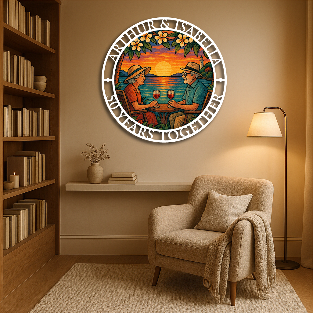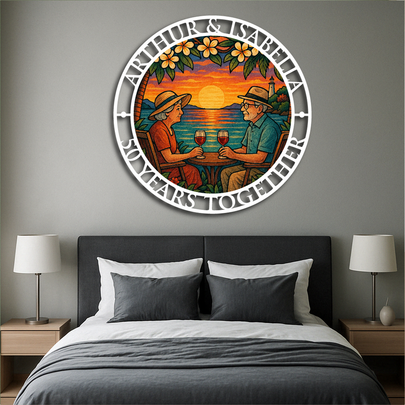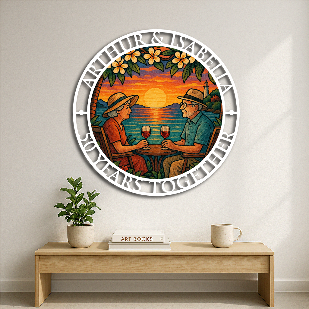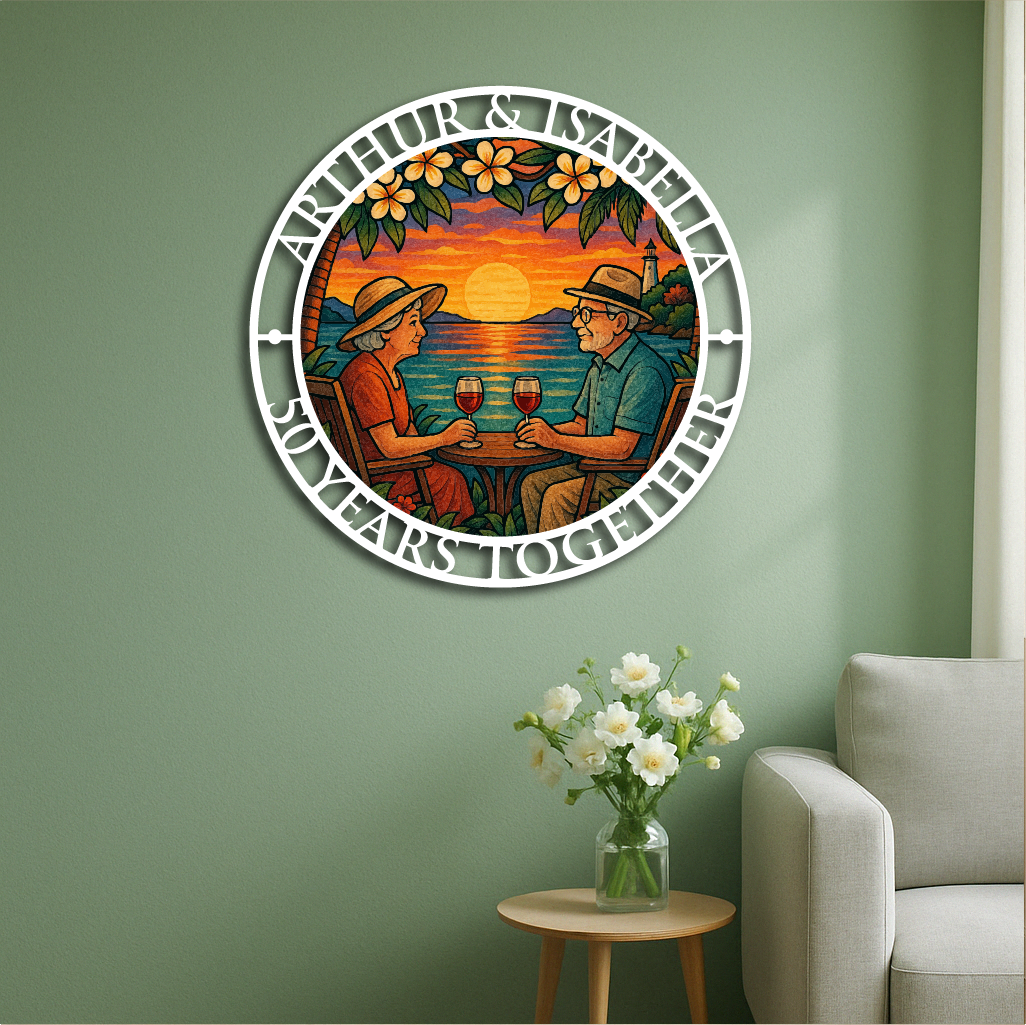 Celebrate love, memories, and togetherness with our Personalized Anniversary Sunset Metal Wall Art. Featuring a beautifully detailed illustration of a couple enjoying wine by the ocean during a breathtaking sunset, framed with your custom names and anniversary year, this piece makes the perfect gift for weddings, anniversaries, or milestone celebrations.