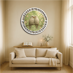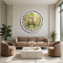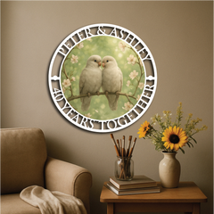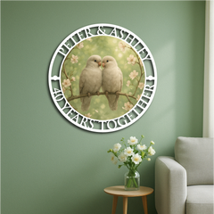 Celebrate a lifetime of love with our Personalized Lovebirds Anniversary Metal Wall Art. Featuring two charming white lovebirds perched on a blossoming branch, this romantic design is framed with your custom names and anniversary milestone. The gentle pastel background and floral details make it the perfect symbol of devotion and togetherness.