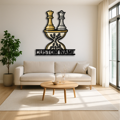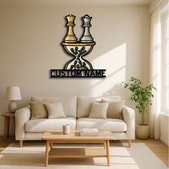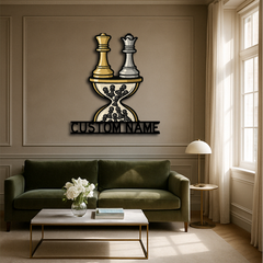 Celebrate the timeless strategy of chess with our Personalized Chess Hourglass Wall Art. This striking design features a golden king and silver queen atop an hourglass filled with pawns, symbolizing both time and the art of the game. Crafted from high-quality metal, this custom sign can be personalized with your name, making it a perfect statement piece for chess lovers, game rooms, and unique gift ideas. Durable, stylish, and meaningful, this wall art adds sophistication and personality to any space.