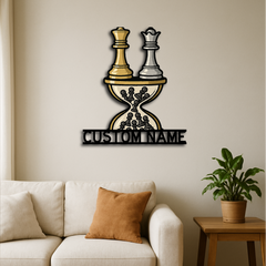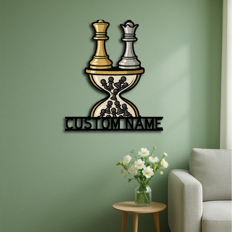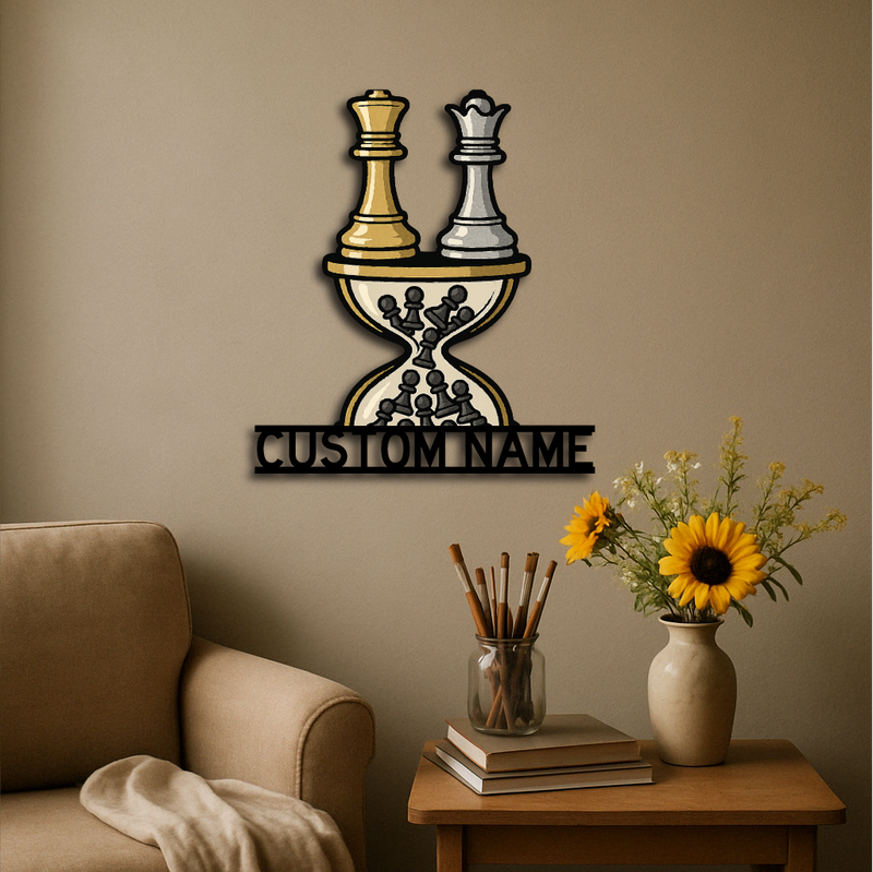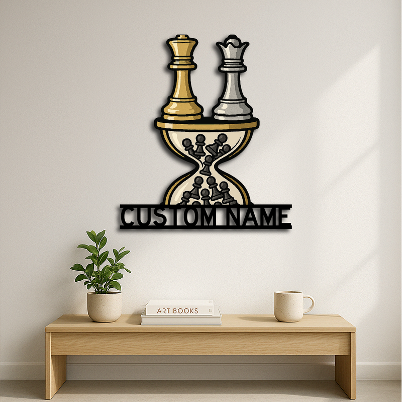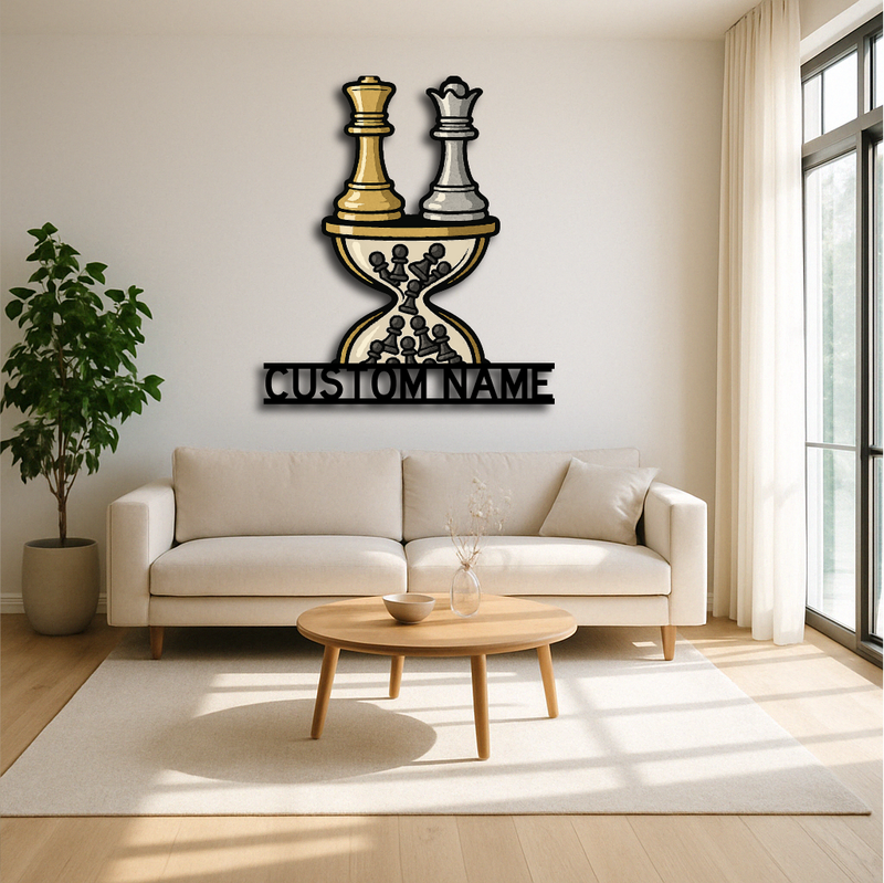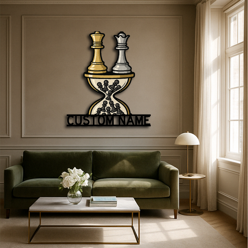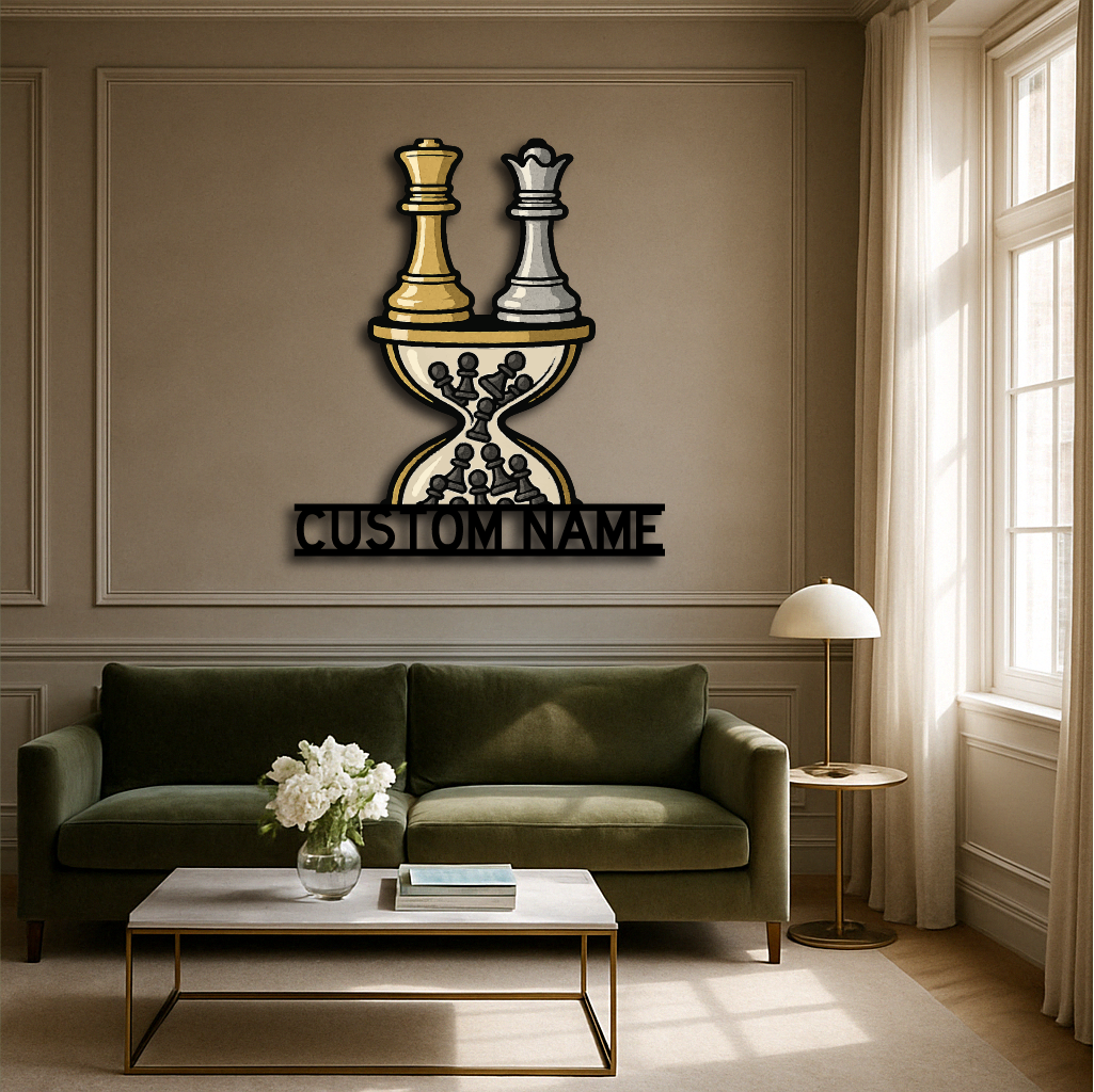 Custom Chess Hourglass Wall Art – Personalized Metal Chess Sign with King & Queen Design