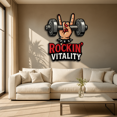 Rockin’ Vitality Gym Wall Art – Metal Fitness Sign with Dumbbell and Rock Hand Design