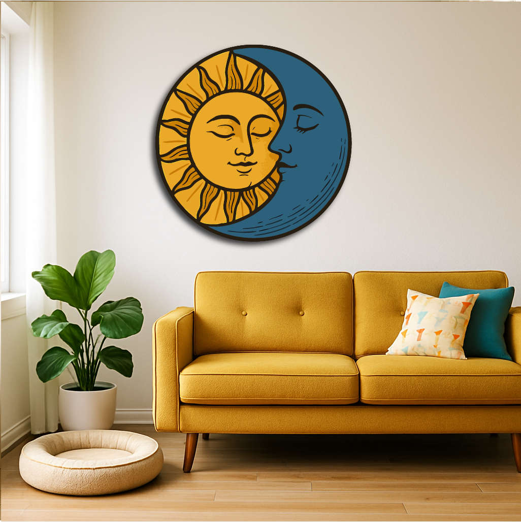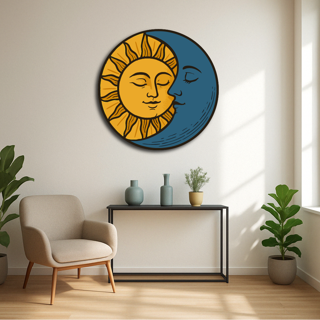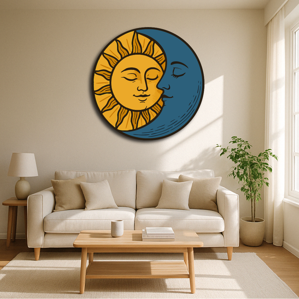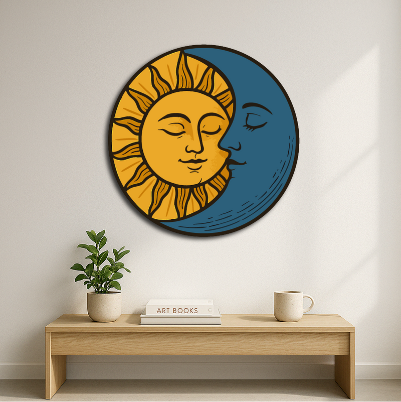 This stunning celestial design features the radiant sun and the serene moon in a graceful embrace — symbolizing light, love, and unity. Perfect for living rooms, bedrooms, meditation spaces, or as a thoughtful gift for anyone drawn to celestial energy.