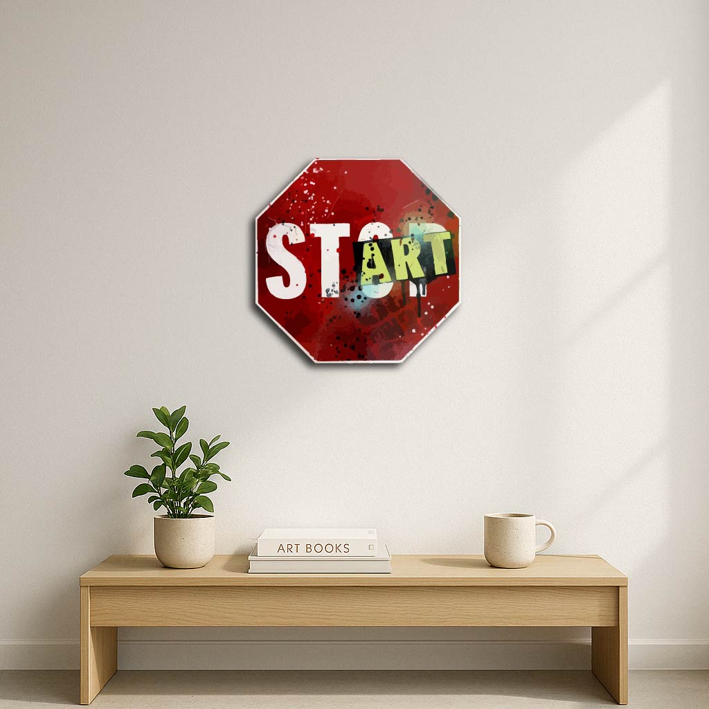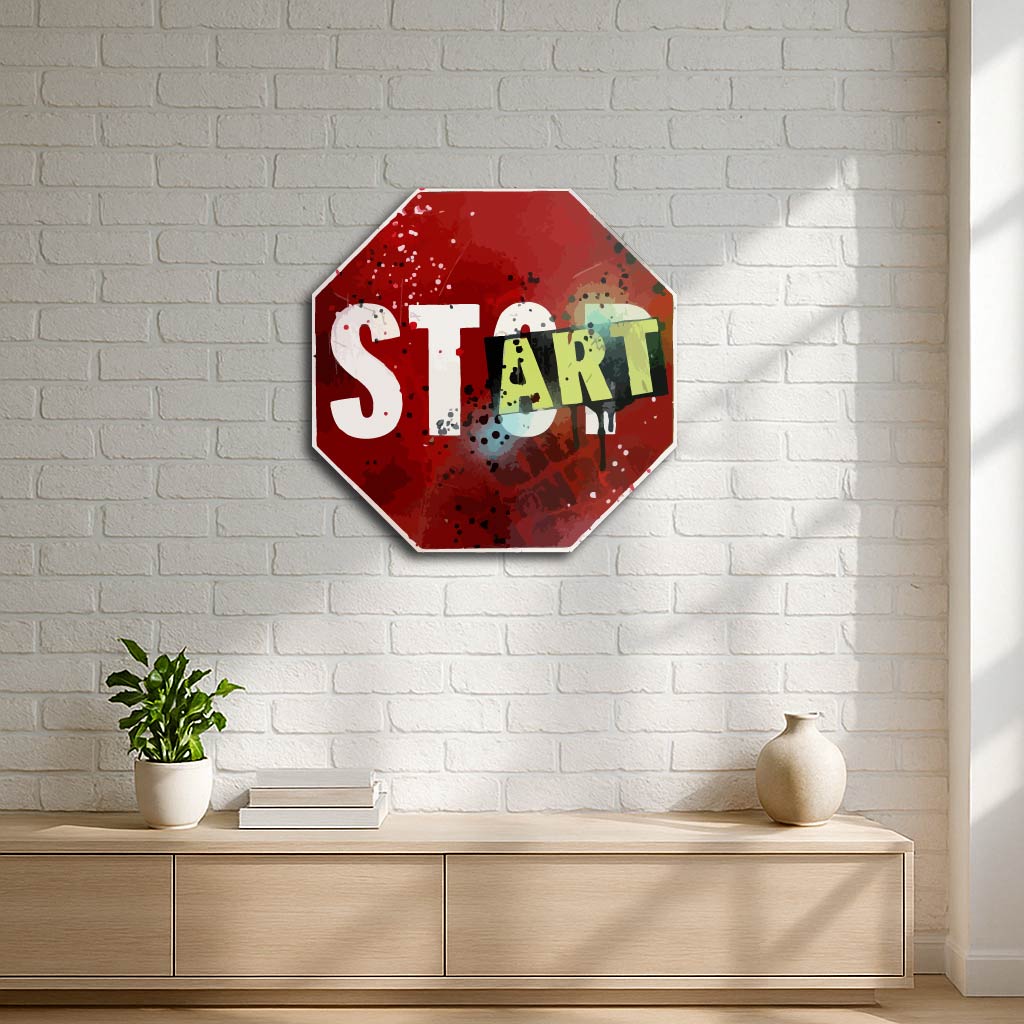 This creative twist on the iconic stop sign transforms a symbol of pause into one of motivation and new beginnings. With bold graffiti-style lettering and vibrant splashes of color, it’s perfect for art lovers, creatives, and anyone ready to make their mark.