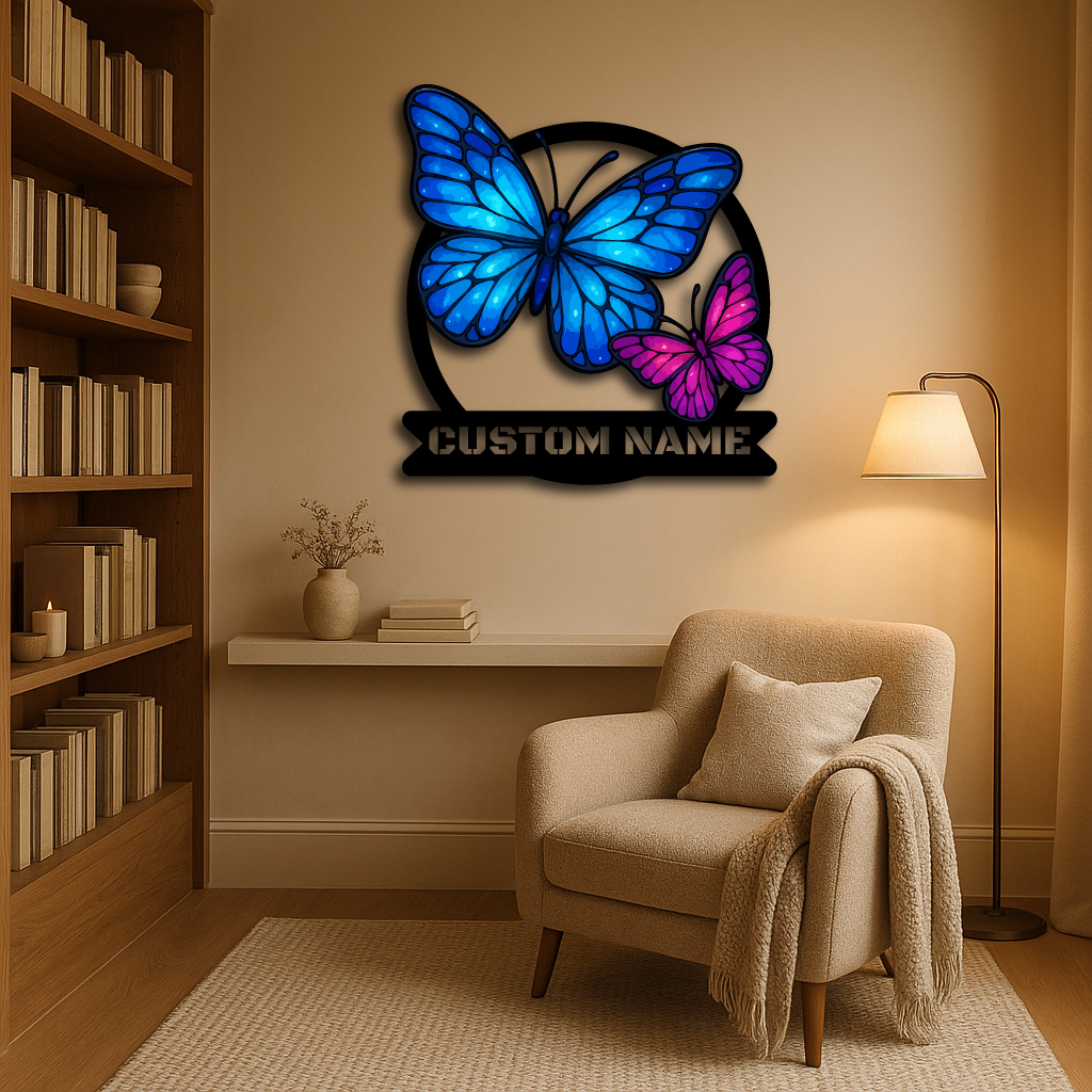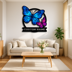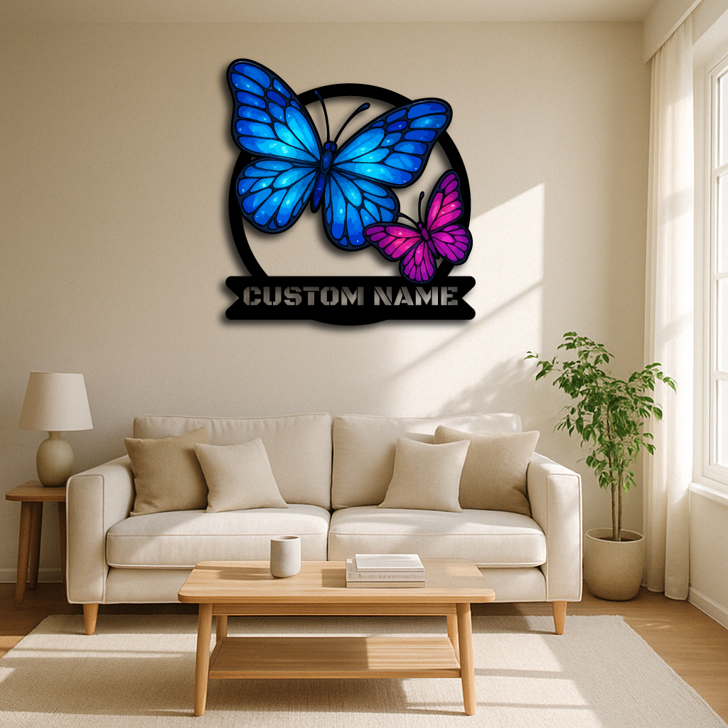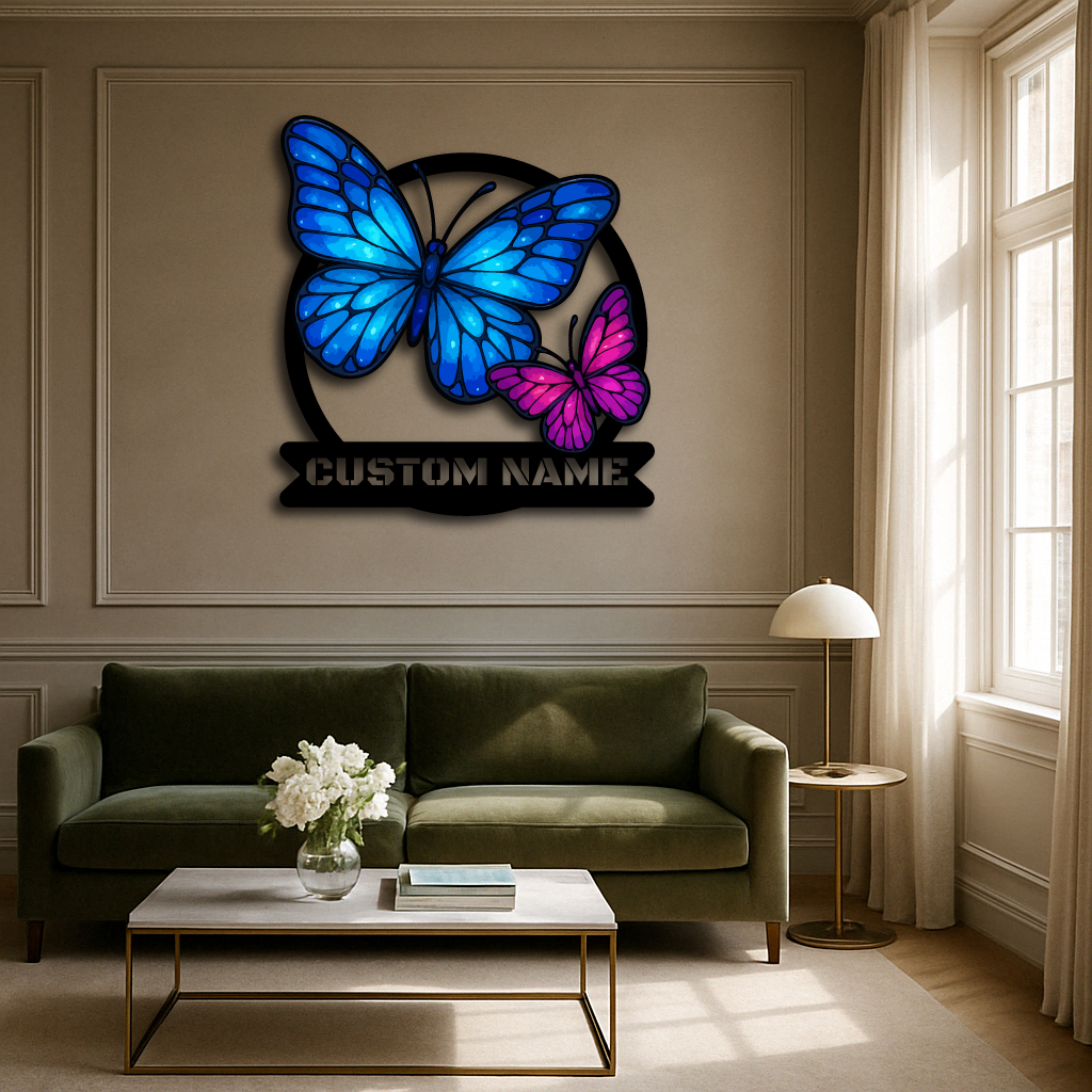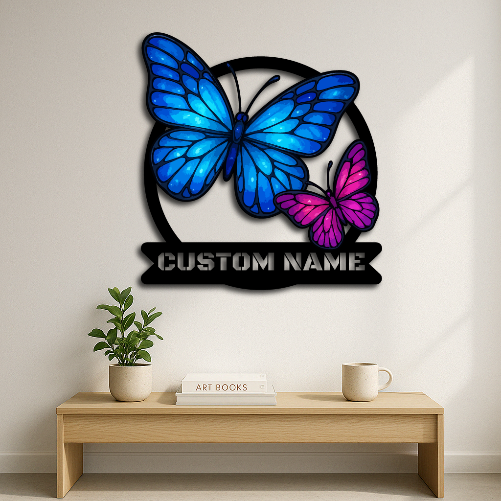 Featuring two beautifully detailed butterflies in shades of blue and purple, this elegant piece symbolizes transformation, freedom, and beauty. The custom name area makes it uniquely yours — perfect for bedrooms, nurseries, living rooms, or as a thoughtful gift.