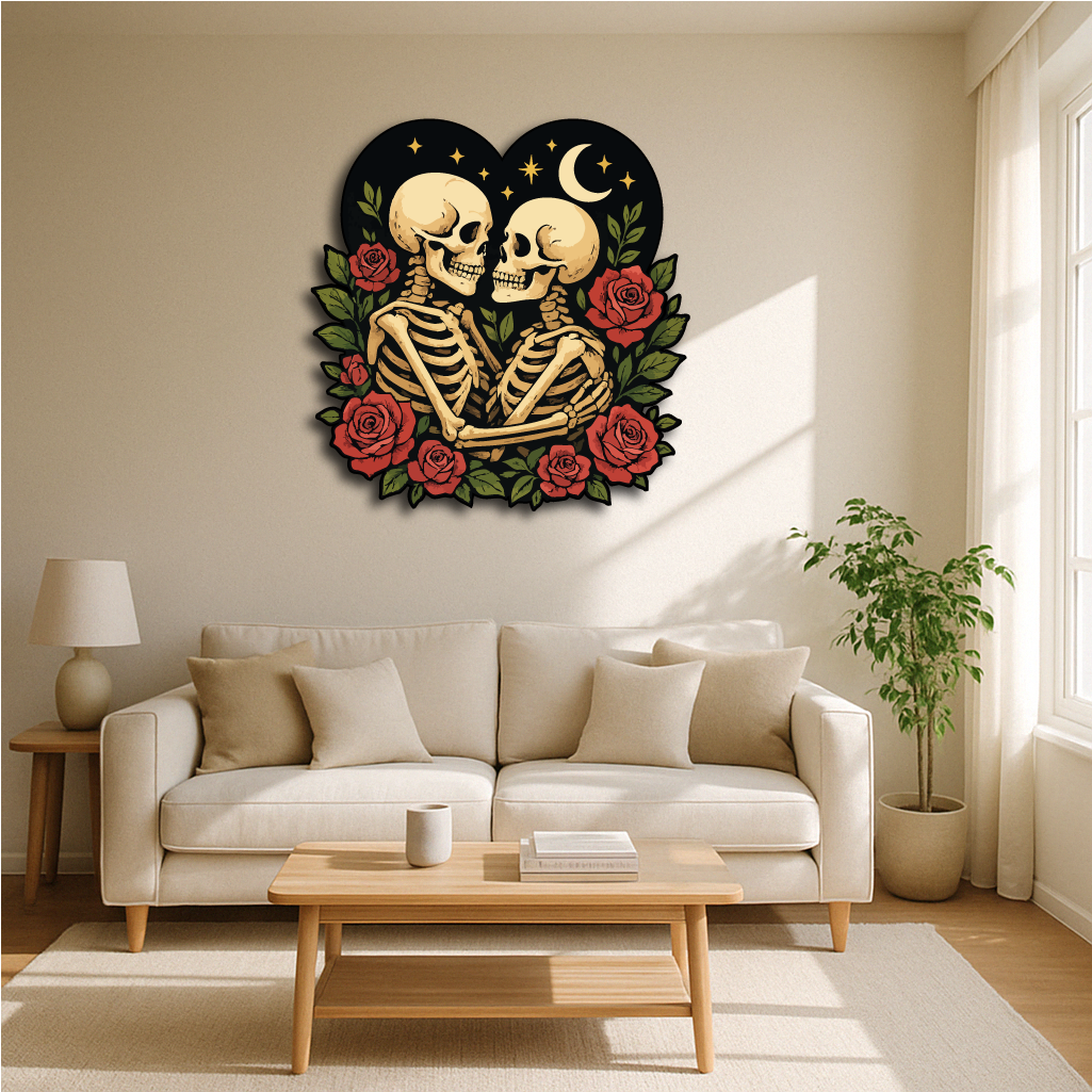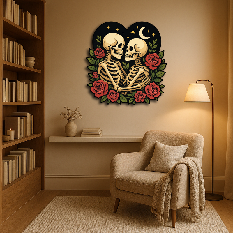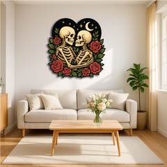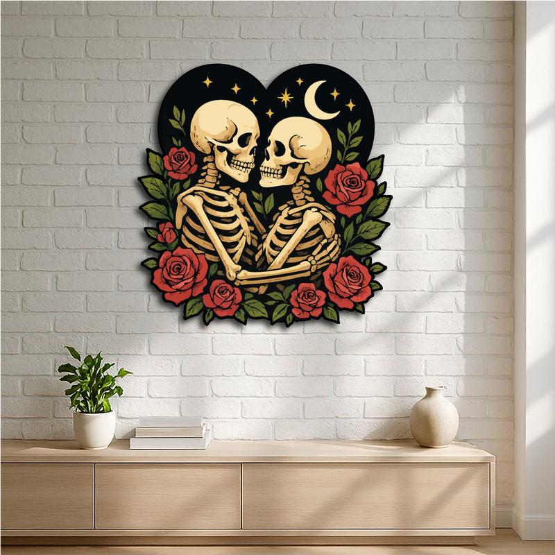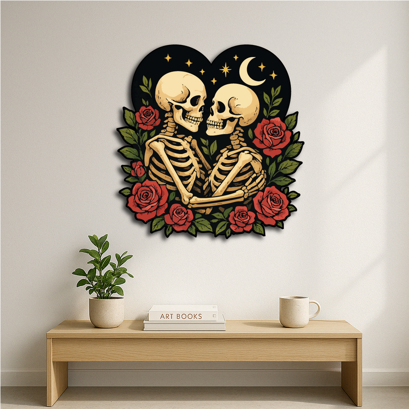 Featuring two embracing skeletons surrounded by red roses, stars, and a crescent moon — this piece captures the poetic beauty of eternal devotion and gothic romance. It’s the perfect statement décor for couples who love bold, mysterious, and artistic designs.