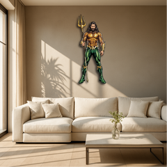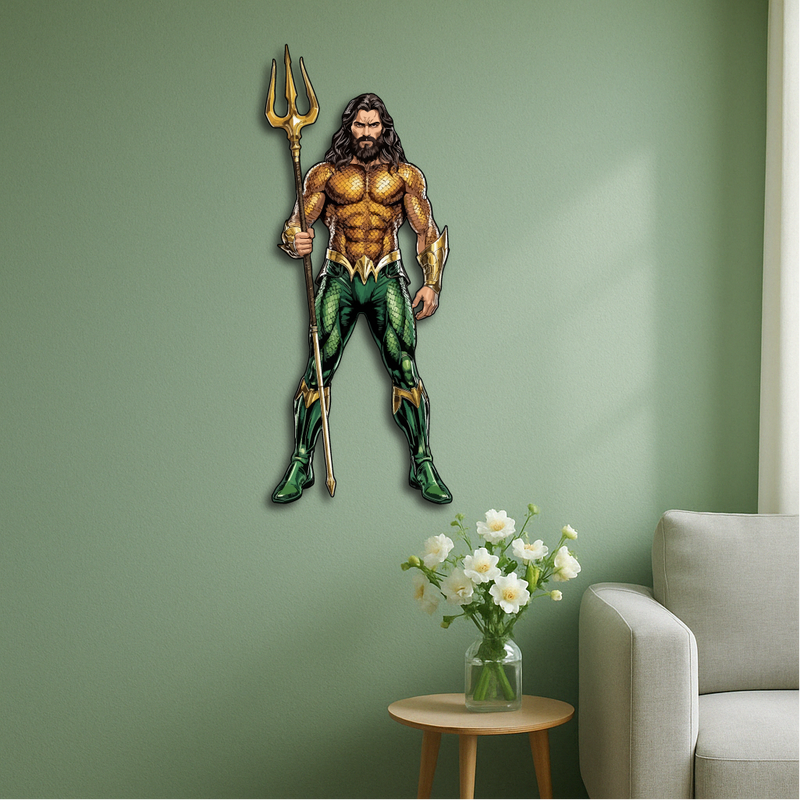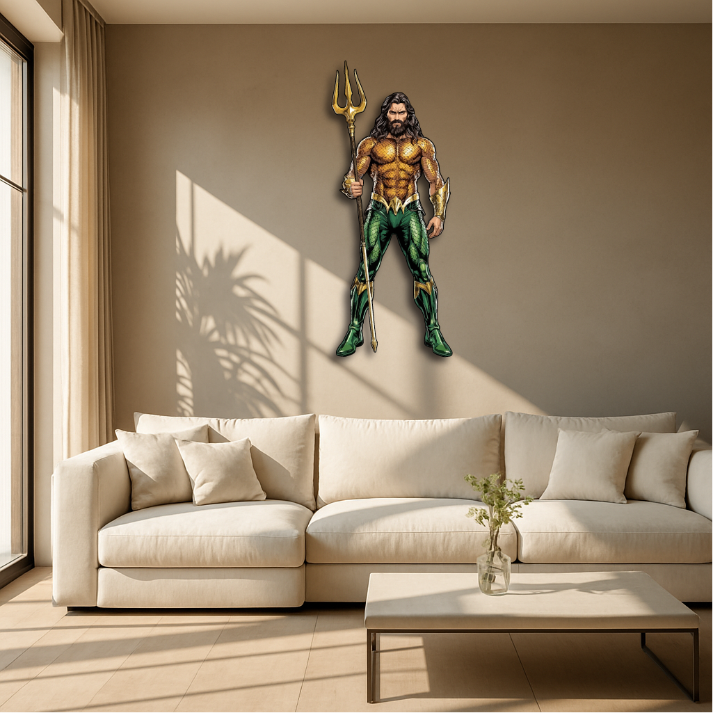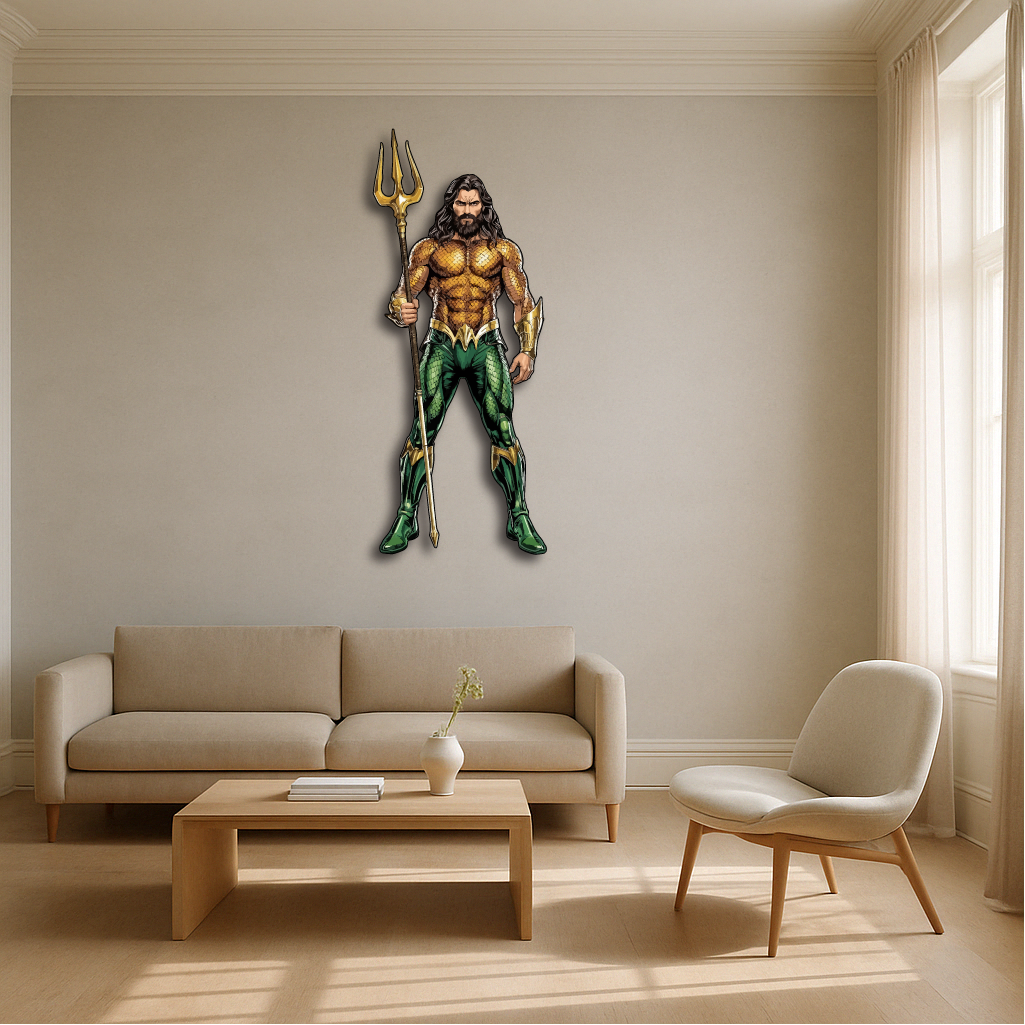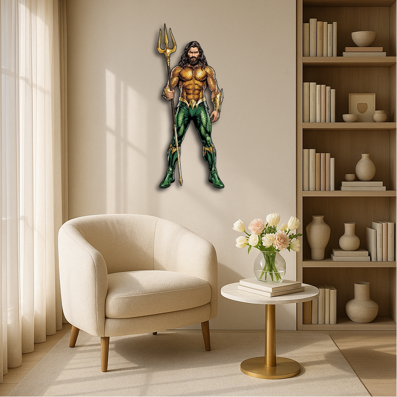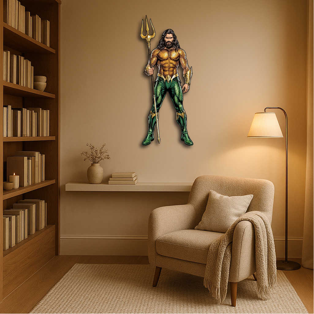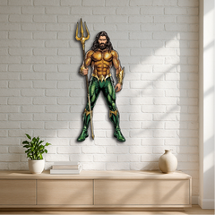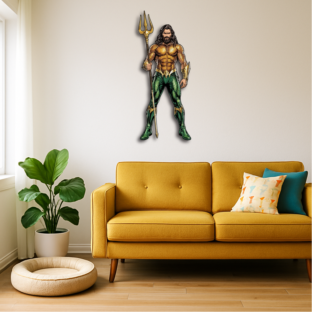 This bold and detailed piece showcases the legendary ocean hero holding his golden trident, symbolizing strength, justice, and the deep mysteries of the sea. Perfect for superhero fans, collectors, and anyone who loves a touch of epic energy in their décor.