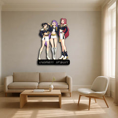 Featuring three fierce and stylish hunter girls standing side by side, this design symbolizes unity, strength, and bold attitude — perfect for anime lovers, gamers, and collectors who love powerful female characters.