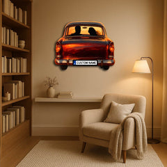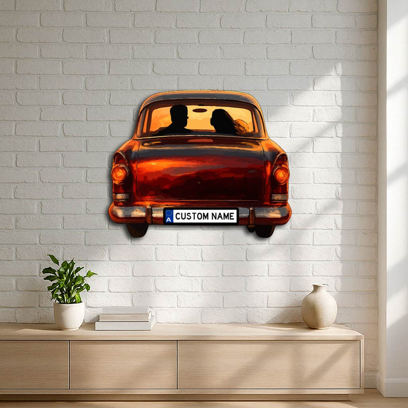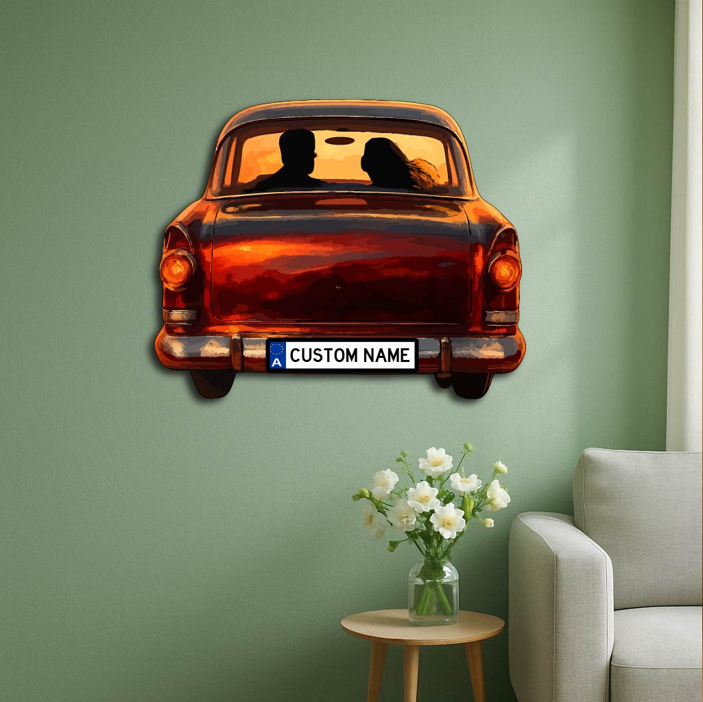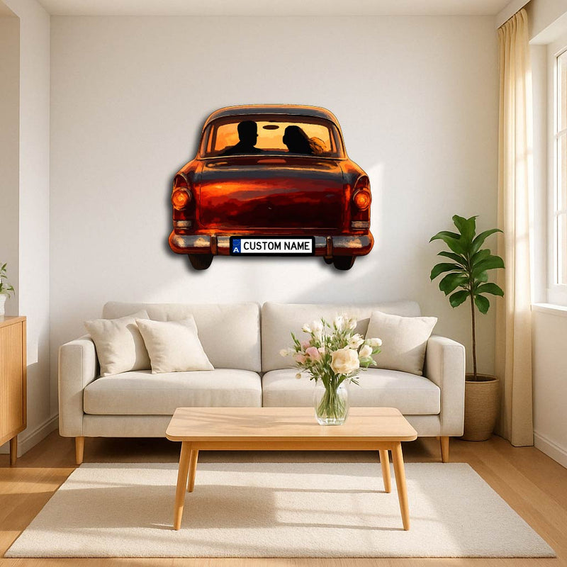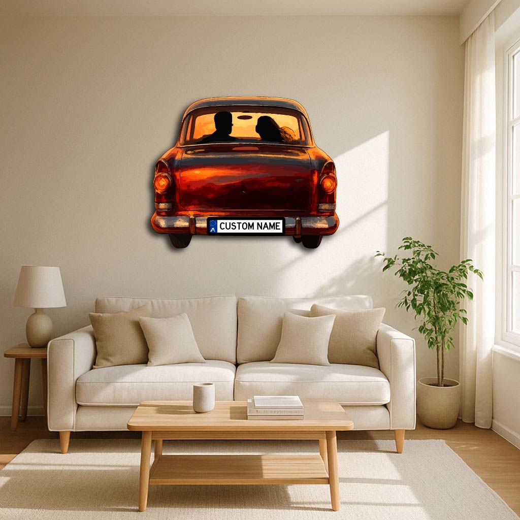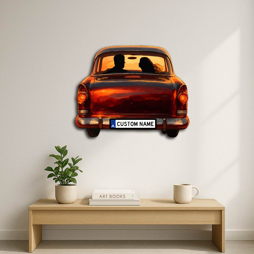 Capture the warmth of nostalgia and romance with our Personalized Vintage Car Couple Metal Wall Art. Featuring a charming silhouette of a couple in a classic car against a dreamy sunset backdrop, this piece brings emotion, artistry, and timeless beauty together. The customizable license plate adds a unique personal touch — perfect for couples, anniversaries, or wedding gifts.