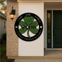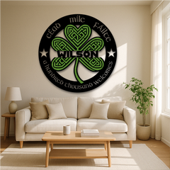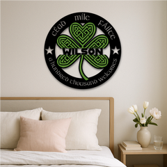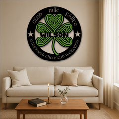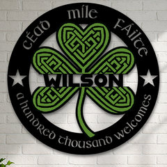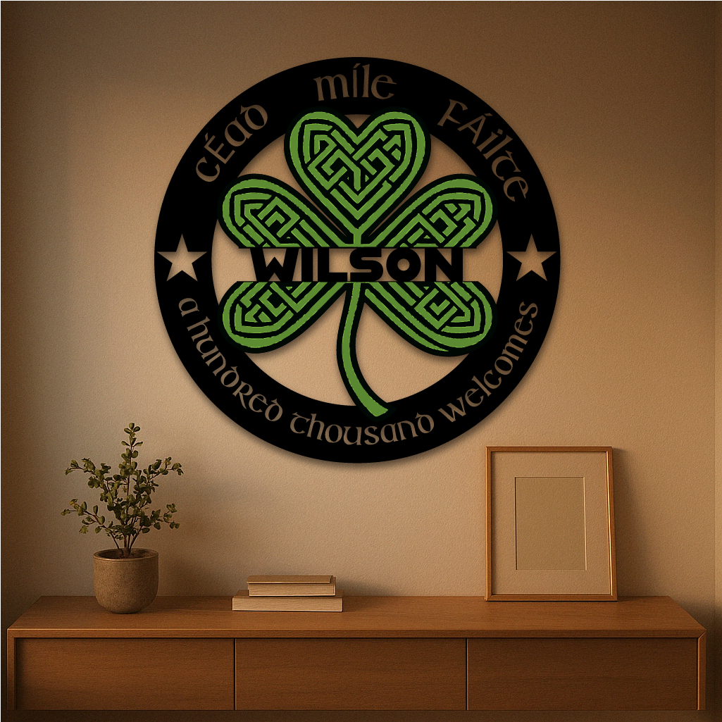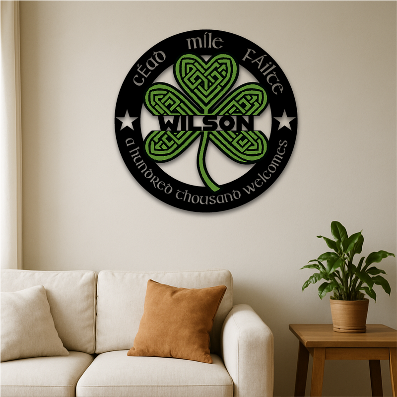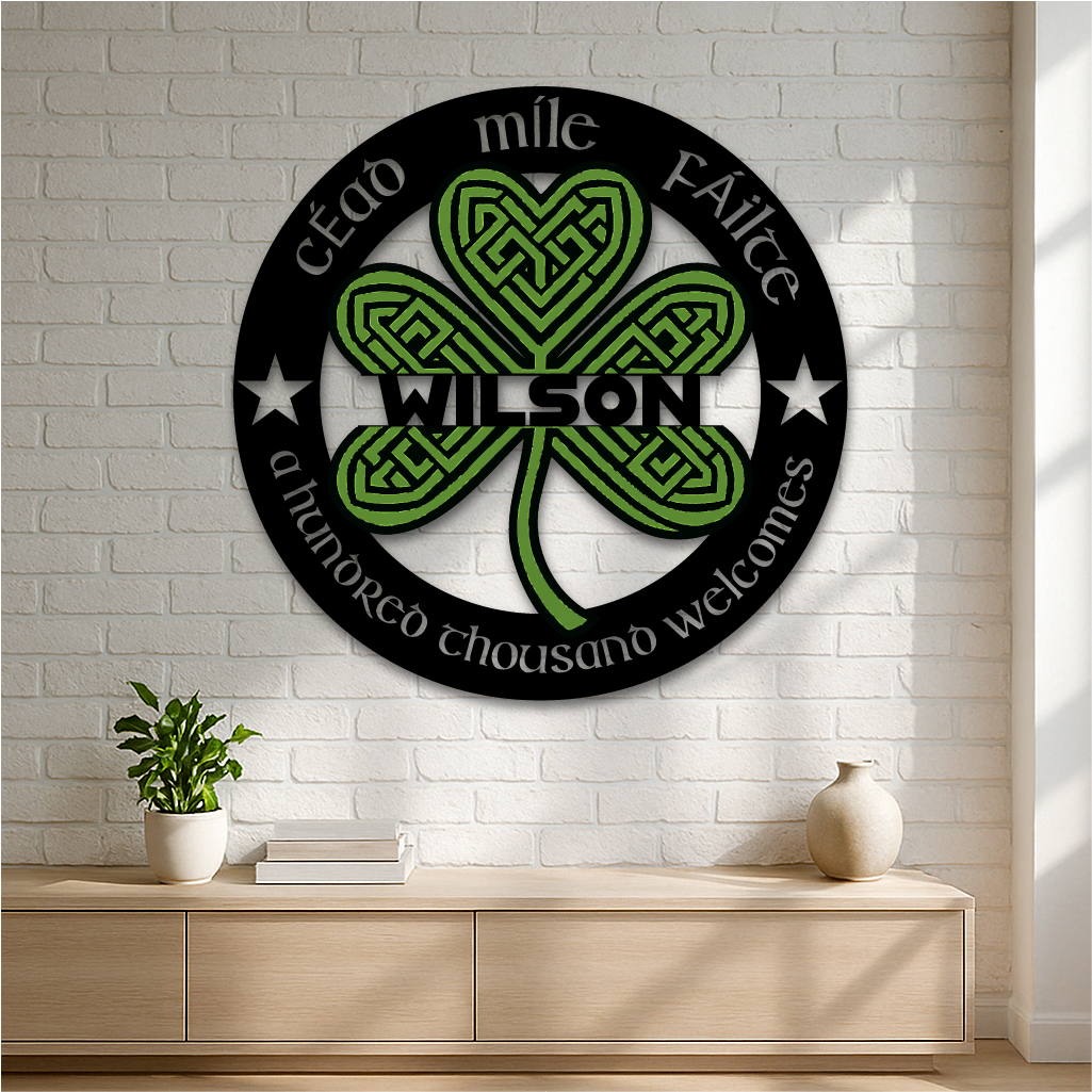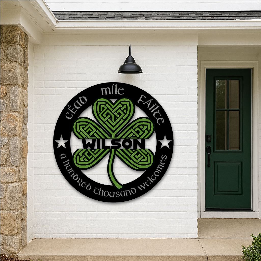 Celebrate Irish heritage and warmth with this Custom Celtic Shamrock Wall Sign, featuring an intricate green knotwork shamrock and the famous Irish greeting “Céad Míle Fáilte” meaning “A hundred thousand welcomes.” Add your family name in the center and hang it proudly in your home, garden, or front door to greet guests in true Irish fashion.