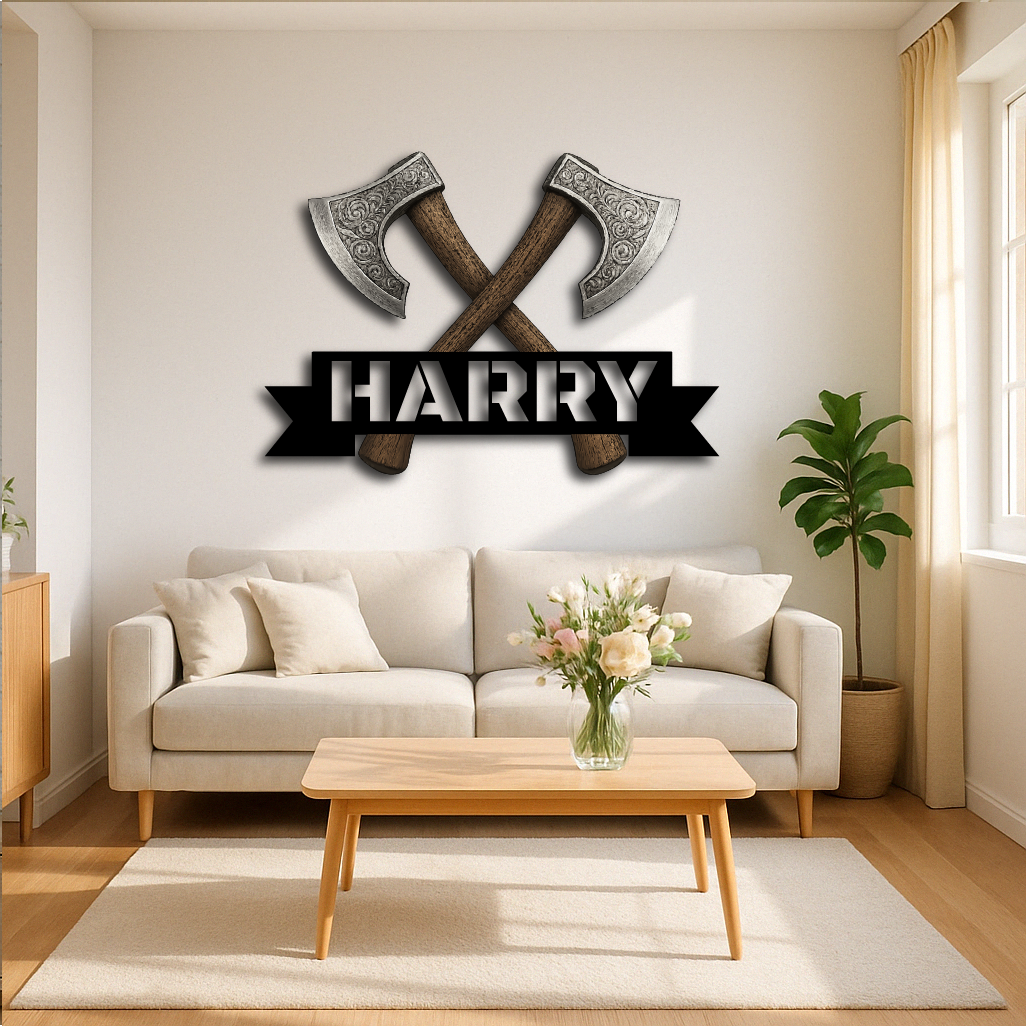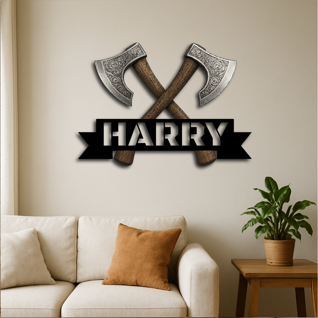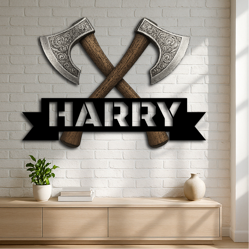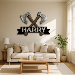 Bring strength and style to your space with our Personalized Viking Axe Metal Sign, featuring two intricately detailed crossed axes above your custom name. This bold and rugged design is perfect for adding a touch of warrior spirit to man caves, home bars, game rooms, or as a unique gift for history and Norse culture enthusiasts.