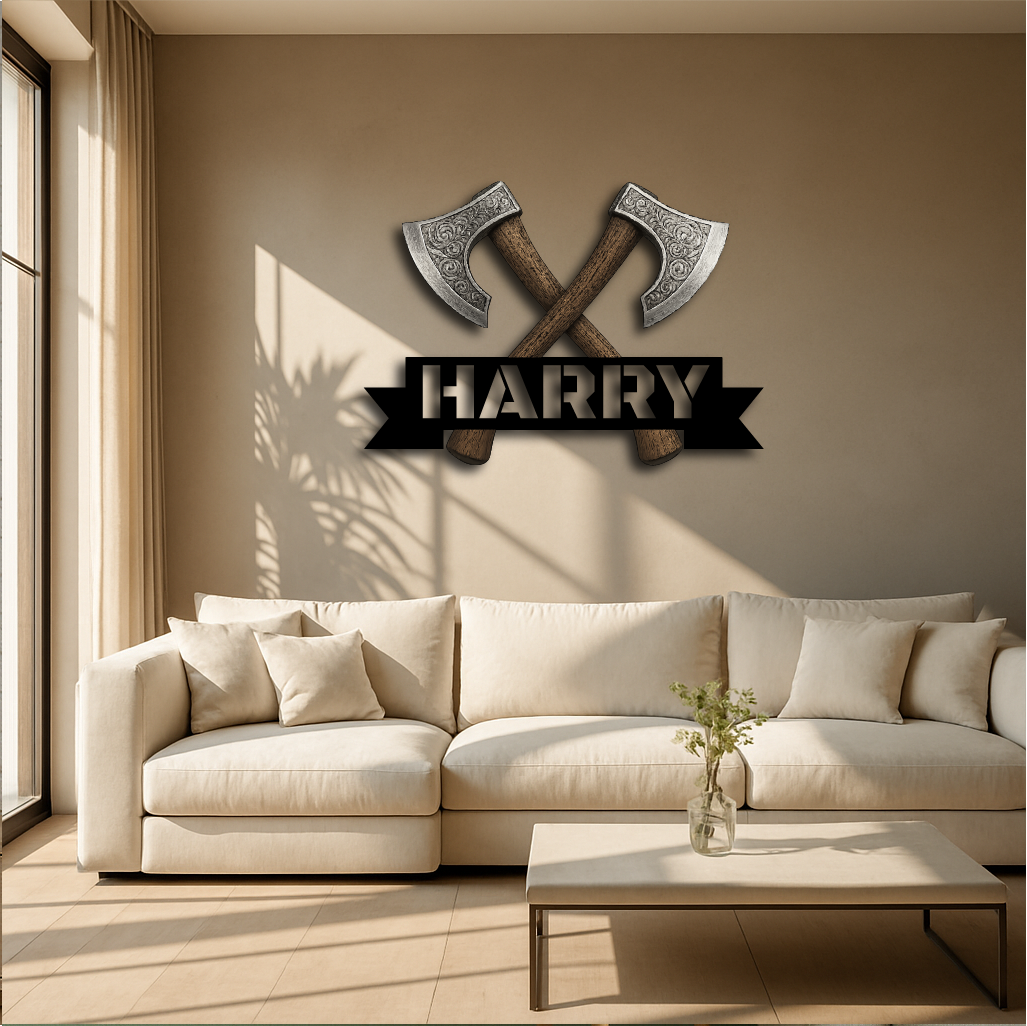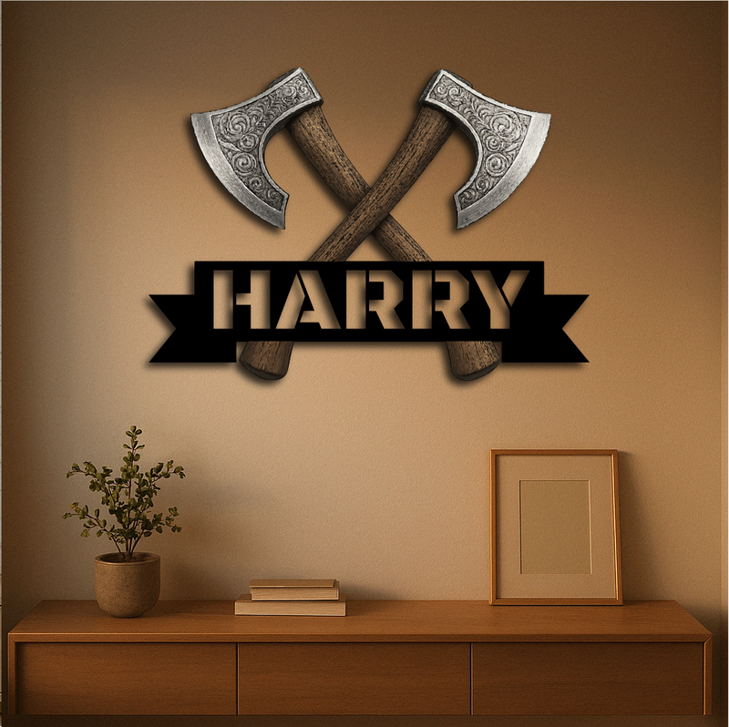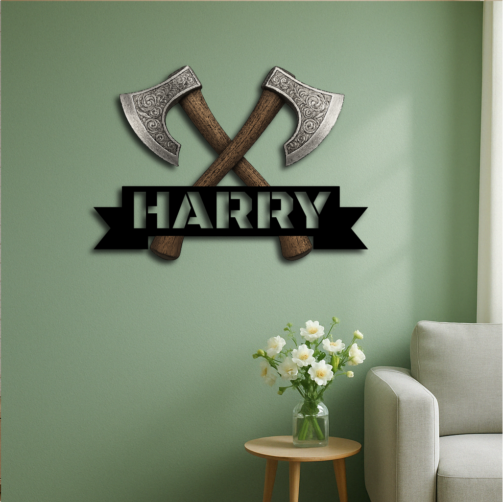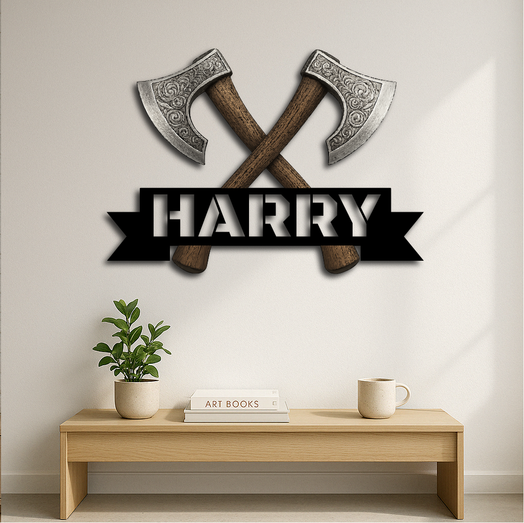 Bring strength and style to your space with our Personalized Viking Axe Metal Sign, featuring two intricately detailed crossed axes above your custom name. This bold and rugged design is perfect for adding a touch of warrior spirit to man caves, home bars, game rooms, or as a unique gift for history and Norse culture enthusiasts.