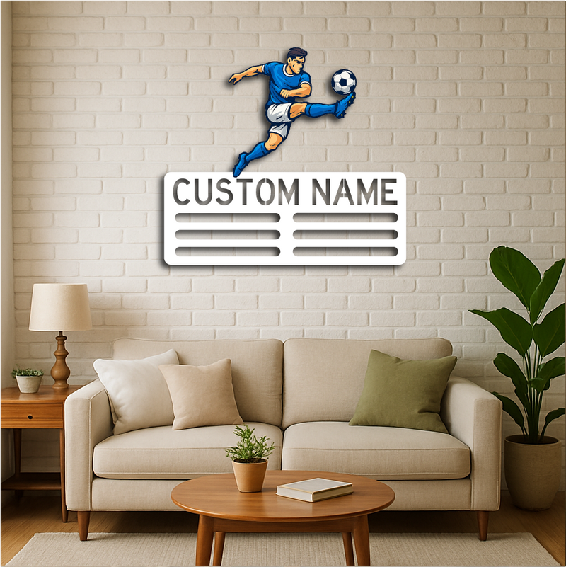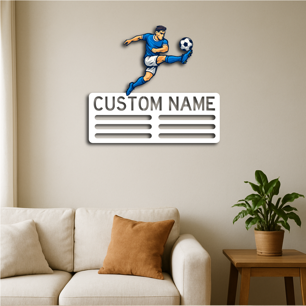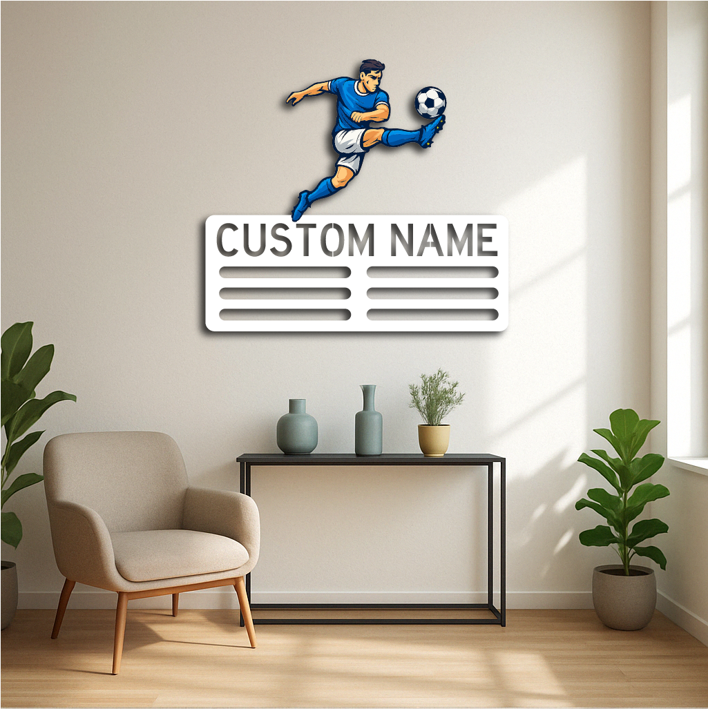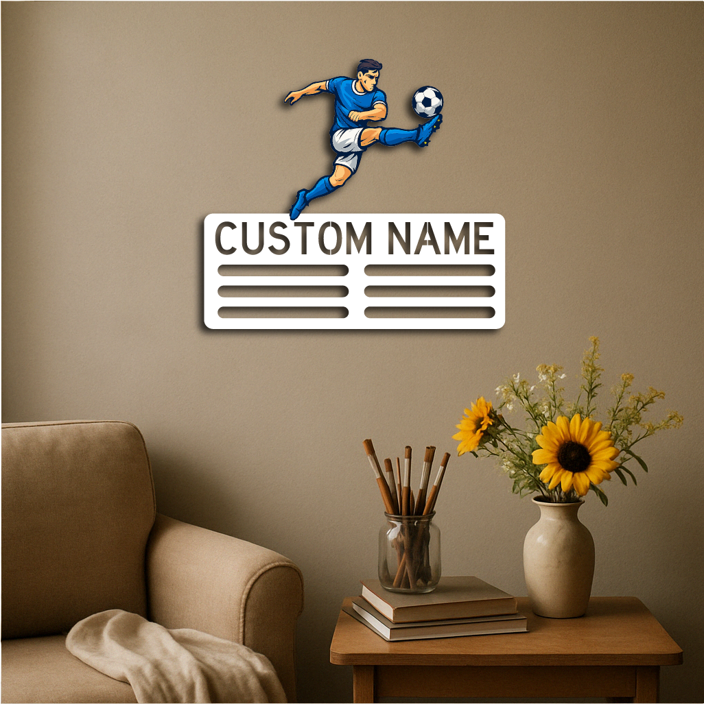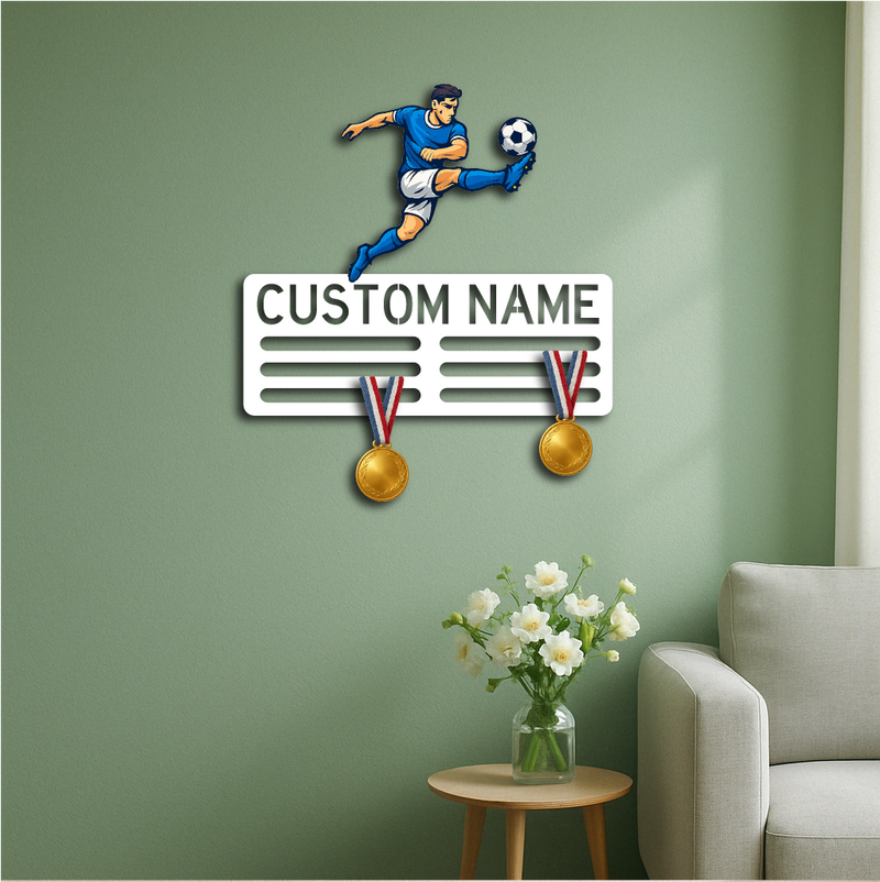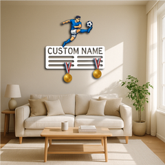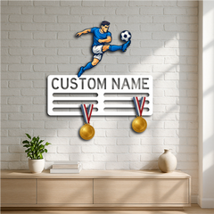 Showcase your love for the game and your achievements with our Personalized Soccer Medal Holder Metal Wall Rack, featuring a dynamic soccer player design and customizable name or text. Perfect for players of all ages, this medal holder combines sporty style with practical functionality.
