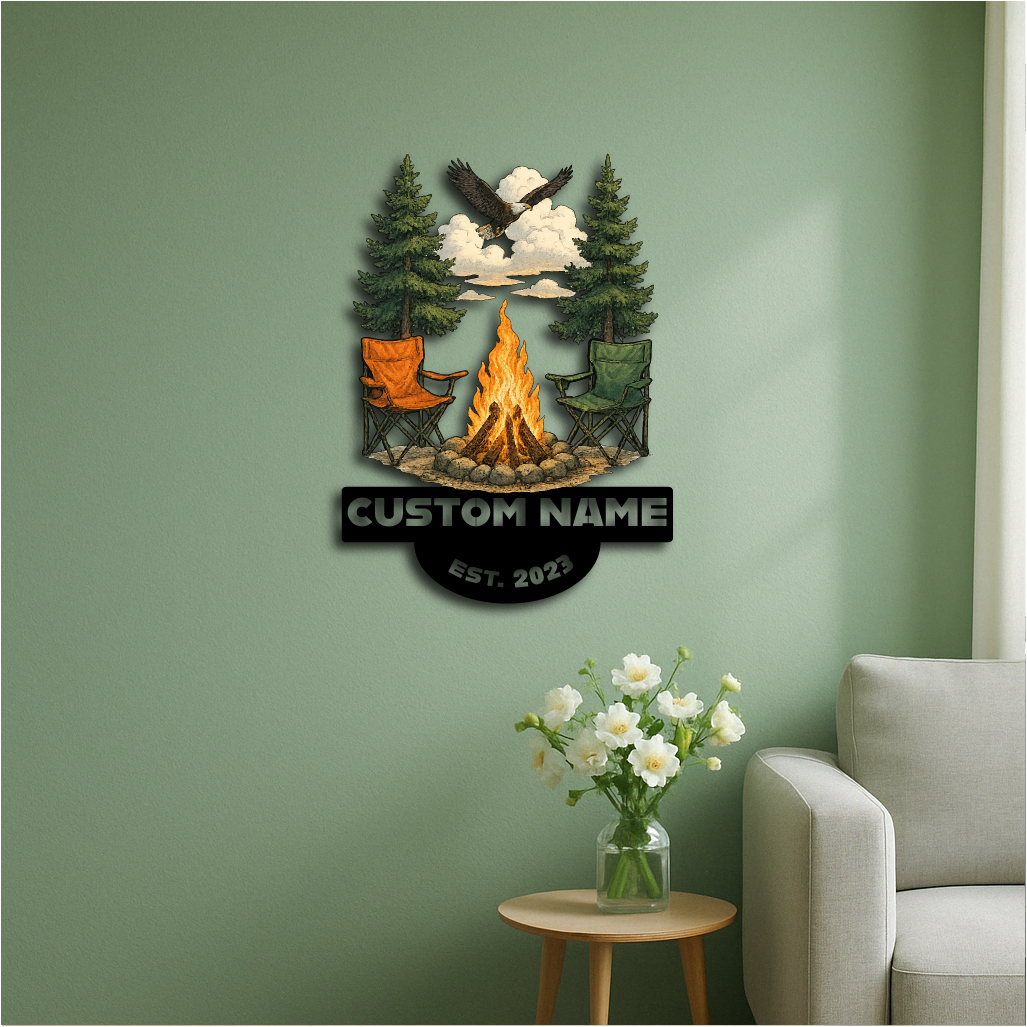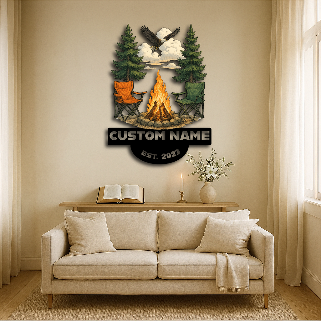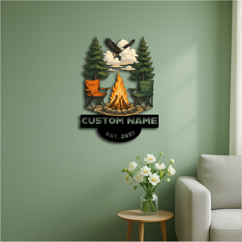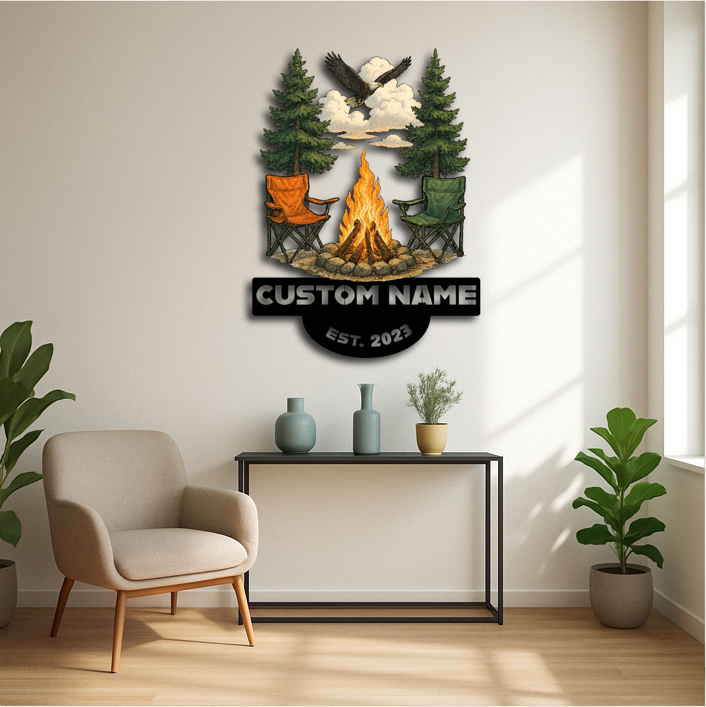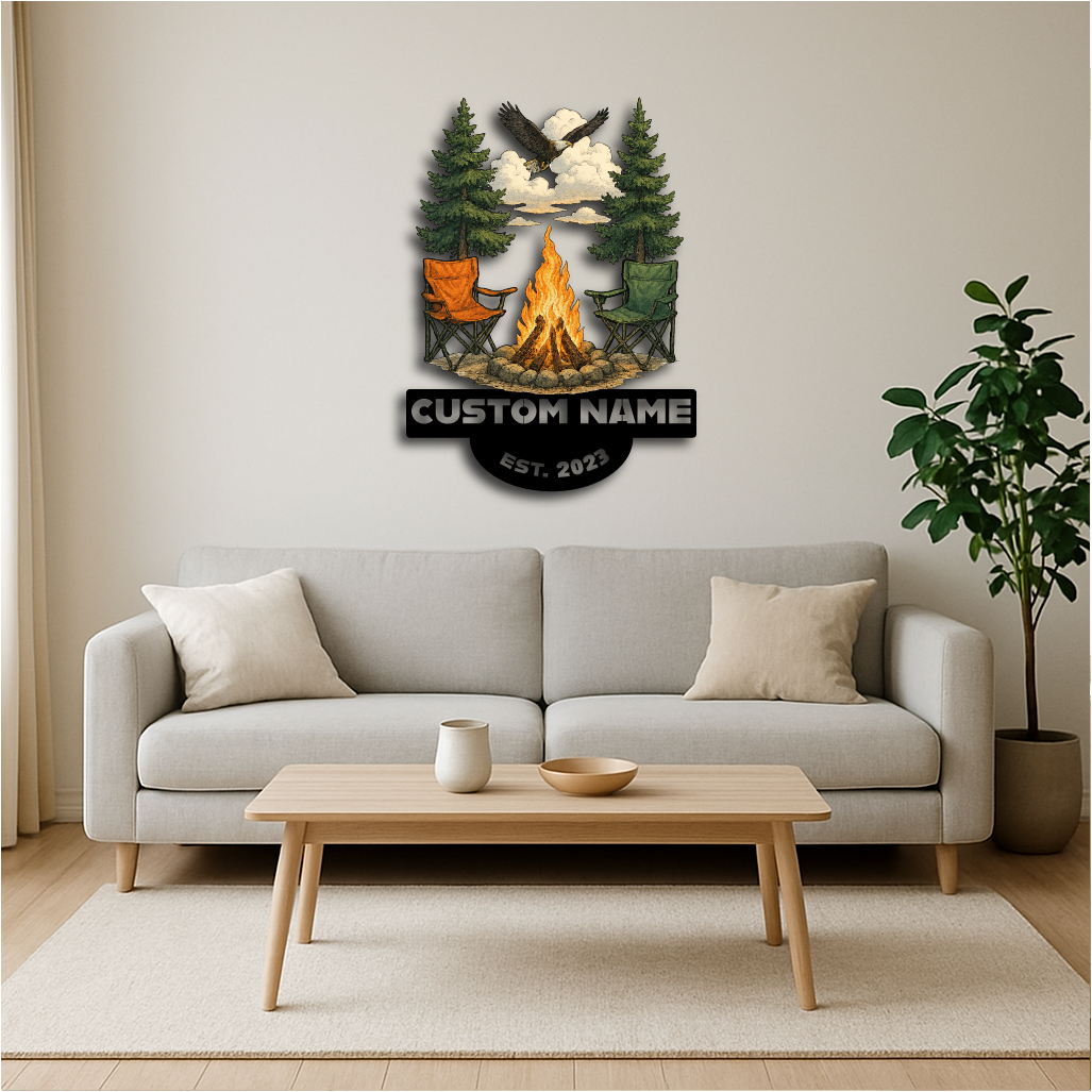 Bring the warmth of the great outdoors into your home with this Custom Campfire Scene Metal Wall Art. Featuring two camping chairs by a glowing campfire, framed by tall pine trees and an eagle soaring overhead, this piece captures the spirit of adventure and relaxation in nature. Personalize it with your own name and year for a truly unique keepsake.