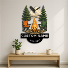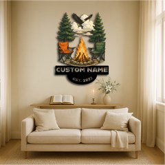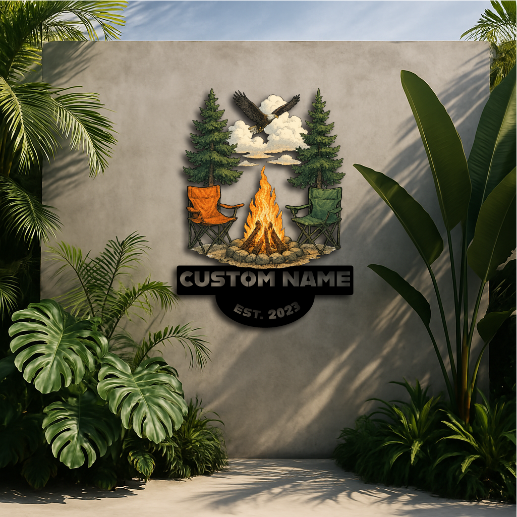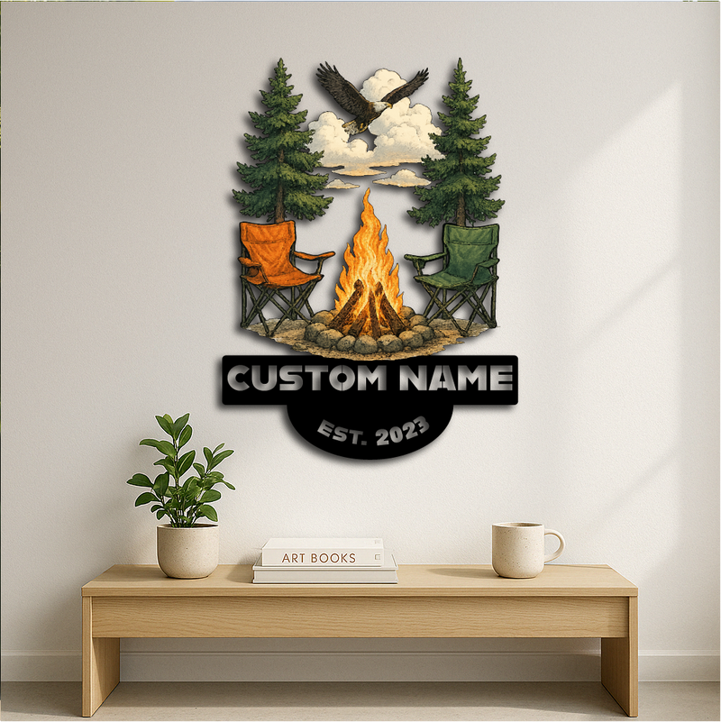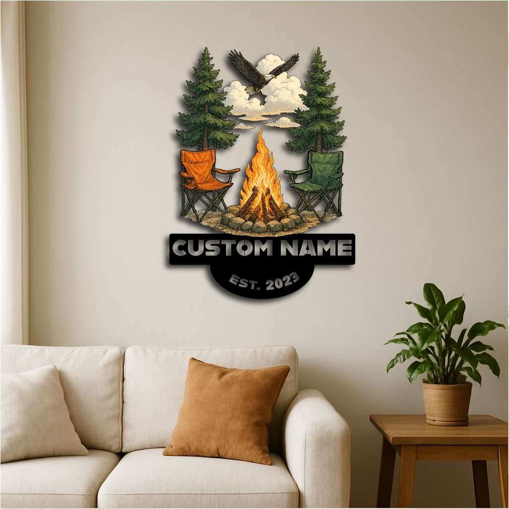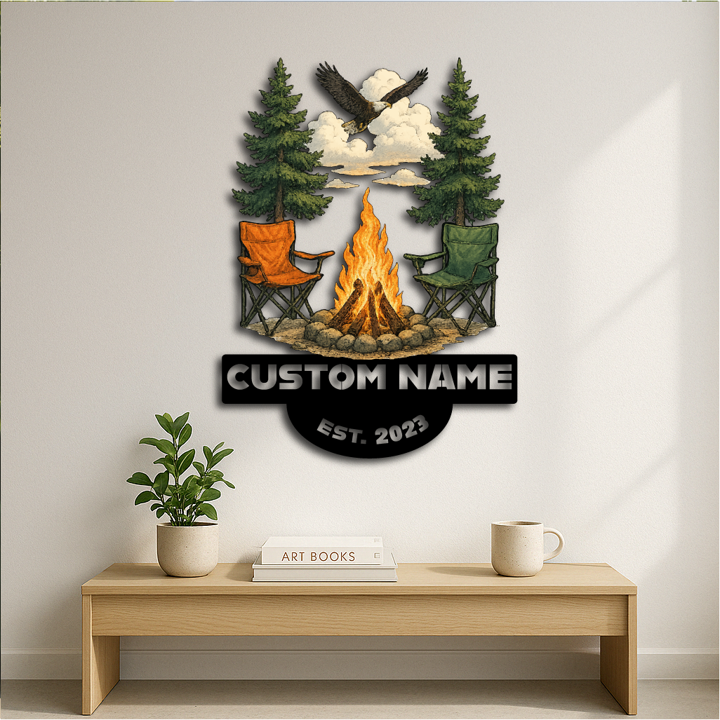 Bring the warmth of the great outdoors into your home with this Custom Campfire Scene Metal Wall Art. Featuring two camping chairs by a glowing campfire, framed by tall pine trees and an eagle soaring overhead, this piece captures the spirit of adventure and relaxation in nature. Personalize it with your own name and year for a truly unique keepsake.