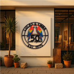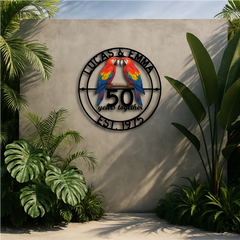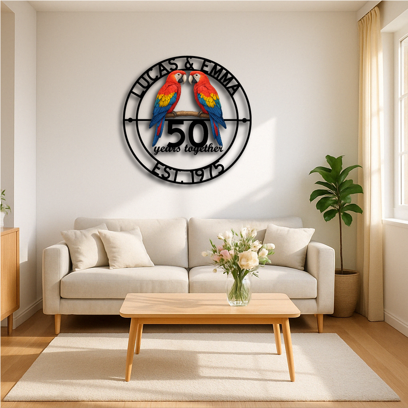 Celebrate love and togetherness with this Custom Parrot Couple Metal Wall Art. Featuring two vibrant macaws perched side by side, this design beautifully symbolizes companionship and loyalty. Personalized with names, anniversary years, and a heartfelt message, it’s the perfect keepsake for a special milestone.