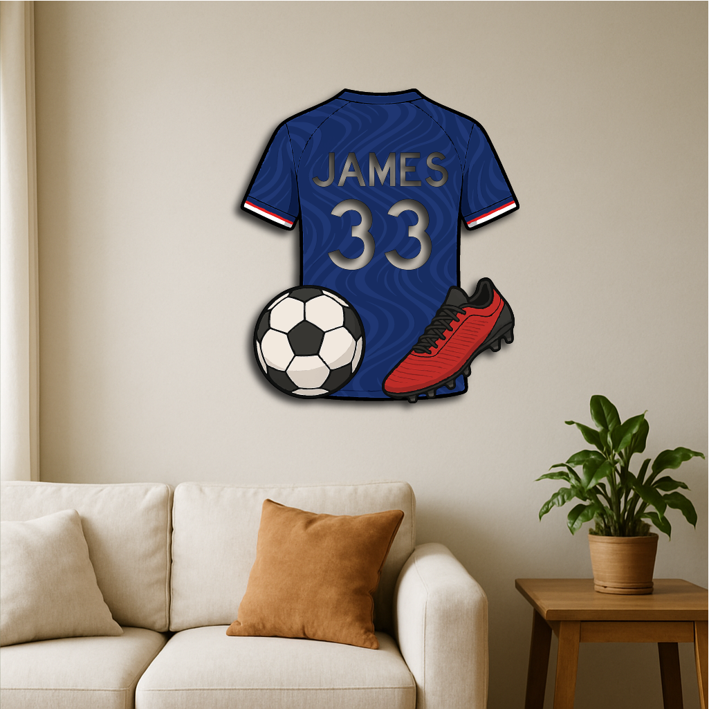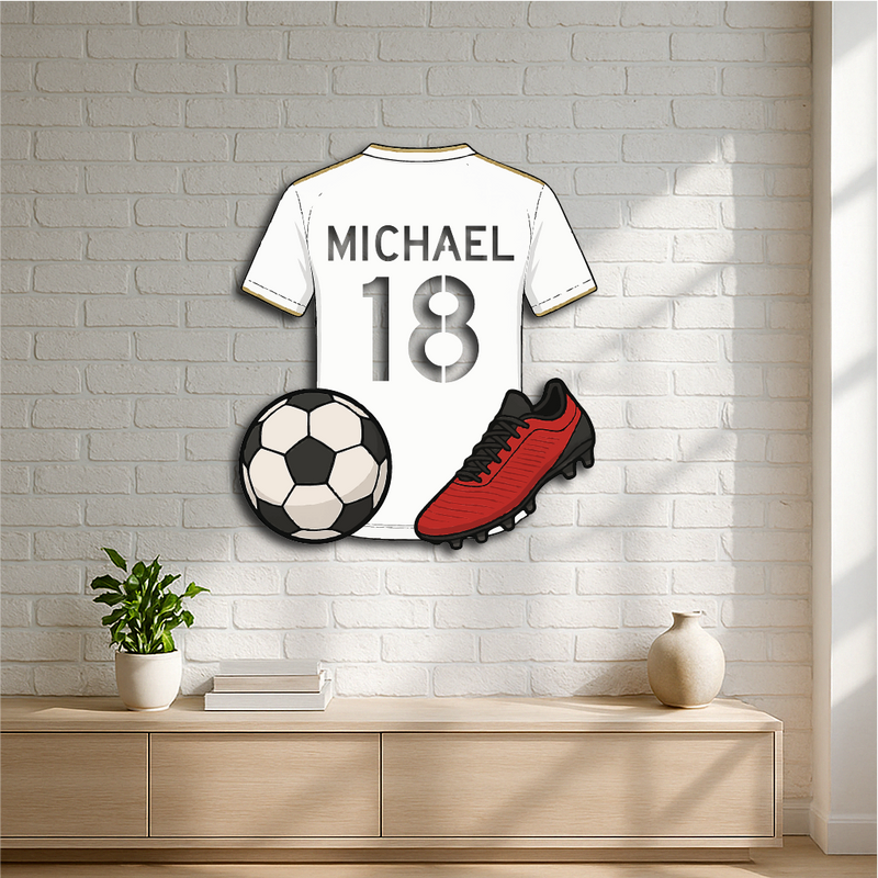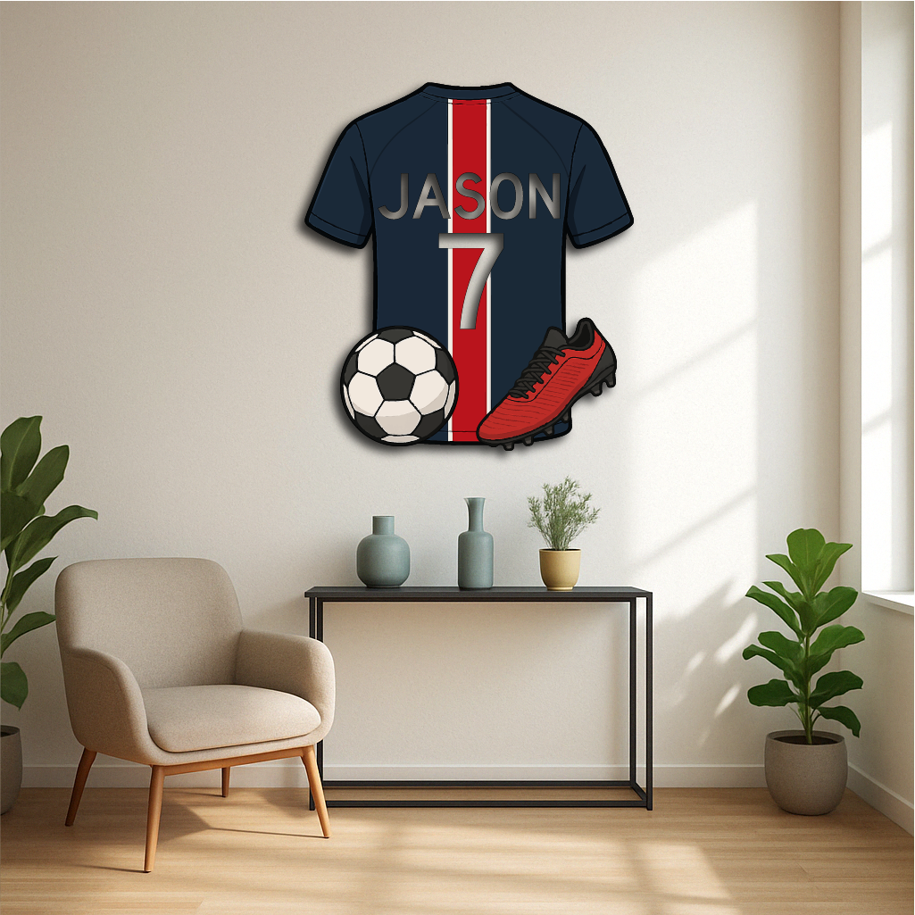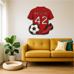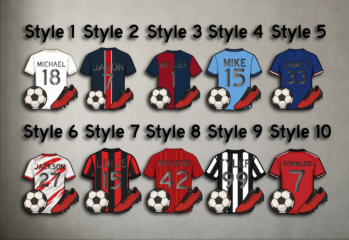 Show your love for the game with this Custom Soccer Jersey Metal Wall Art. Available in 10 different jersey styles, each piece features a soccer ball and cleats along with your personalized name and number. Whether for your favorite club, a gift for a player, or to decorate your own space, this wall art brings the spirit of soccer into any room.