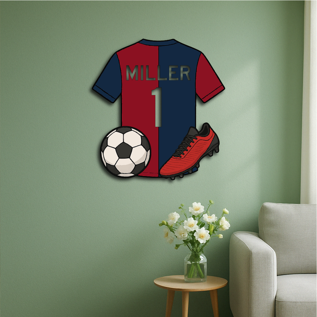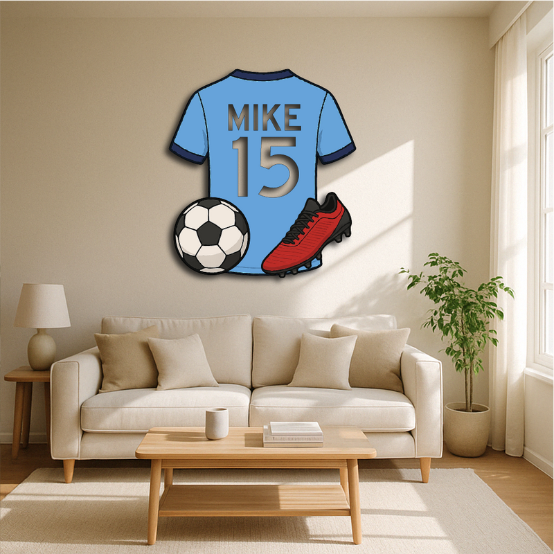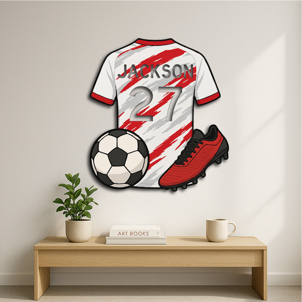Show your love for the game with this Custom Soccer Jersey Metal Wall Art. Available in 10 different jersey styles, each piece features a soccer ball and cleats along with your personalized name and number. Whether for your favorite club, a gift for a player, or to decorate your own space, this wall art brings the spirit of soccer into any room.