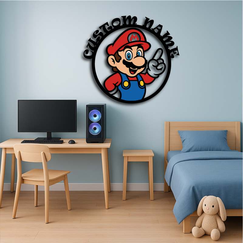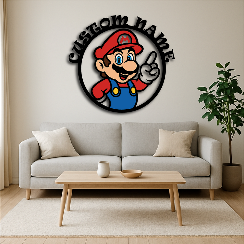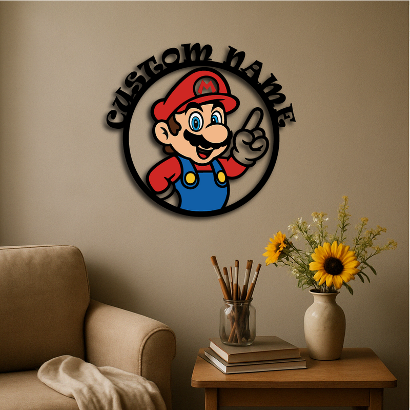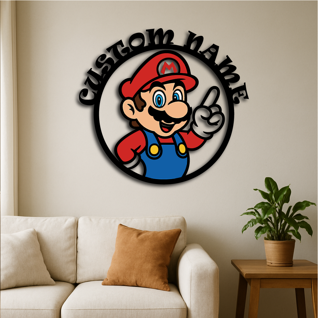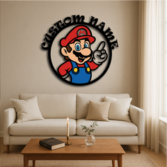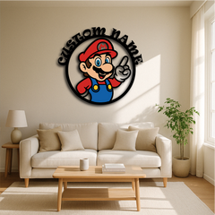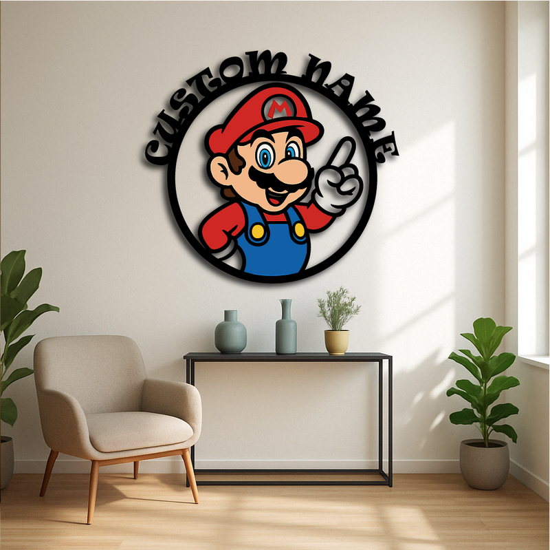 Level up your décor with this Super Mario Metal Wall Art. Featuring the iconic Mario in his classic red hat and blue overalls, this fun and colorful design includes a customizable name section, making it perfect for gamers of all ages.