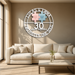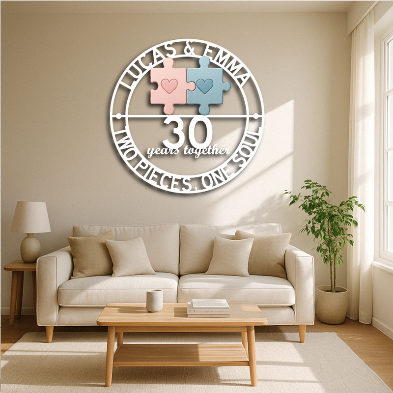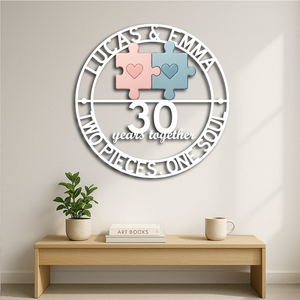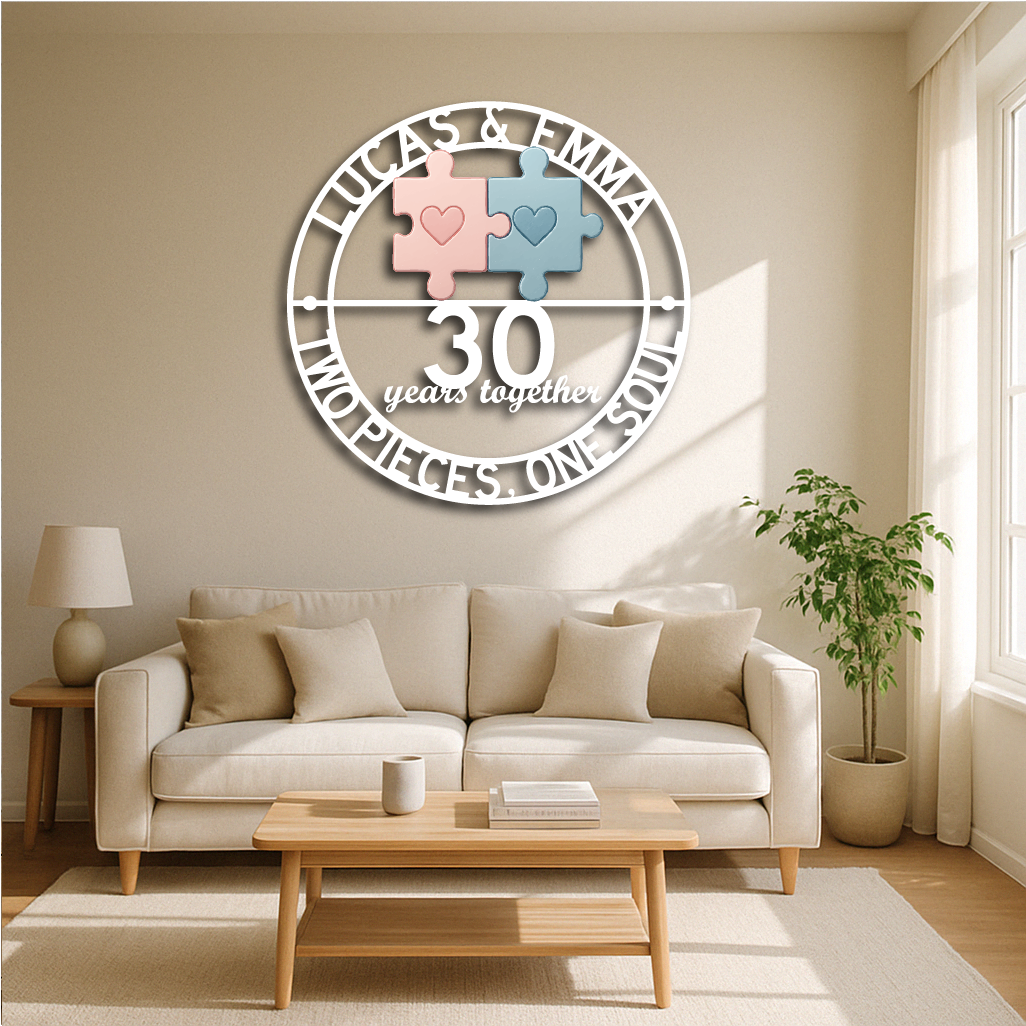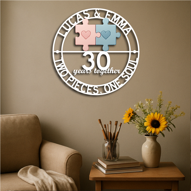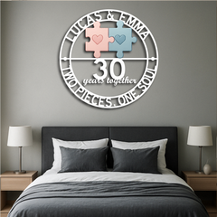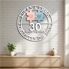 Celebrate your love and connection with our Personalized Puzzle Piece Anniversary Metal Sign, featuring two interlocking puzzle pieces in soft pastel colors, each with a heart cutout. This round, elegant design can be customized with your names and the year you began your journey together, making it the perfect gift for anniversaries, weddings, or vow renewals.
