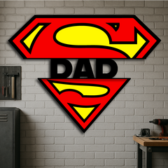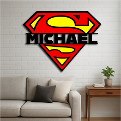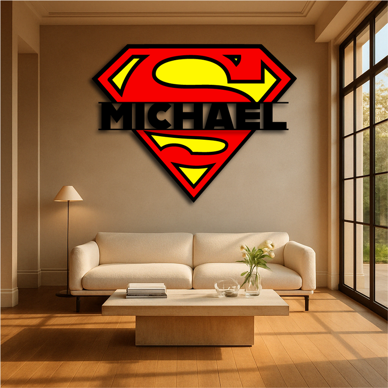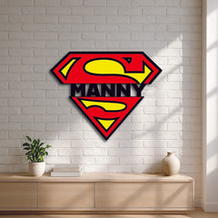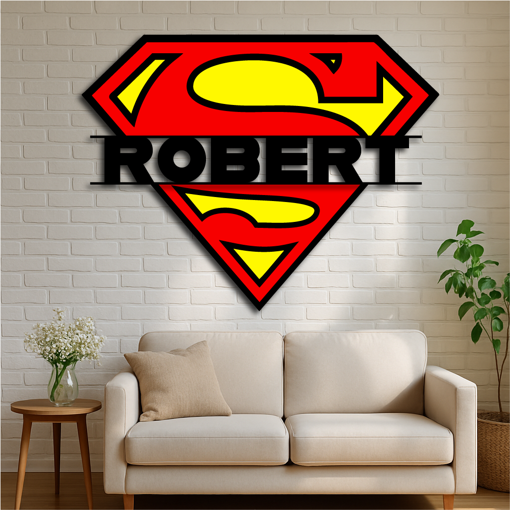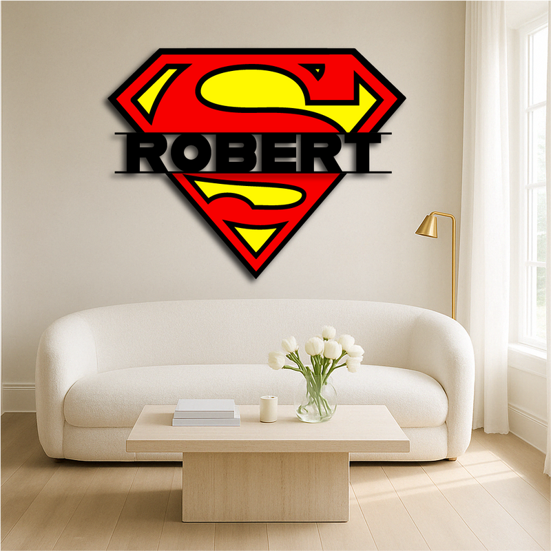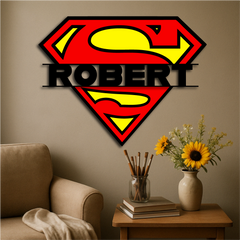 Bring bold superhero energy to any space with this Custom Superman Shield Metal Wall Sign. Designed in the unmistakable "S" emblem style with vibrant red and yellow, this wall decor makes anyone feel like a hero in their own home. The center nameplate allows you to add your name, your dad’s, or even a fun title like “Super Dad,” “Hero,” or “Captain Jake.”