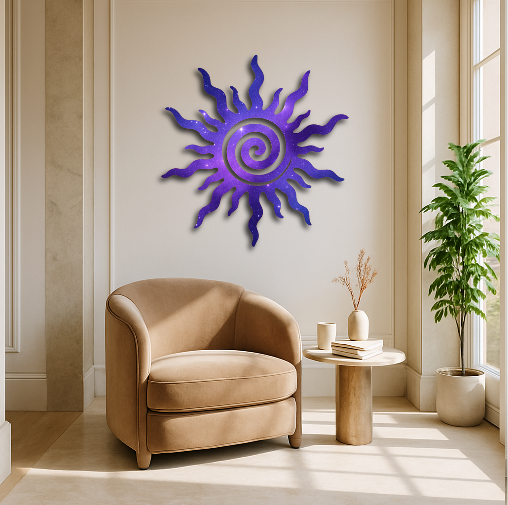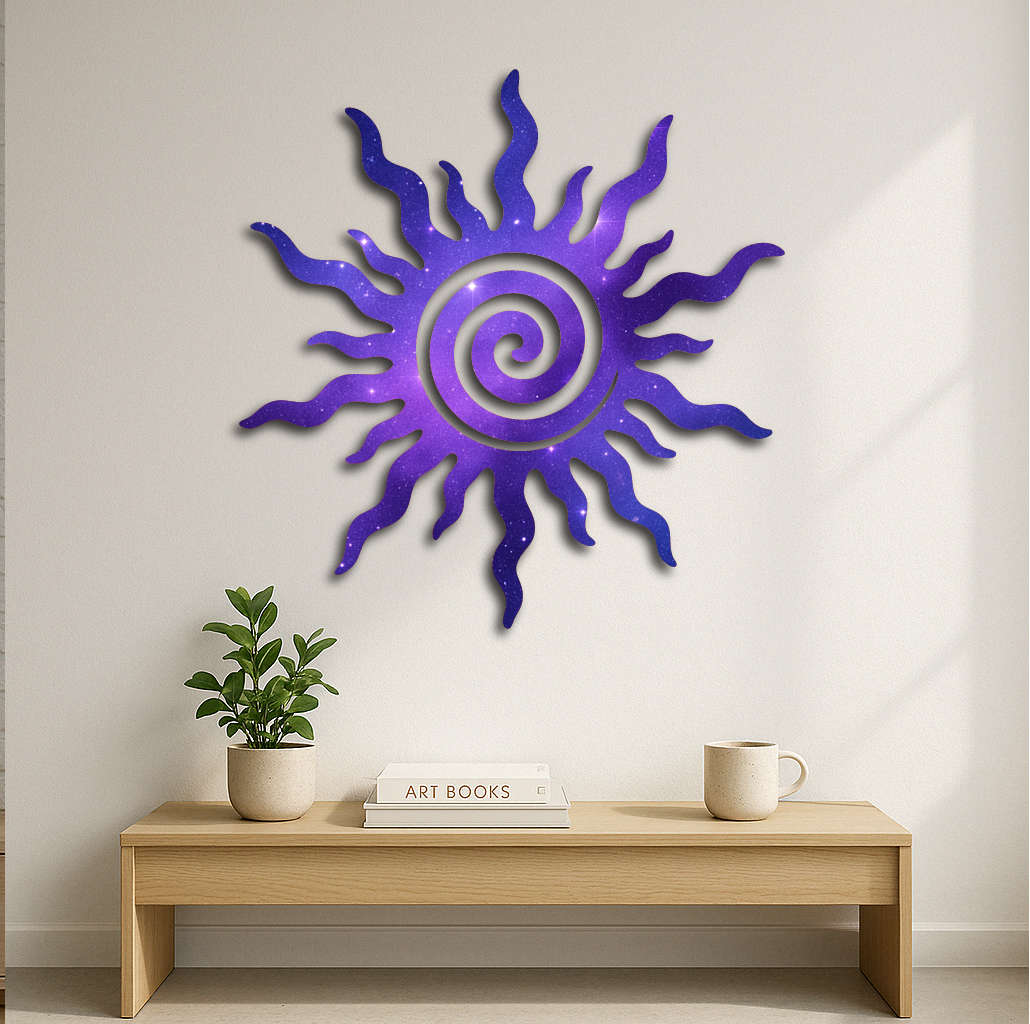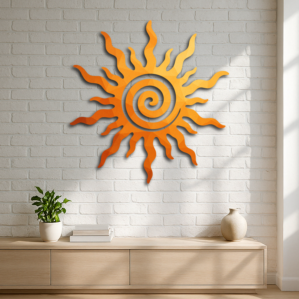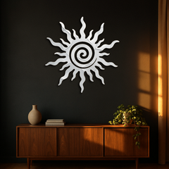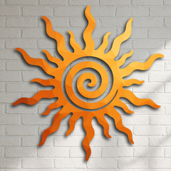 Whether you're decorating a patio, yoga studio, hallway, or living room, this radiant spiral sun brings bold character and cosmic charm to any space.