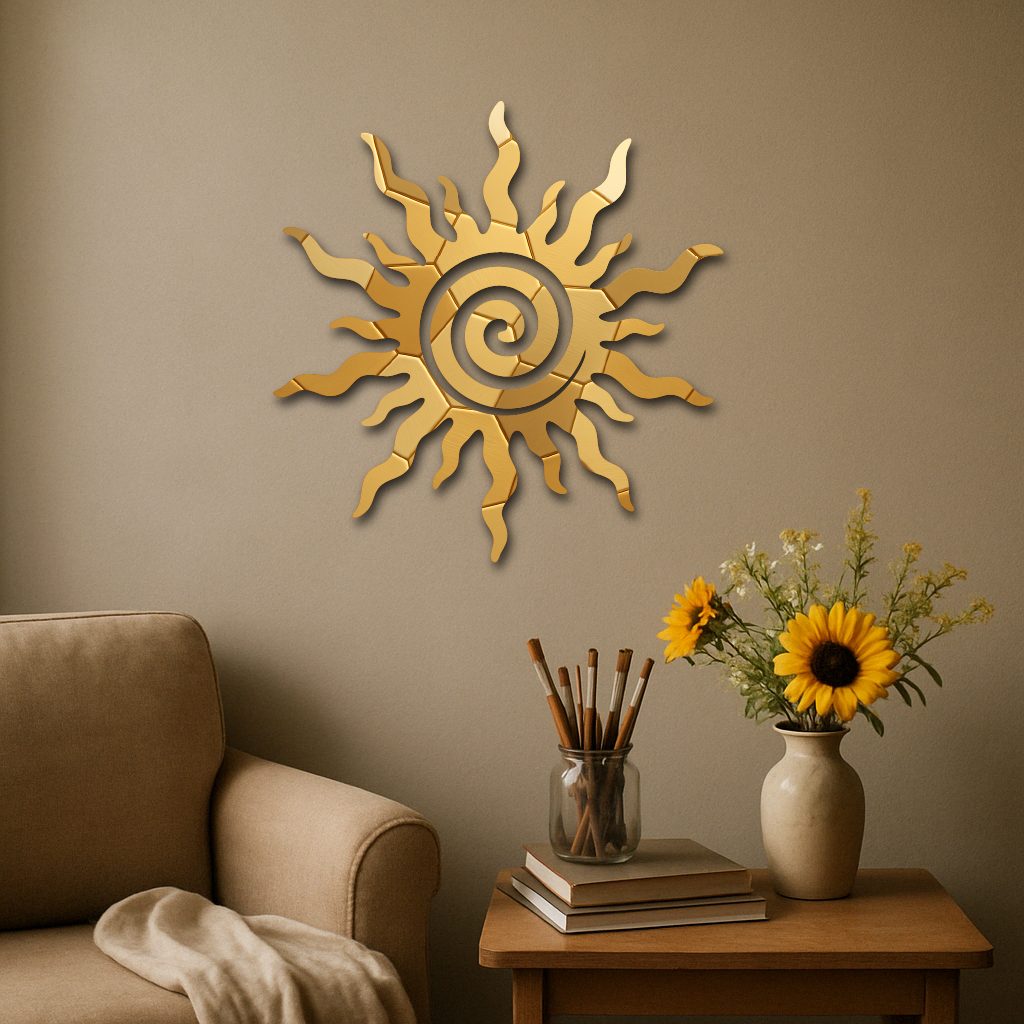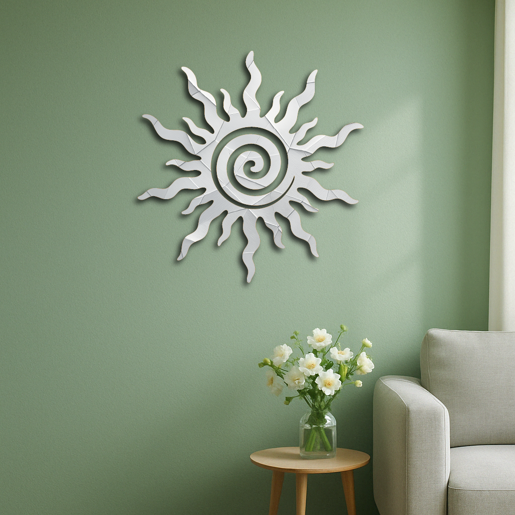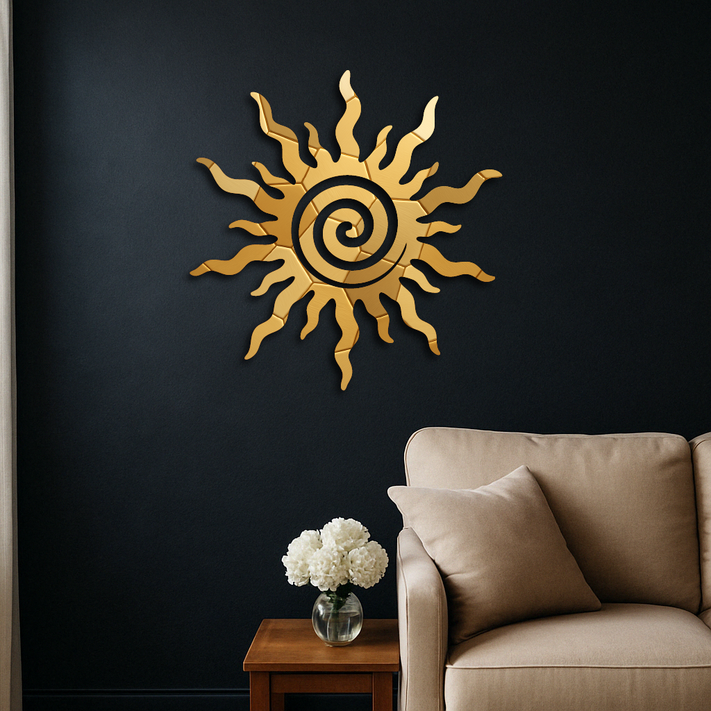 Whether you're decorating a patio, yoga studio, hallway, or living room, this radiant spiral sun brings bold character and cosmic charm to any space.