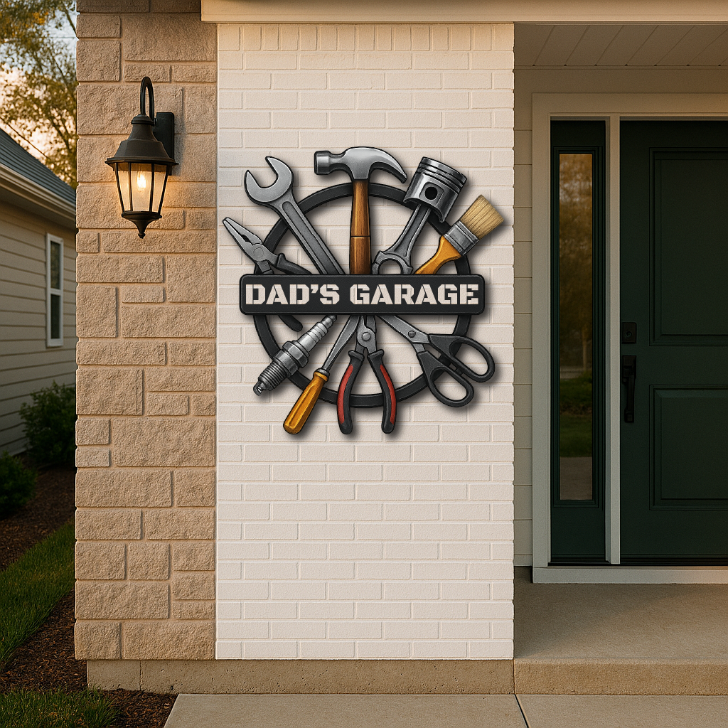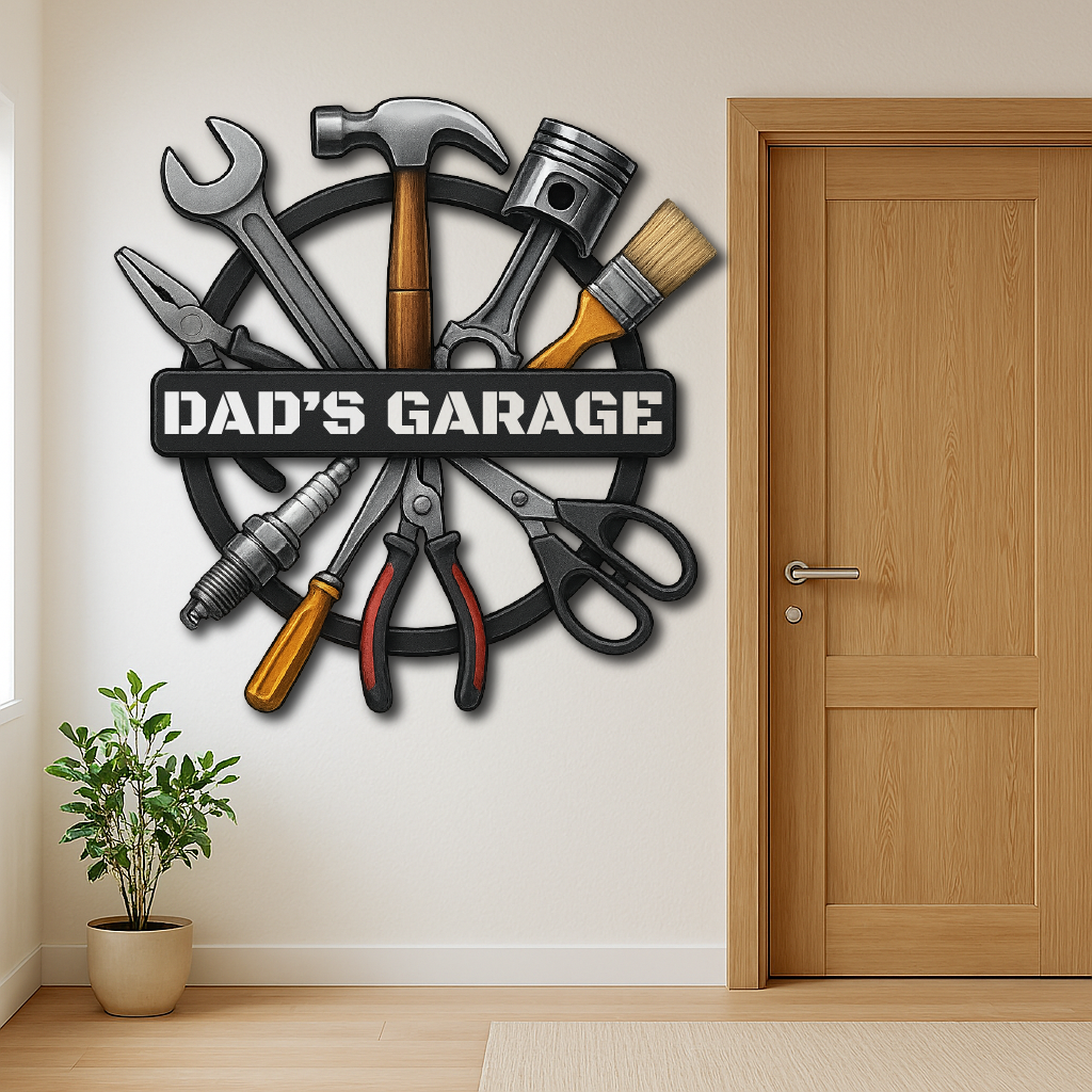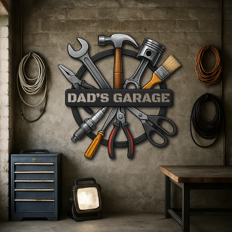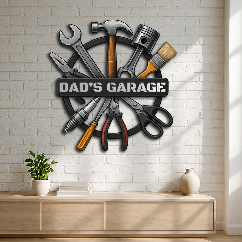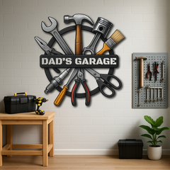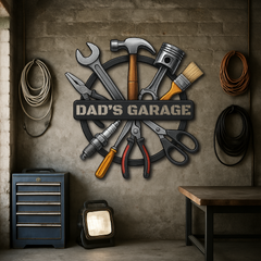 Turn any garage into a sanctuary of craftsmanship with this striking Dad’s Garage Custom Metal Sign. Featuring a dynamic circular layout of classic tools — from hammer to spark plug — this artwork brings together the spirit of fixing, building, and creating. Whether it's your dad, grandpa, or a DIY hero in your life, this sign instantly gives their workspace personality and pride.