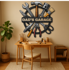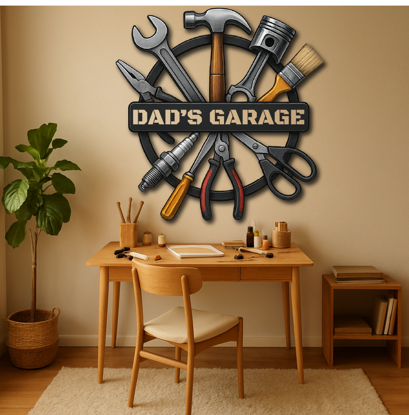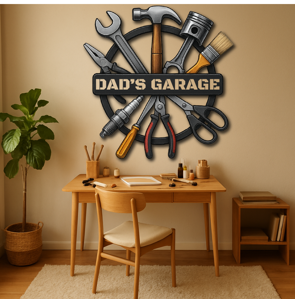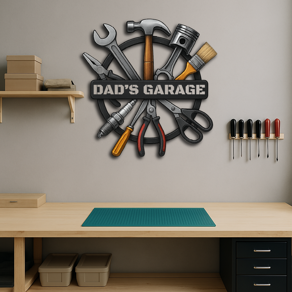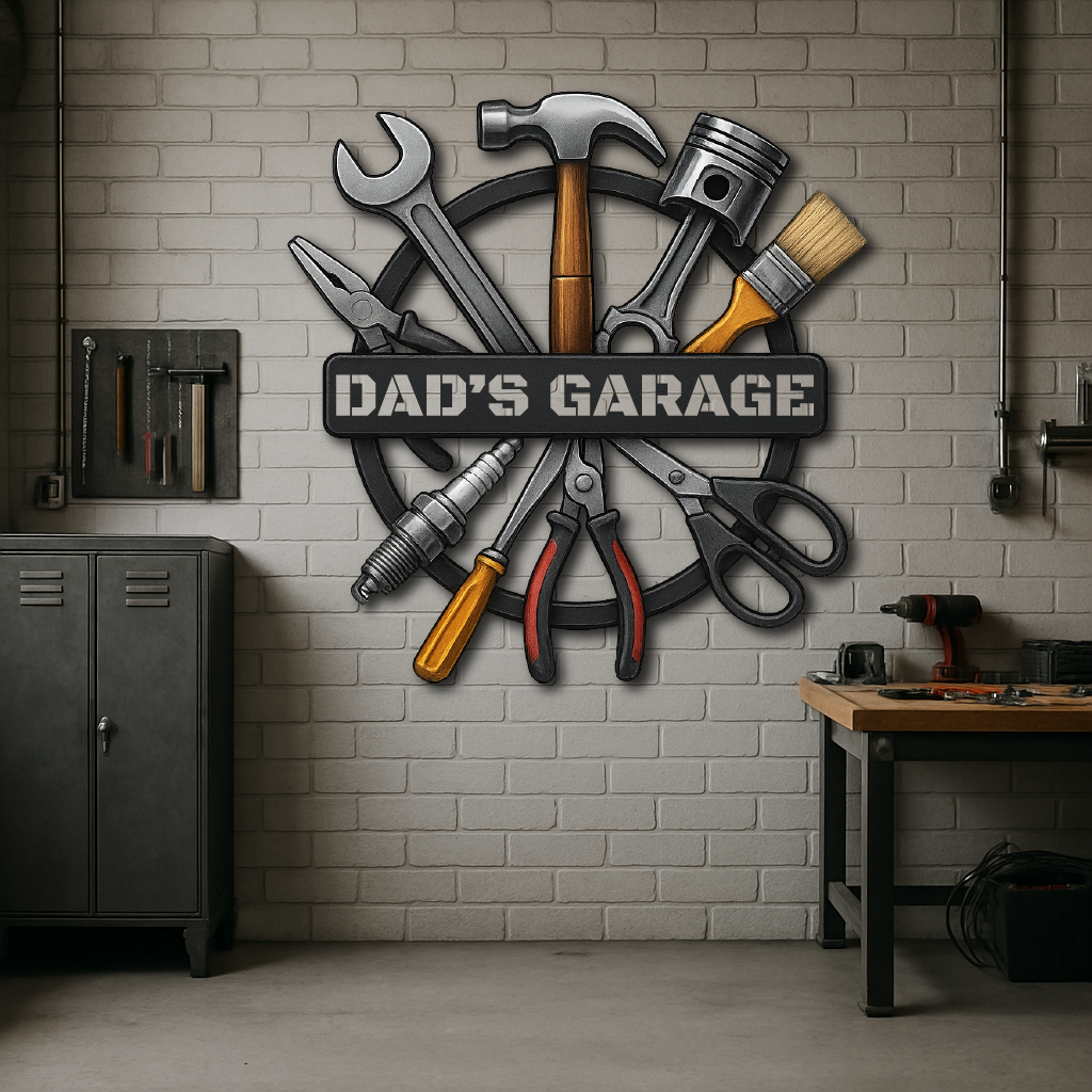 Turn any garage into a sanctuary of craftsmanship with this striking Dad’s Garage Custom Metal Sign. Featuring a dynamic circular layout of classic tools — from hammer to spark plug — this artwork brings together the spirit of fixing, building, and creating. Whether it's your dad, grandpa, or a DIY hero in your life, this sign instantly gives their workspace personality and pride.