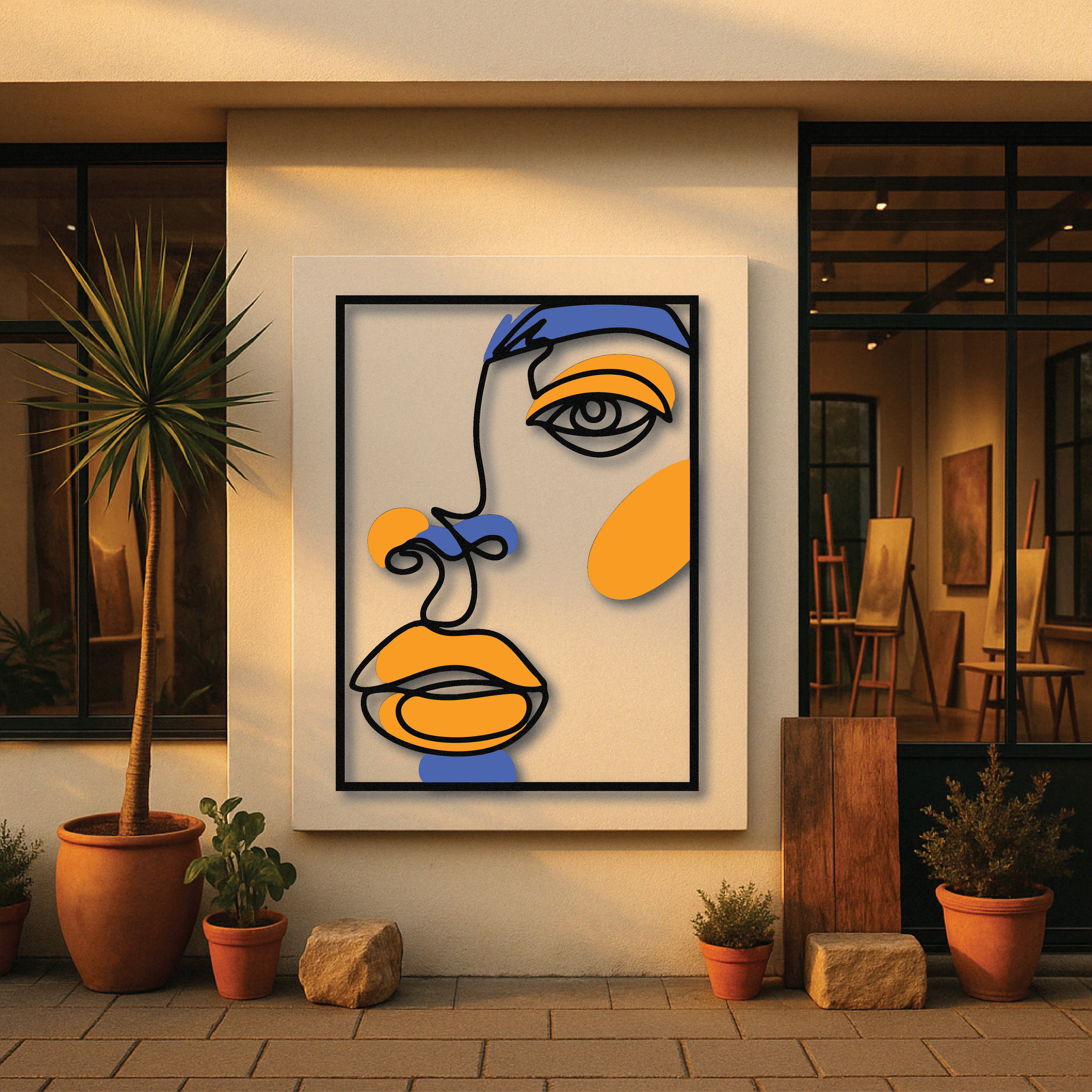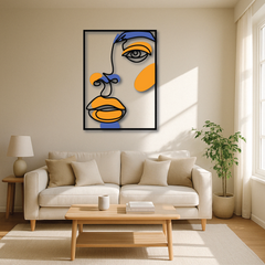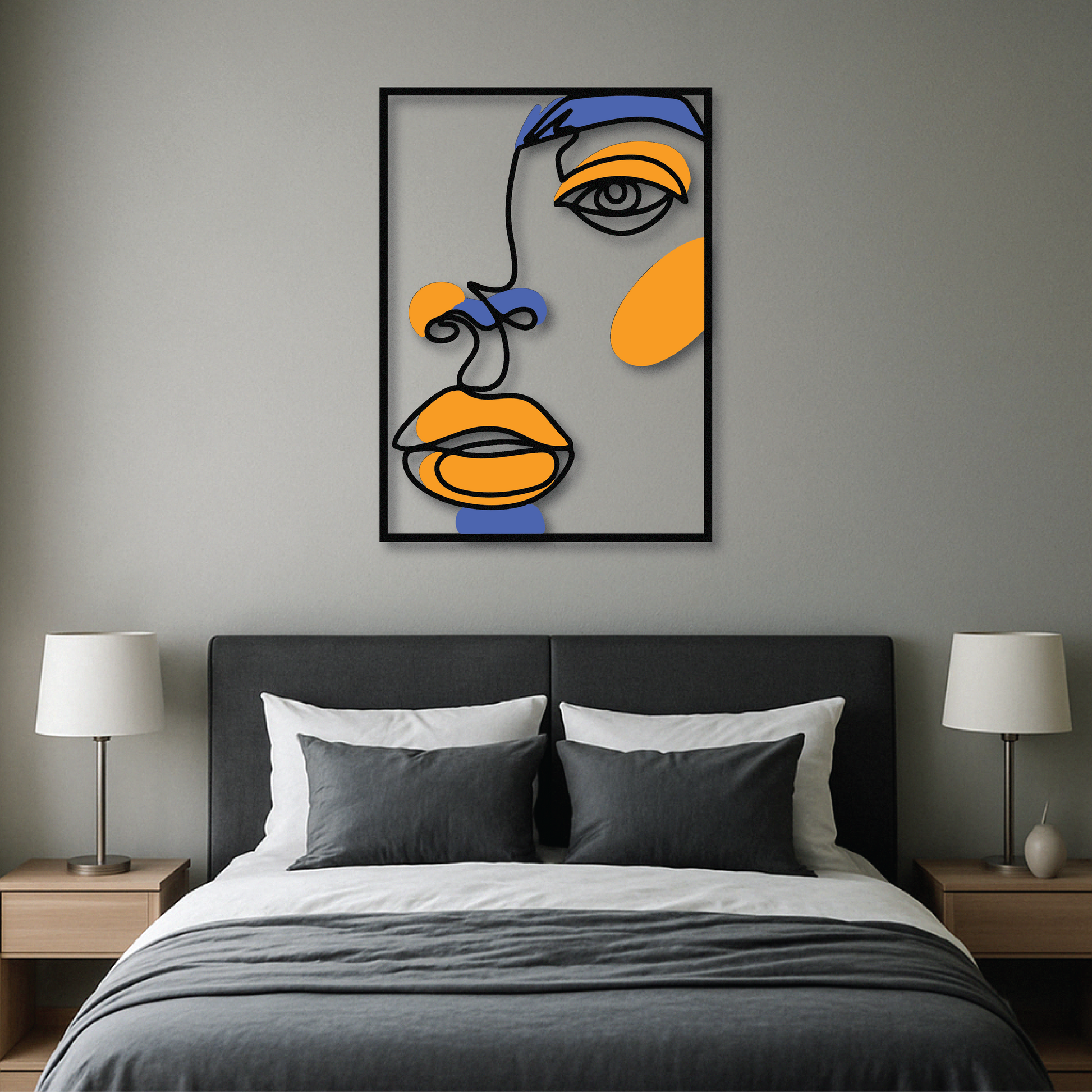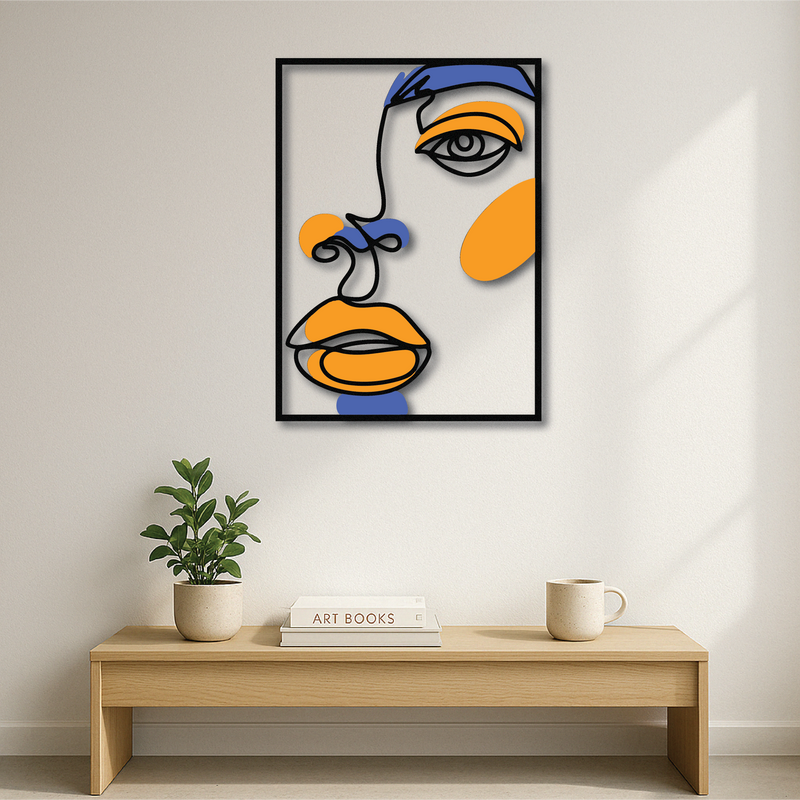 Elevate your space with this modern abstract face wall art, crafted entirely from durable metal and UV-printed in vivid, lasting colors. Featuring a bold line art style with pops of orange and blue, this piece adds a clean, contemporary vibe to any room.