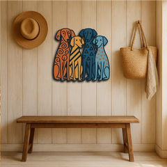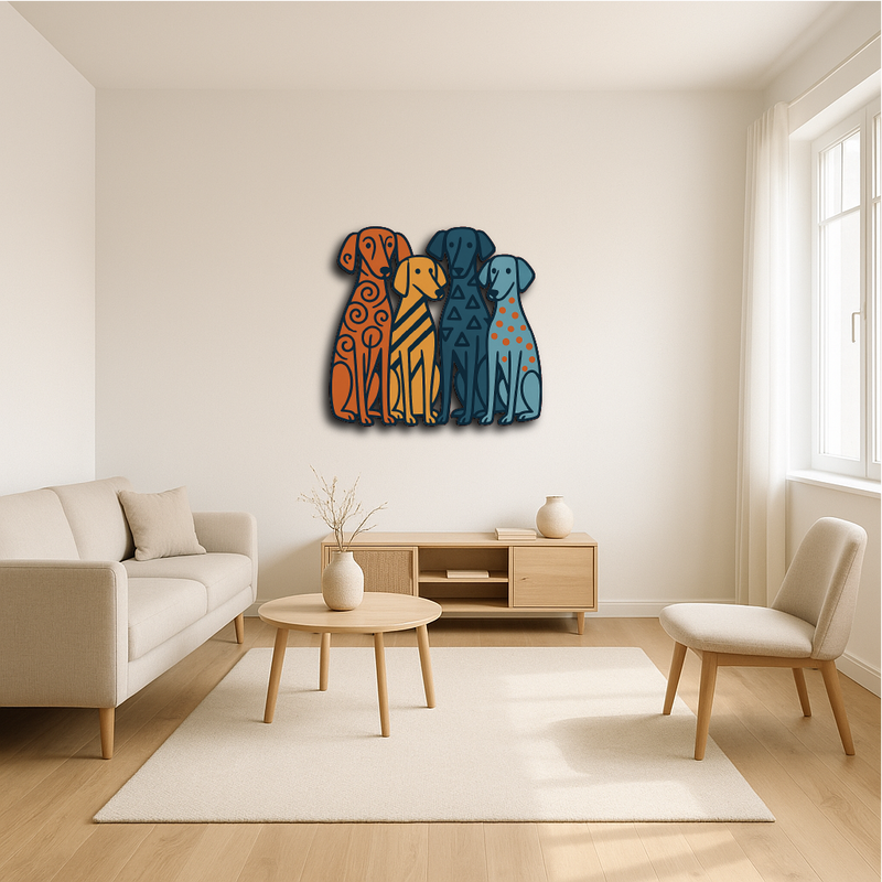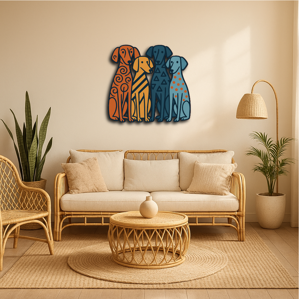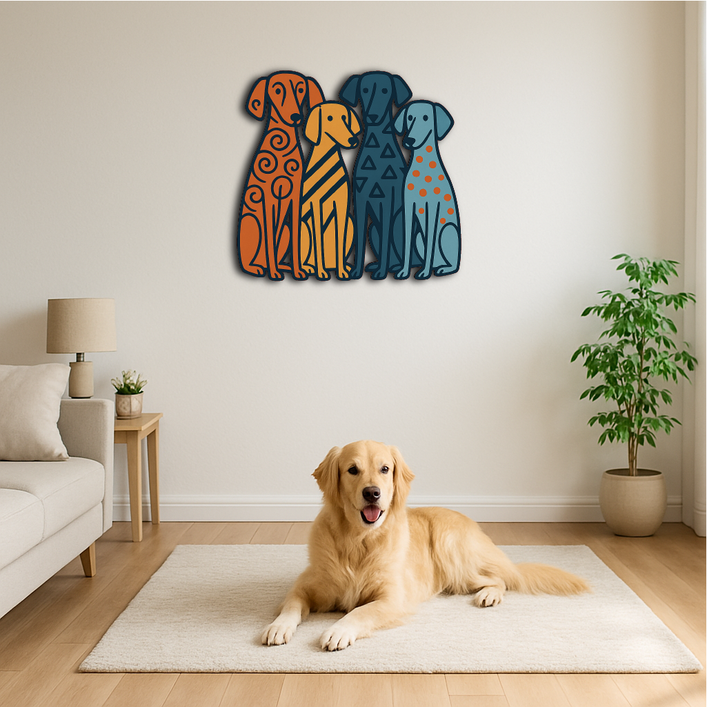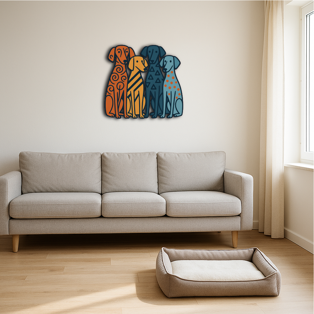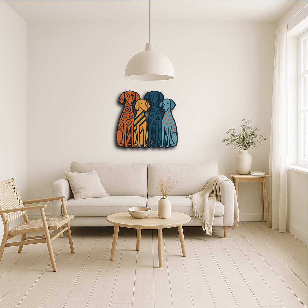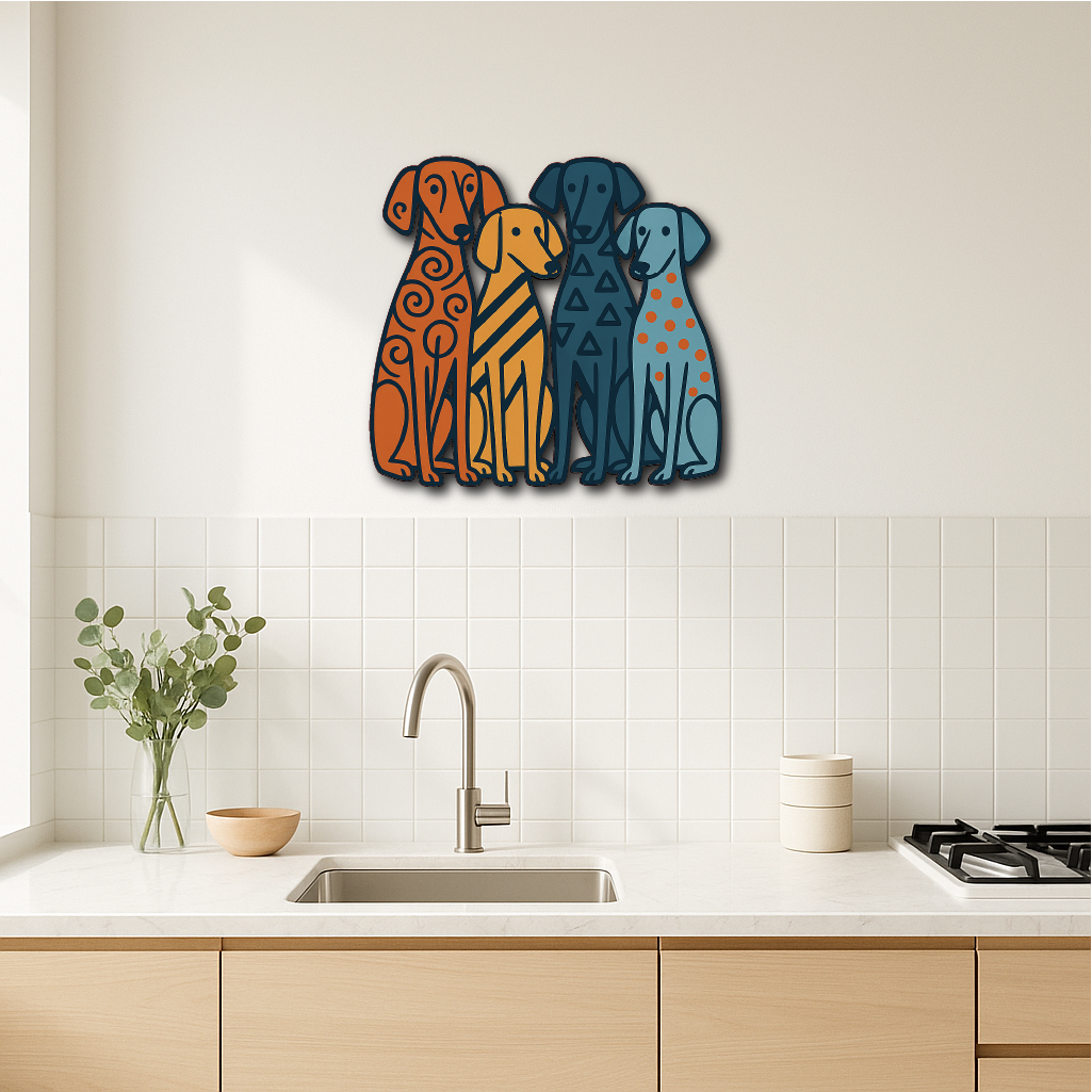 Celebrate your love for dogs with artistic flair through this Tribal Dogs Multicolor Metal Wall Art, featuring four sitting canines adorned with bold geometric patterns in orange, mustard, navy, and teal tones. Their upright poses and unique tribal markings add a stylish and expressive touch to any space — perfect for animal lovers and art enthusiasts alike.