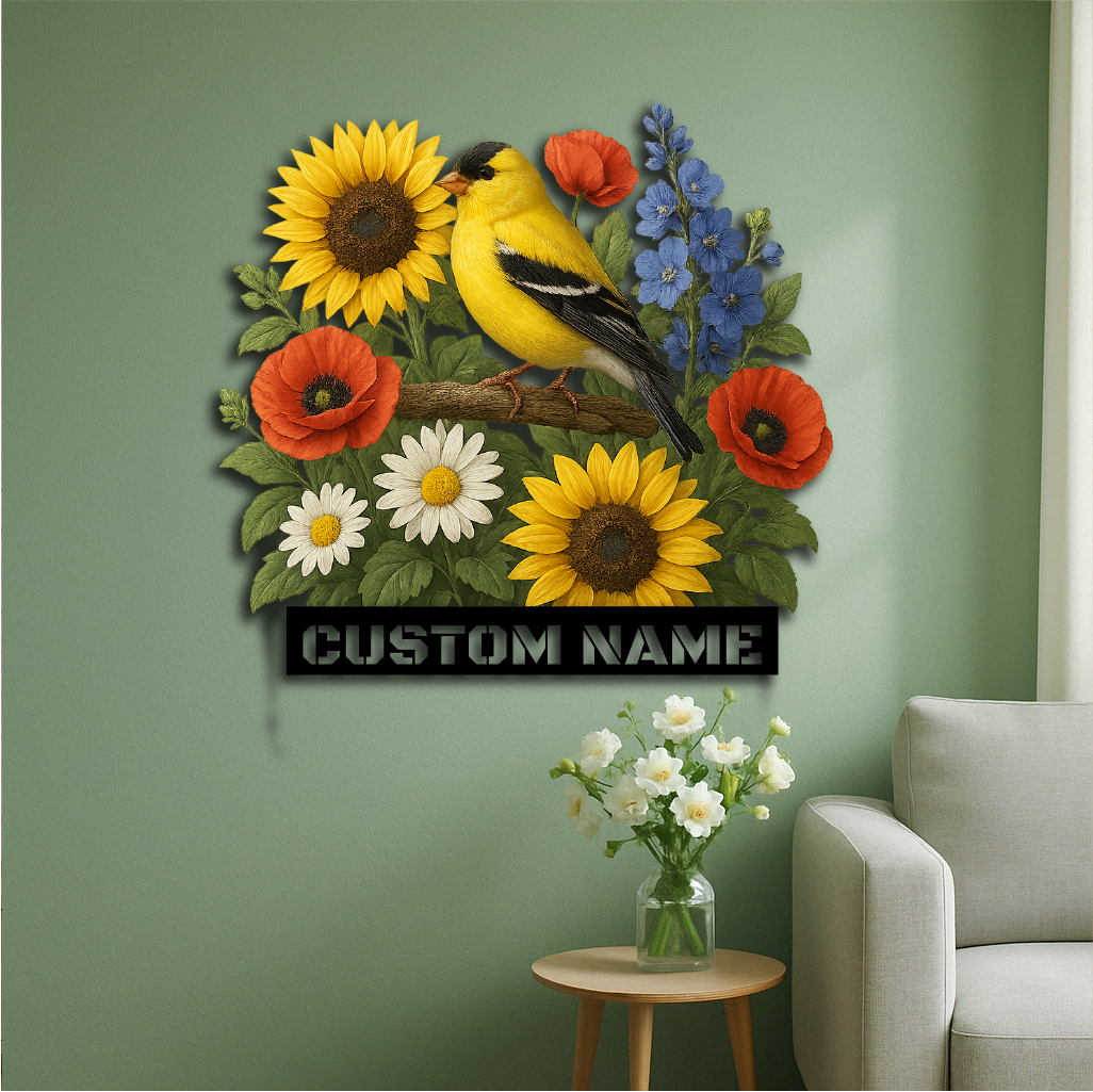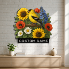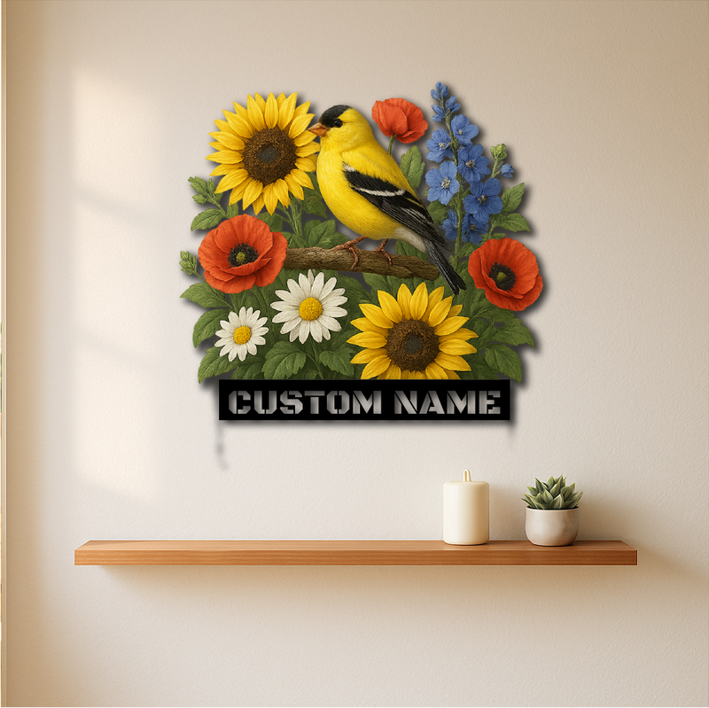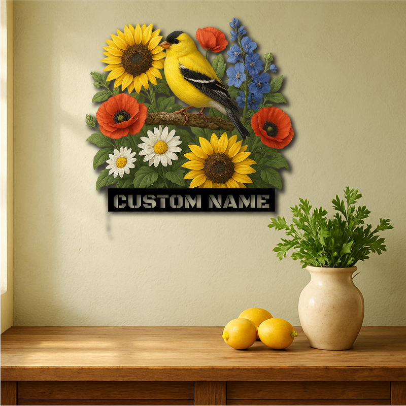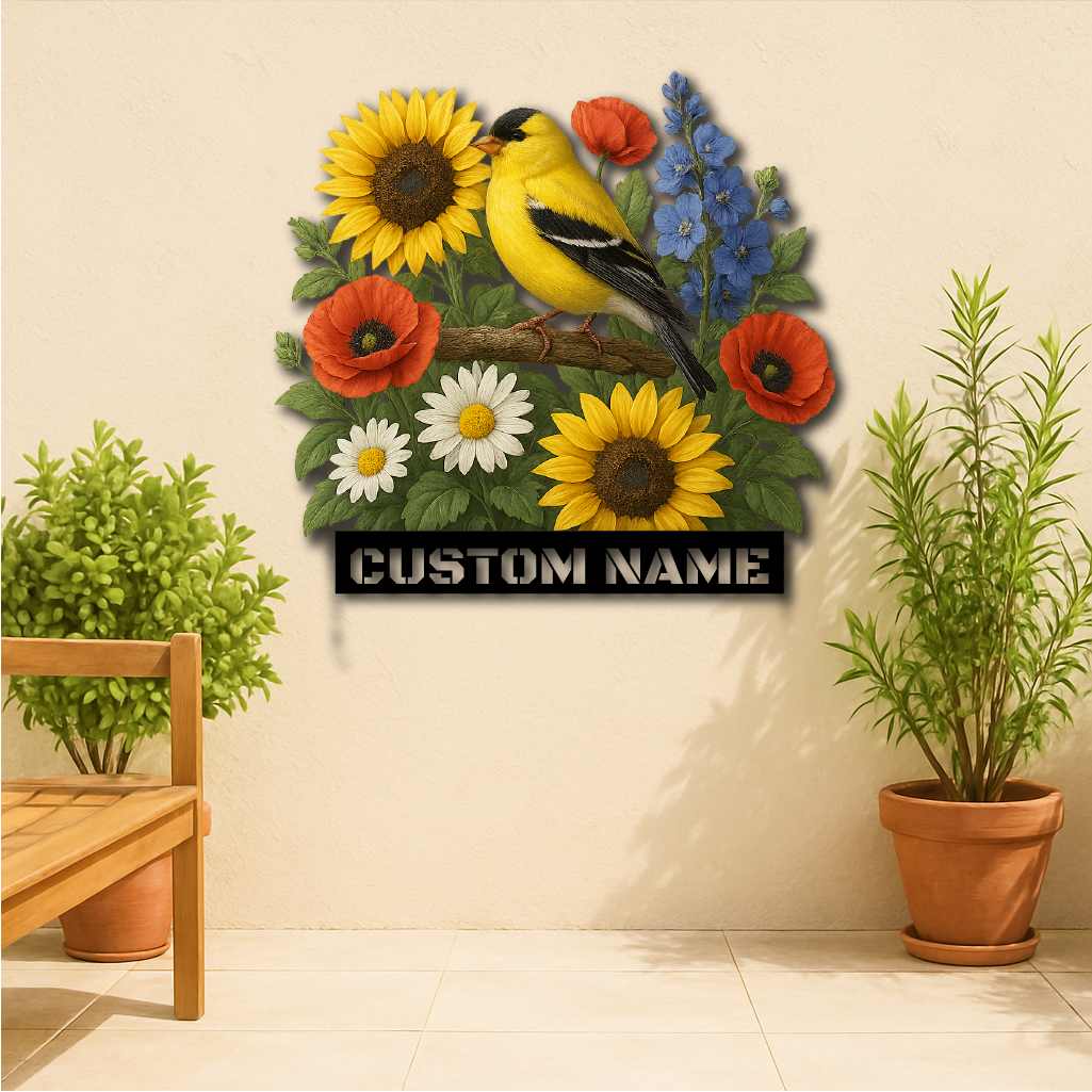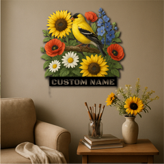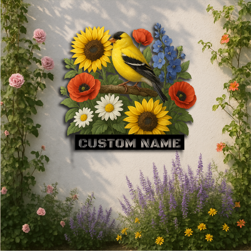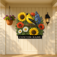 Add warmth and life to your garden with our Golden Bloom Haven personalized metal sign. This charming design showcases a radiant yellow goldfinch perched gracefully among vibrant sunflowers, daisies, bluebells, and scarlet poppies—each flower hand-painted in stunning multicolor detail.