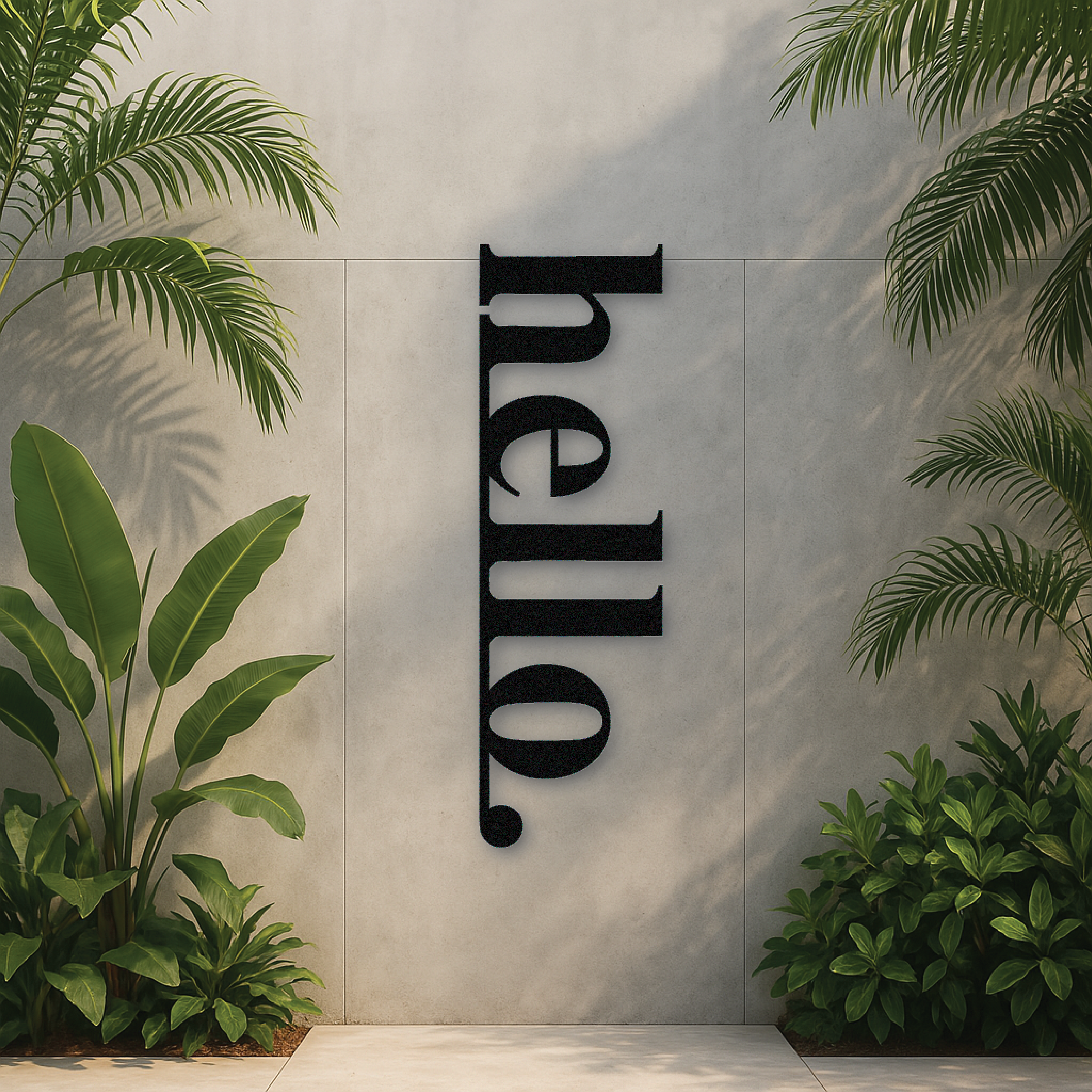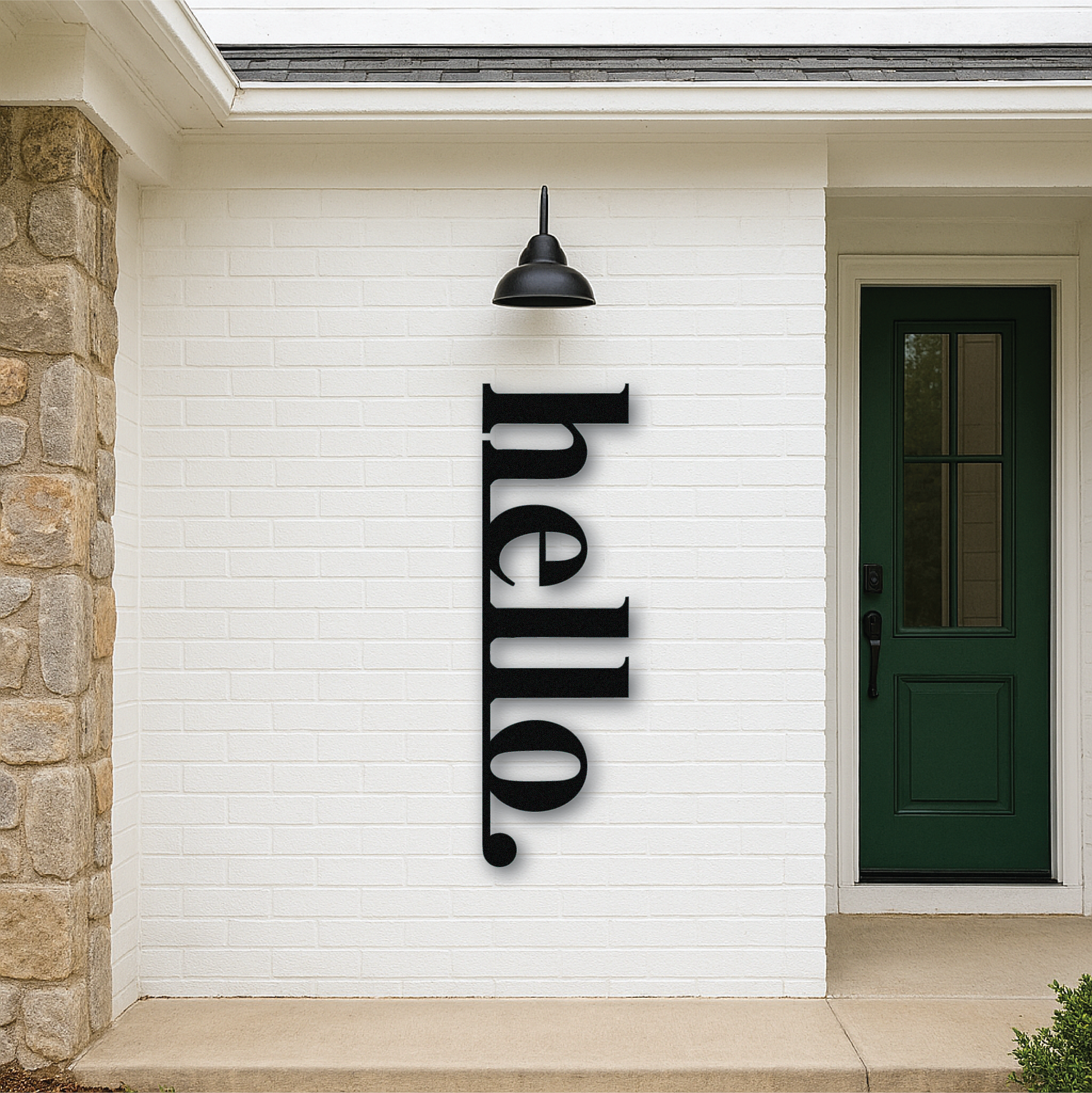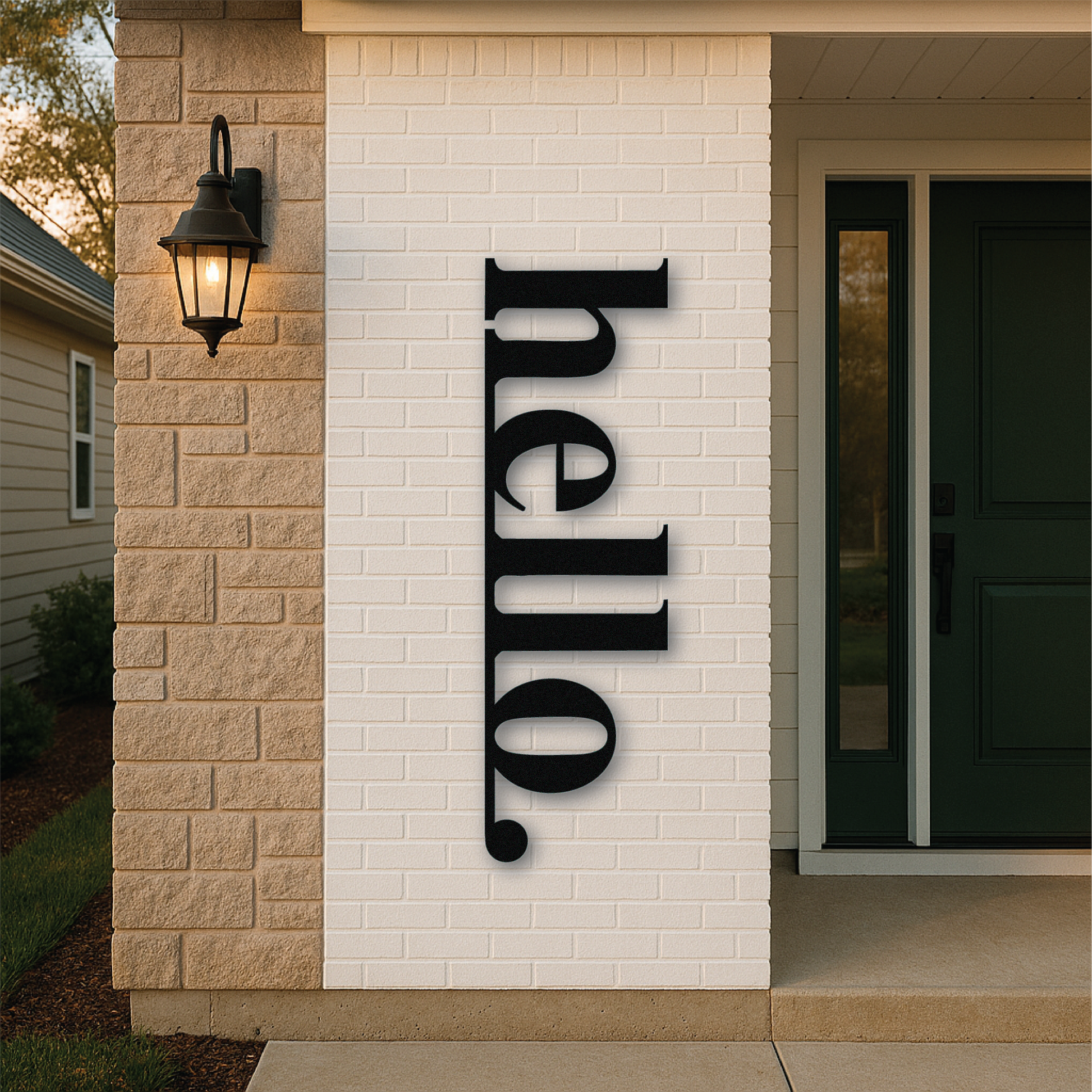 Make your guests feel instantly welcome with this bold and minimalist vertical “hello” metal sign — the perfect accent for your front porch, entryway, or patio wall. Featuring a clean, modern font and durable all-weather construction, this sign adds personality and charm to any home exterior.