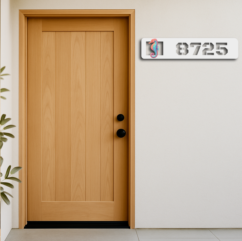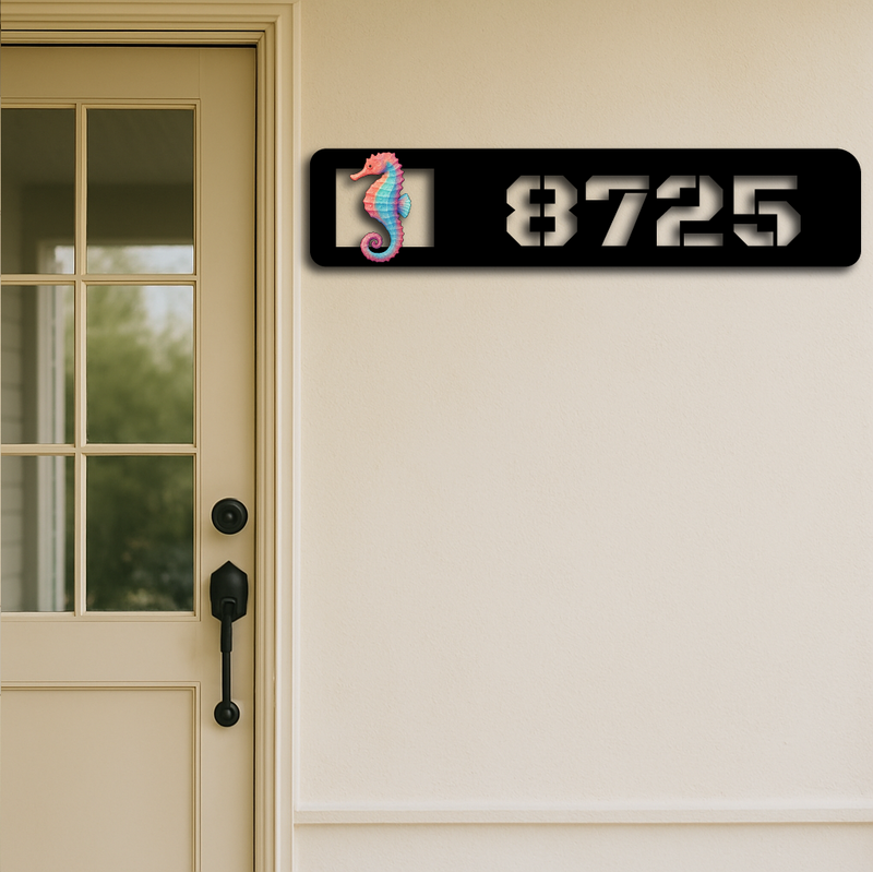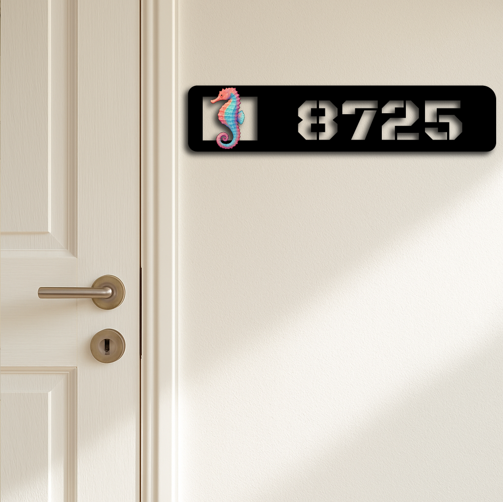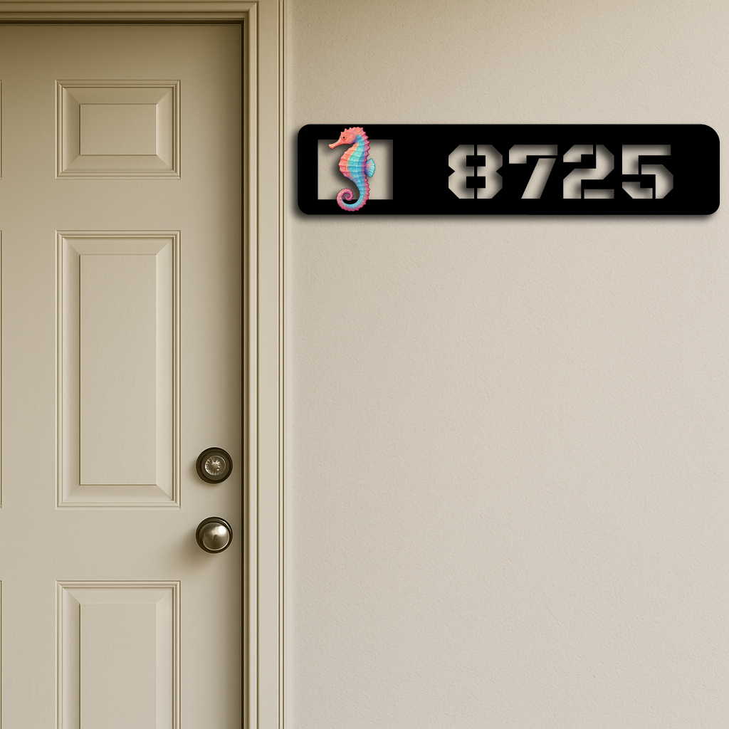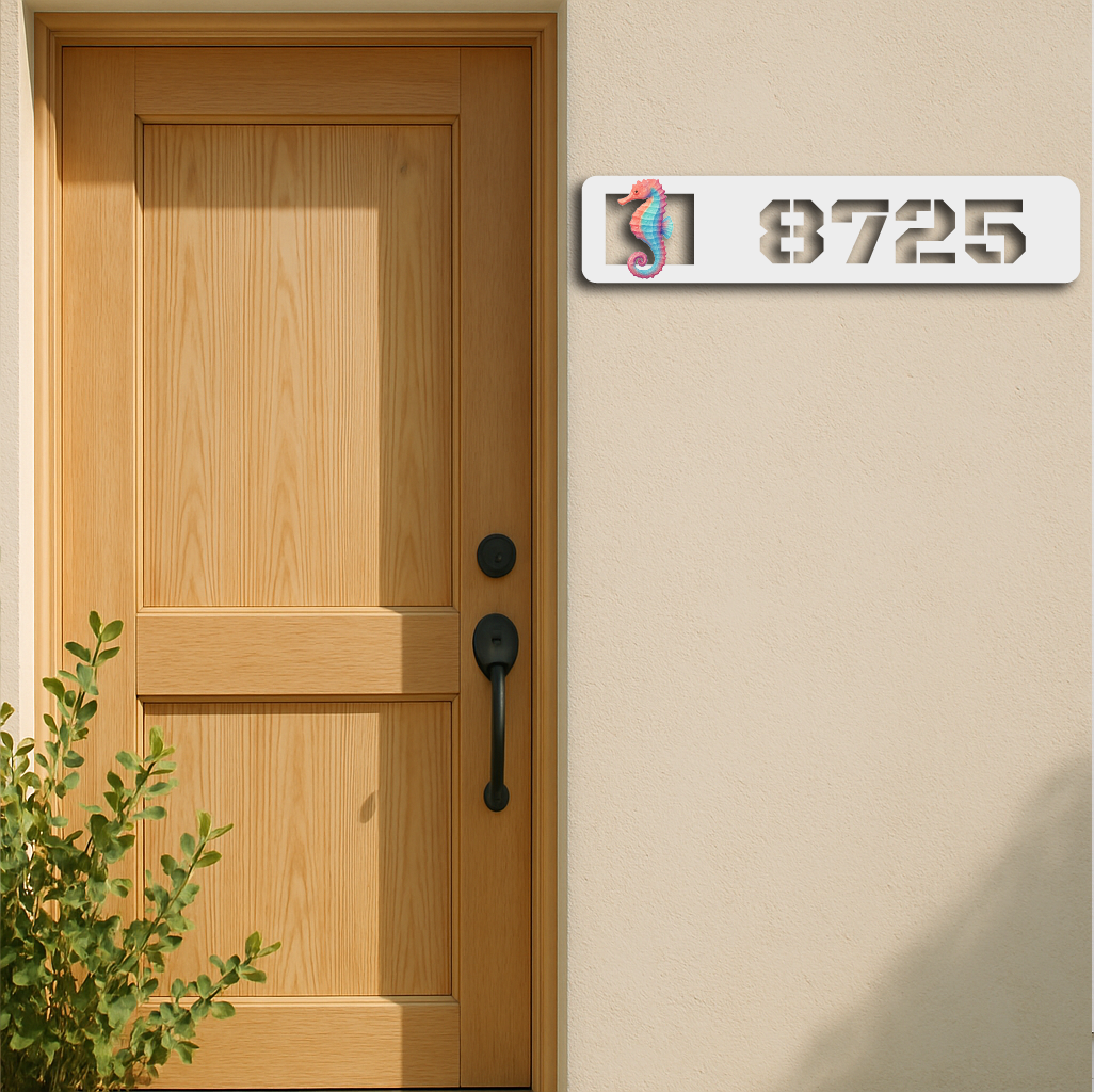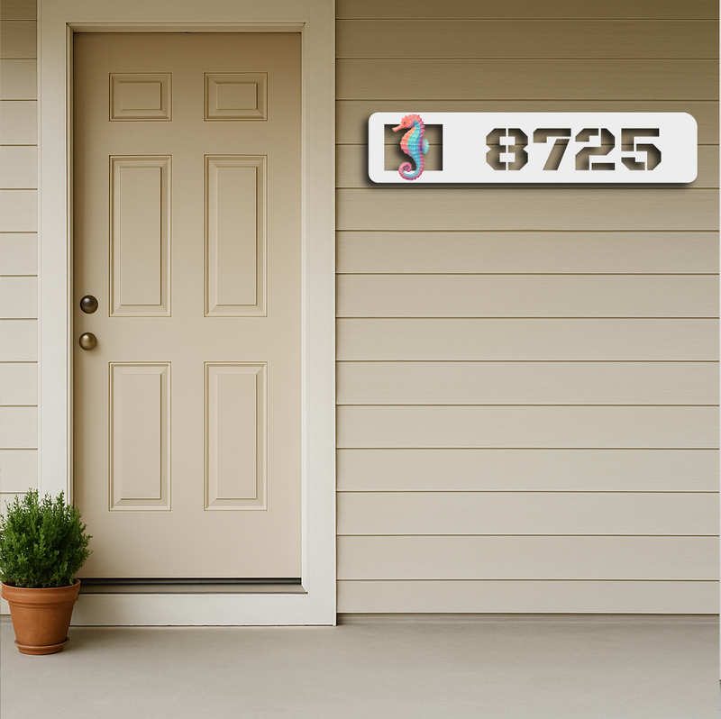 Add a touch of seaside charm to your home with this Seahorse-Themed Metal House Number Sign. Featuring a vibrant UV-printed seahorse and precision-cut address numbers, this plaque is perfect for beach houses, coastal cottages, or nautical-inspired spaces.