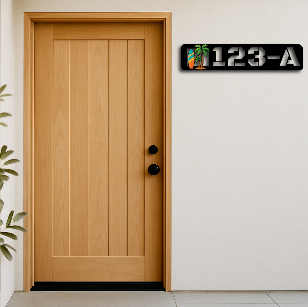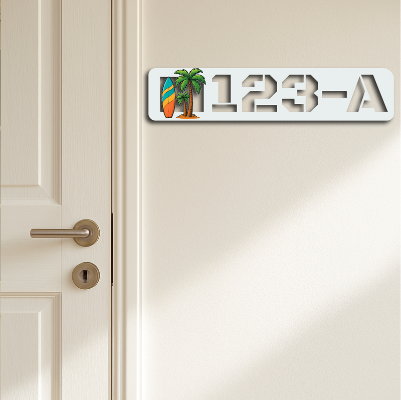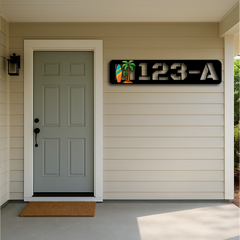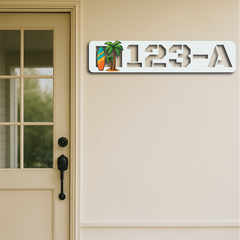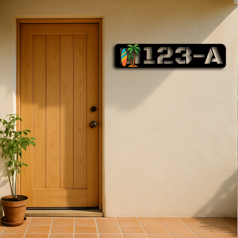 Bring a sunny, tropical vibe to your home with this Palm Tree & Surfboard-Themed Metal House Number Sign. Featuring colorful UV-printed palm trees and a retro surfboard design, paired with bold laser-cut numbers, this sign is perfect for any beach lover’s home, cottage, or vacation rental.